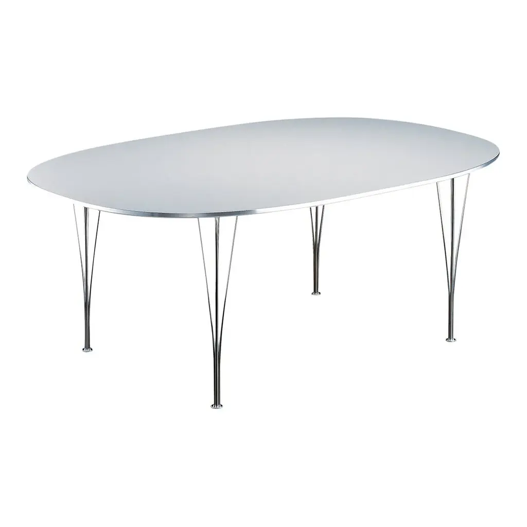The table series includes the Super-Elliptical, the Super-Circular, circular, square and rectangular tables designed by Piet Hein, Bruno Mathsson, and Arne Jacobsen. The most prominent member of the series, the Super-Elliptical table, was inspired by the designer Piet Hein's solution to a traffic problem at Sergels Torg in Stockholm: A super elliptical roundabout. The ingenious shape was conceived in his mathematical mind. This variation of an oval possessed some attractive qualities and looked surprisingly harmonious no matter the size. The formula based shape has no ends and this is why the Super-Elliptical table can be seen as a democratic table where everyone has an equal position. Bruno Mathsson and Arne Jacobsen contributed to the base design of all the tables. This version of the Super-Elliptical features detachable legs in powder coated steel, available in three different color options: White, Black or Grey.