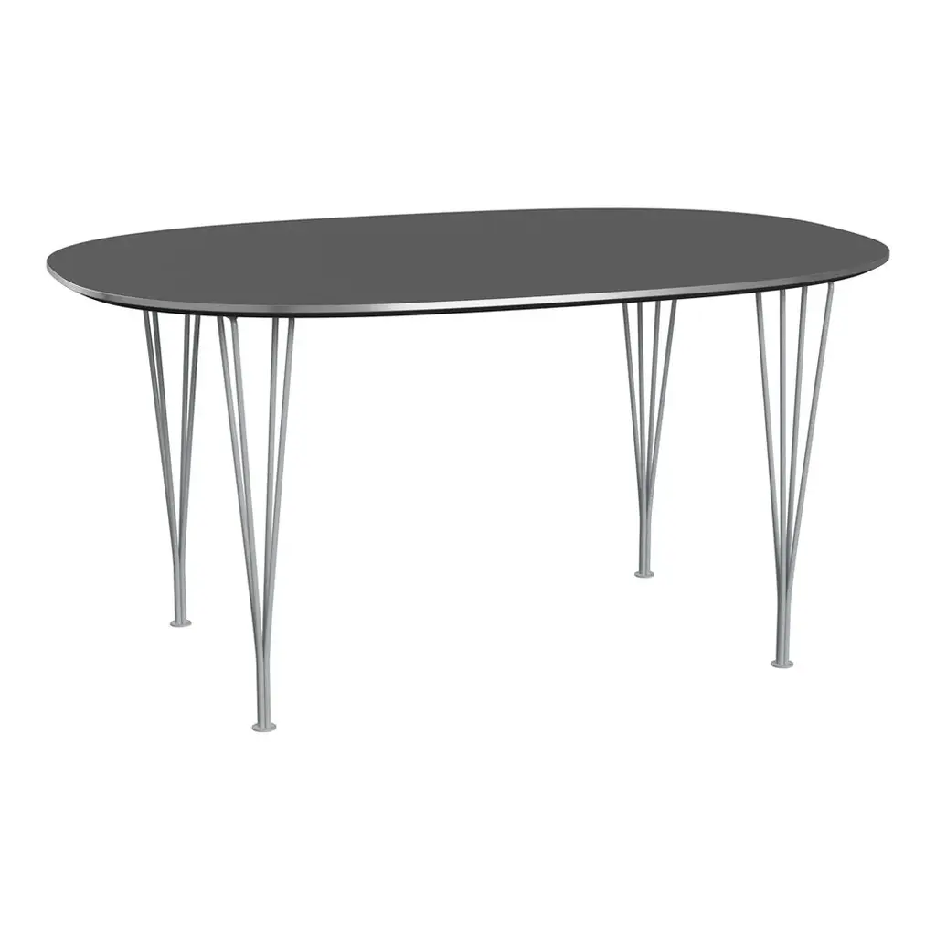 The table series includes the Super-Elliptical, the Super-Circular, circular, square and rectangular tables designed by Piet Hein, Bruno Mathsson, and Arne Jacobsen. The most prominent member of the series, the Super-Elliptical table, was inspired by the designer Piet Hein's solution to a traffic problem at Sergels Torg in Stockholm: A super elliptical roundabout. The ingenious shape was conceived in his mathematical mind. This variation of an oval possessed some attractive qualities and looked surprisingly harmonious no matter the size. The formula based shape has no ends and this is why the Super-Elliptical table can be seen as a democratic table where everyone has an equal position. Bruno Mathsson and Arne Jacobsen contributed to the base design of all the tables. This version of the Super-Elliptical features detachable legs in powder coated steel, available in three different color options: White, Black or Grey.