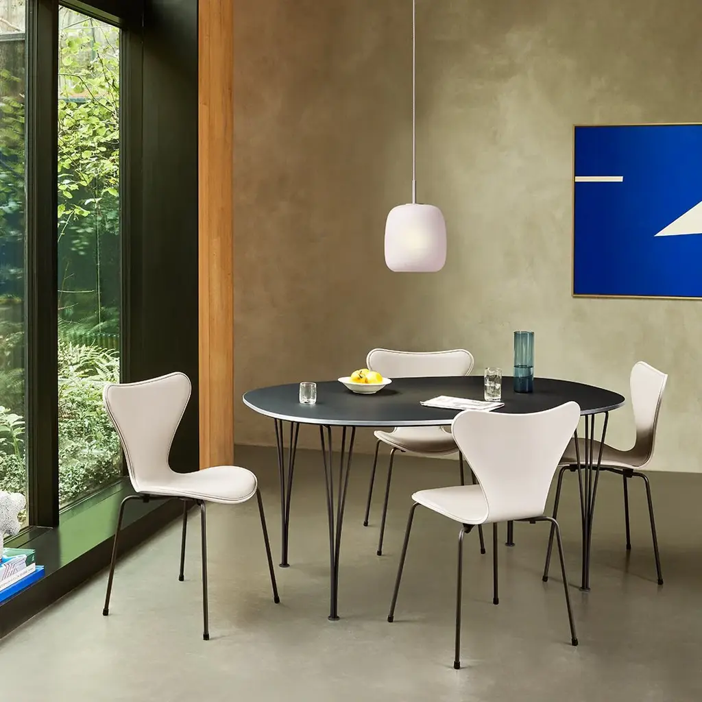 The table series includes the Super-Elliptical, the Super-Circular, circular, square and rectangular tables designed by Piet Hein, Bruno Mathsson, and Arne Jacobsen. The most prominent member of the series, the Super-Elliptical table, was inspired by the designer Piet Hein's solution to a traffic problem at Sergels Torg in Stockholm: A super elliptical roundabout. The ingenious shape was conceived in his mathematical mind. This variation of an oval possessed some attractive qualities and looked surprisingly harmonious no matter the size. The formula based shape has no ends and this is why the Super-Elliptical table can be seen as a democratic table where everyone has an equal position. Bruno Mathsson and Arne Jacobsen contributed to the base design of all the tables. This version of the Super-Elliptical features detachable legs in powder coated steel, available in three different color options: White, Black or Grey.