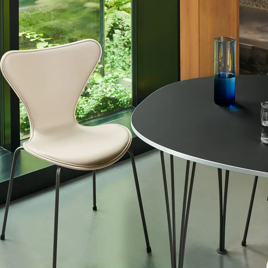 The table series includes the Super-Elliptical, the Super-Circular, circular, square and rectangular tables designed by Piet Hein, Bruno Mathsson, and Arne Jacobsen. The most prominent member of the series, the Super-Elliptical table, was inspired by the designer Piet Hein's solution to a traffic problem at Sergels Torg in Stockholm: A super elliptical roundabout. The ingenious shape was conceived in his mathematical mind. This variation of an oval possessed some attractive qualities and looked surprisingly harmonious no matter the size. The formula based shape has no ends and this is why the Super-Elliptical table can be seen as a democratic table where everyone has an equal position. Bruno Mathsson and Arne Jacobsen contributed to the base design of all the tables. This version of the Super-Elliptical features detachable legs in powder coated steel, available in three different color options: White, Black or Grey.