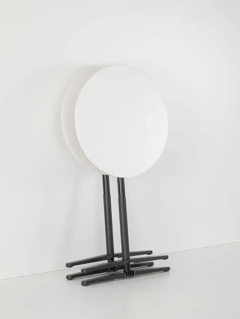 Museums, galleries, restaurants and similar institutions often require versatile tables that can be used in a variety of settings. Since such facilities tend to have limited storage space, a table type is needed that can be quickly and compactly stowed away and just as easily set up again. These needs are fulfilled to perfection by the Super Fold Table, making it an ideal choice for all meeting, event and food service locations where flexibility is key and furnishings are frequently rearranged in different layouts.The Super Fold Table folds up completely with a single movement of the hand. The mechanism not only tilts the table top into a vertical position but also simultaneously rotates and aligns the legs of the four-star base so that the whole table is reduced to a single plane just a few centimetres deep. The folding mechanism is activated by pulling on a recessed grip under the table top. The grip is easy to locate, thanks to a screw that discreetly marks its position on the corresponding side of the supporting column. Once folded, the recessed grip serves as a carrying handle, making it possible to transport the Super Fold Table with one hand.Materials:Table top: melamine faced in white with smooth straight plastic edge (19 mm), oak veneer (Europe) in natural or dark oak (19 mm) or solid core material with black edge (12 mm) in the colours white or black. Solid core table top in black with anti-fingerprint coating.Folding mechanism: die-cast zinc.Column: powder-coated steel in basic dark.Base: die-cast aluminium.