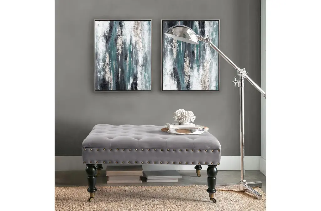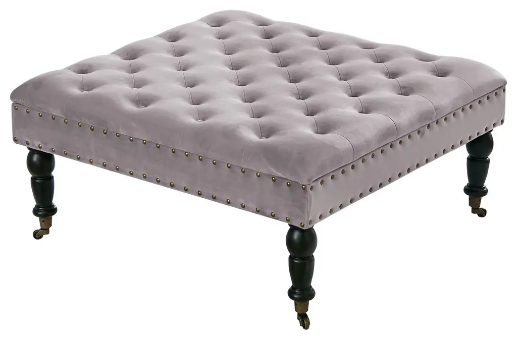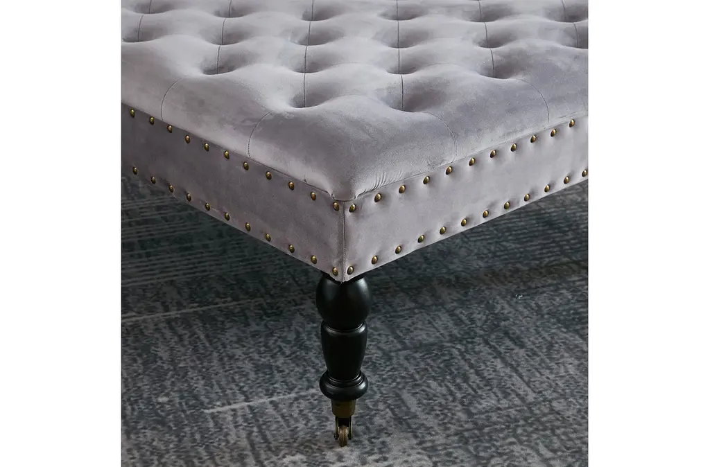 100% Polyester Supersoft Tufted Coffee Table Ottoman’s elegant and functional design offers a versatility that virtually suits any interior decor. With button tufting and polished brass nailhead accents, your new ottoman will create the wow factor you’re looking for. Each ottoman measures 18 x 33 x 33 inches and is available in numerous colors to suit your decorating needs. The black turned wood legs with brass caster wheels provide ultimate strength and durability to withstand up to 250 pounds. The set of 4 legs arrive in the zipper compartment under the ottoman cushion and require minimal assembly. No tools needed. Classy, unique, and fun these ottomans provide all your gift needs in one. Ottoman cushions are wrapped in protective plastic and placed directly into the shipping box. Constructed with a wood frame, foam cushion, and expertly upholstered in velvety, super soft fabric. Finished with double rows of polished brass nailhead accents, button tufting, and wooden carved legs. Spot clean ONLY using a clean, damp towel. When proper maximum weight capacity of 250 pounds is followed and proper care is conducted, your ottoman is built to last a lifetime. All Serenta brand fabrics are heat-treated for ultimate fade resistance and durability. *Certification is made by the manufacturer that materials in this article are described in accordance with the law.100% Polyester18” x 33” x 33”Button TuftingBlack turned wood legs with brass caster wheelsWood frame and foam cushioningStyle on a budgetPolished brass nailhead accent trim on all 4 sidesSet of 4 legs is in the zipper compartment under the ottoman cushionAvailable in numerous colorsWeight capacity of 250 poundsLegs require minimal assembly. No tools neededClassy, unique, and fun these ottomans provide all your gift needs in oneCushions are wrapped in protective plastic and placed directly into the shipping boxSpot clean ONLY using a clean, damp towelBuilt to last a lifetime with proper careHeat-treated for ultimate fade resistanceCertification is made by the manufacturer that materials in this article are described in accordance with the law