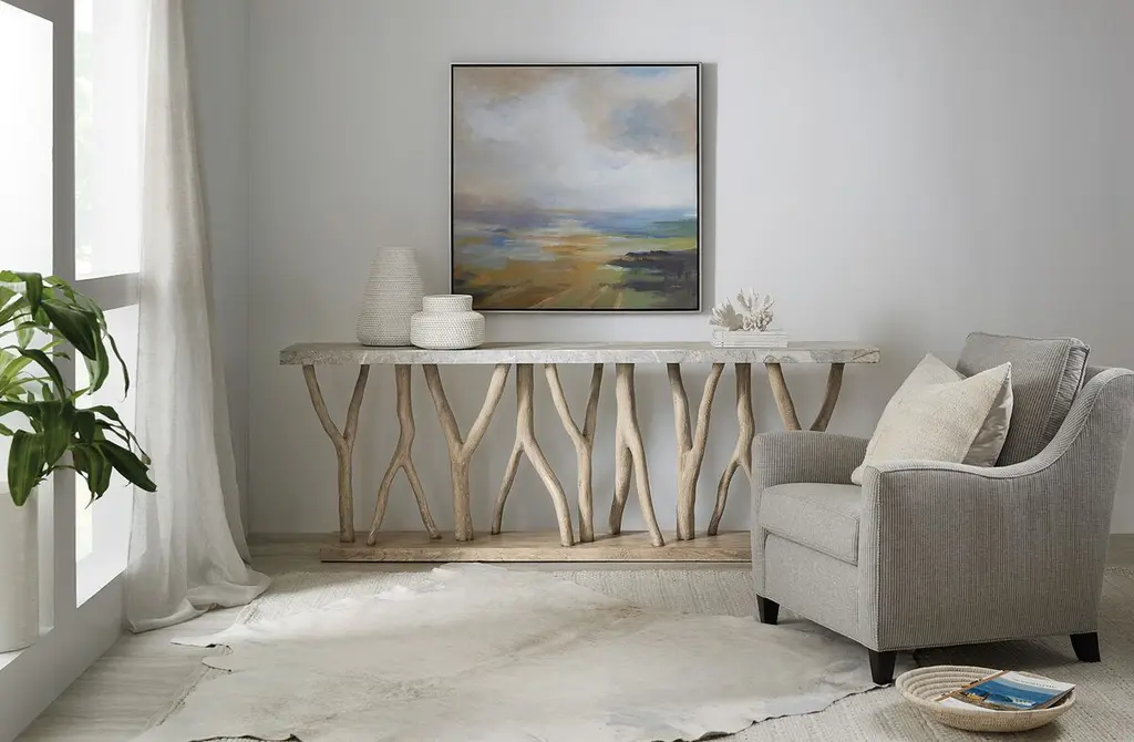 An artistic accent of organic elegance, the console table features a stone veneer top and a tree branch motif base, with the base crafted of Pecan Veneers in a light-and-airy wood finish.