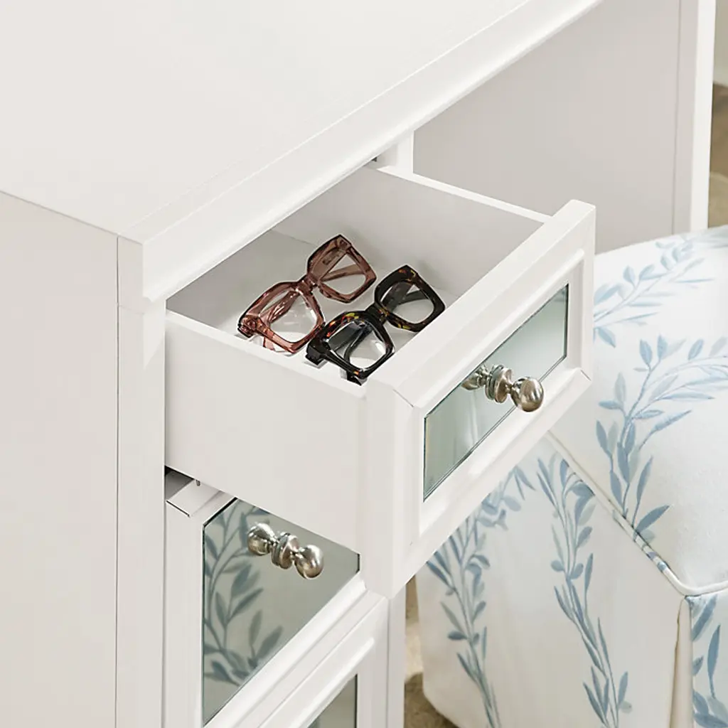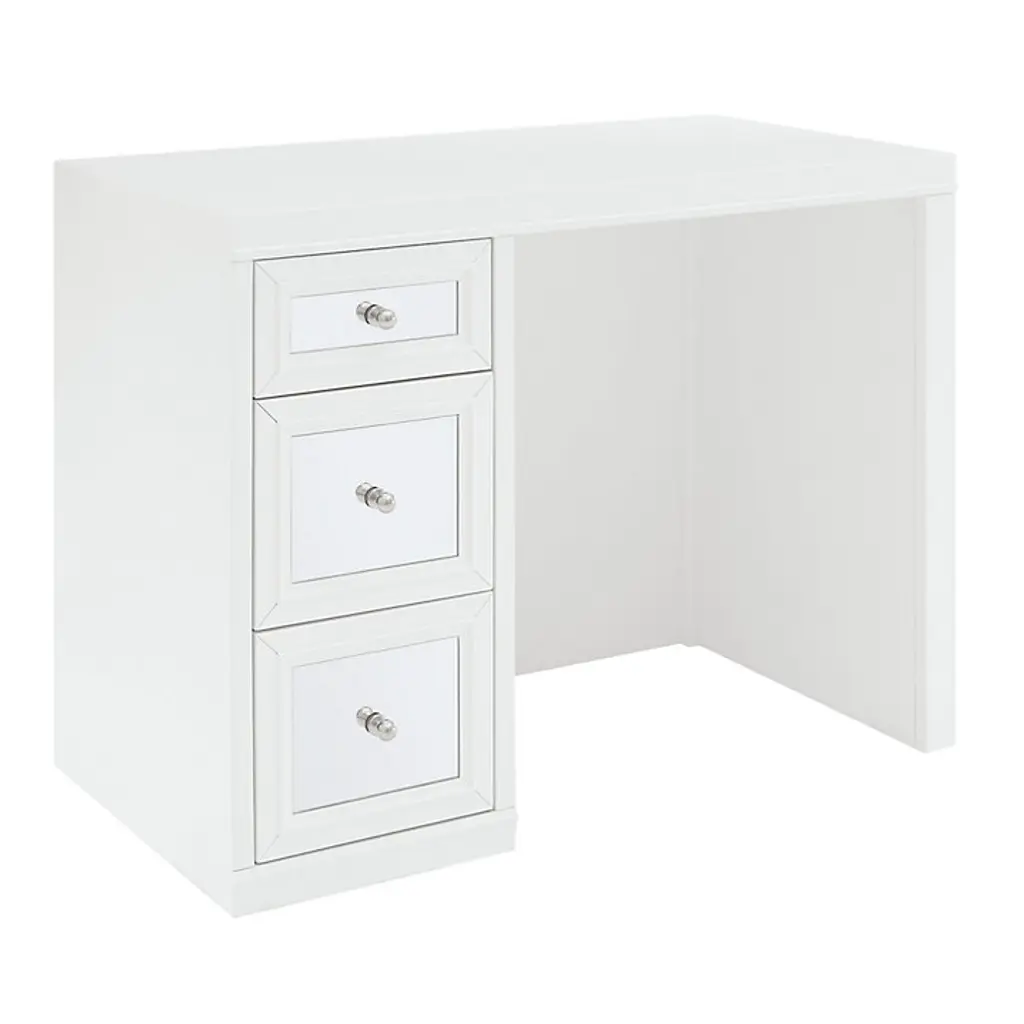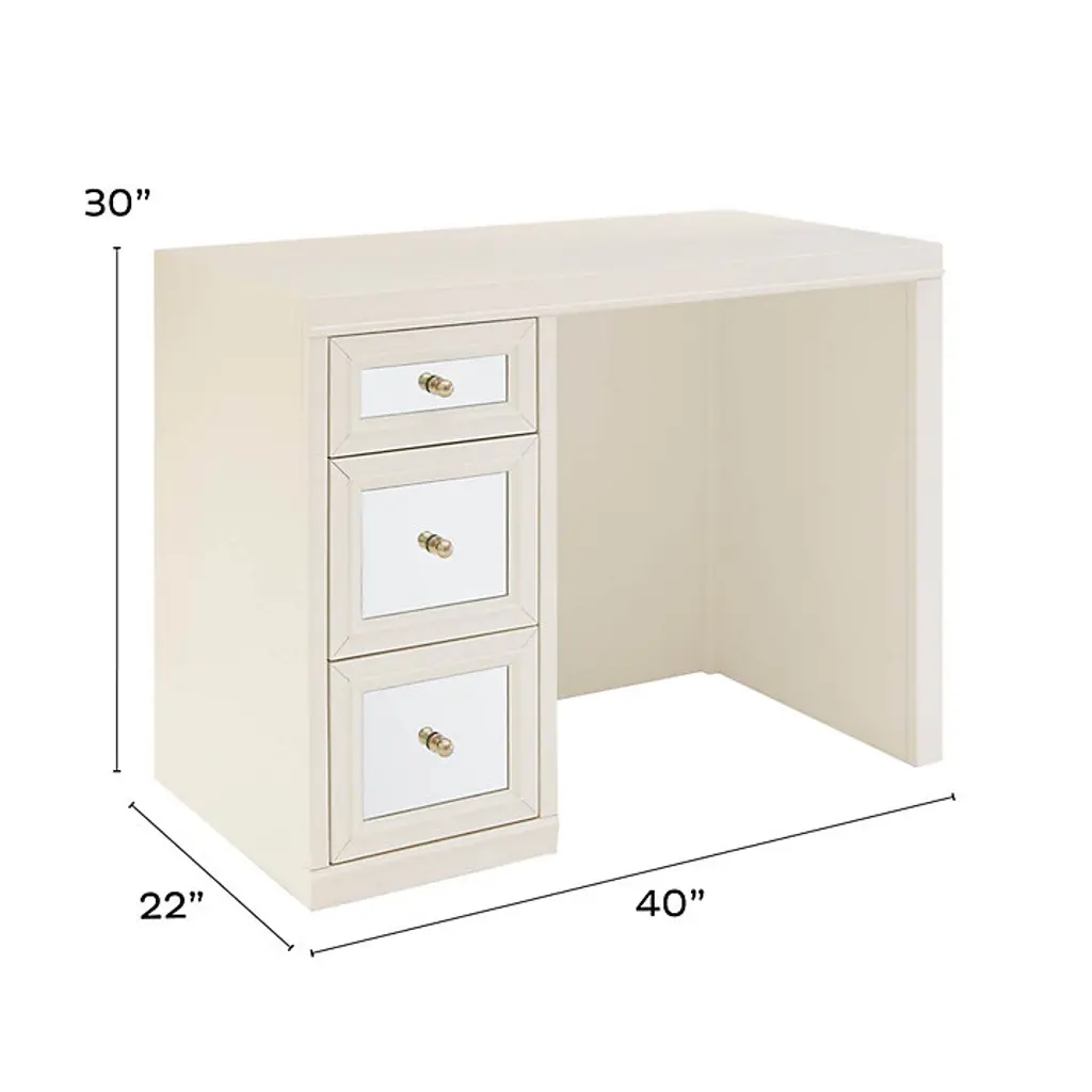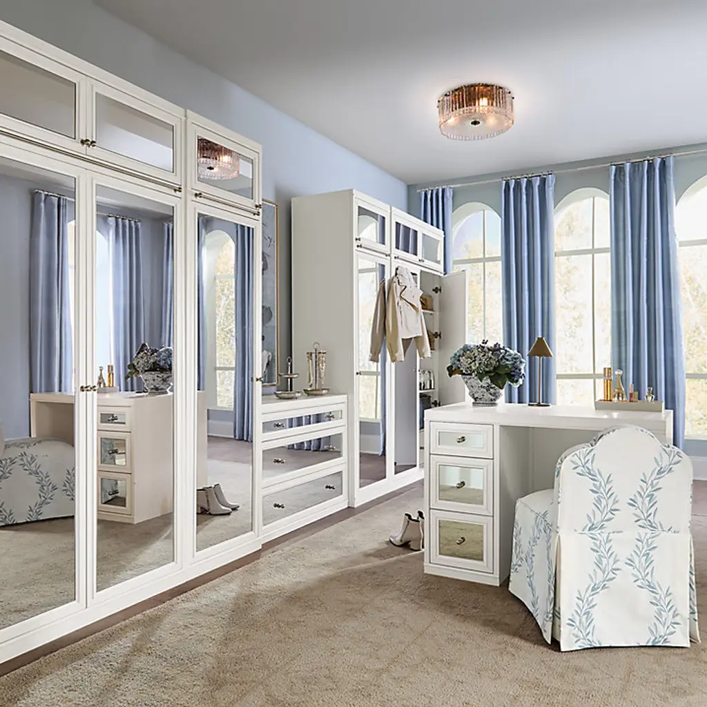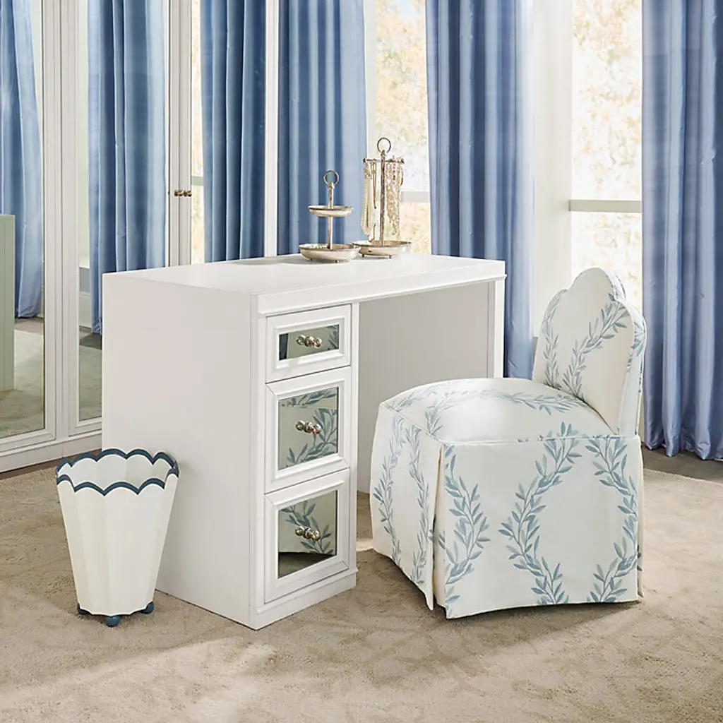 This chic closet system by designer Suzanne Kasler was inspired by one of her client's custom-built, mirrored dressing room. "Each piece is designed to be modular, so you can select pieces based on the size of your space and needs, ensuring a custom feel," Suzanne notes. Cases are finely crafted of hardwood with fresh white finish, clear mirrored drawer fronts, and tailored bead details. Sides are flush, so you can add as many Corrine pieces as you need to create an elegant wall of reflected light and bespoke storage. The 3-Drawer Table stands alone as a vanity, between Corrine Armoires or Closets, or back-to-back with the 3-Drawer Dresser to create a dressing island. Petite knob pulls are hand finished in warm nickel to complement the timeless look. Suzanne Kasler Corrine 3-Drawer Table features: