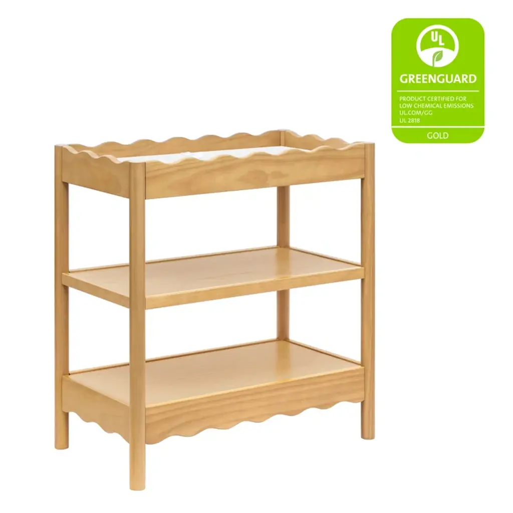 With rounded posts and wave-like edges, the Swell Changing Table has a modern appeal with an ocean-inspired design that pairs perfectly with your Swell Crib. It features two spacious, open shelves to keep all your baby’s diaper changing needs within easy reach for convenient changings.