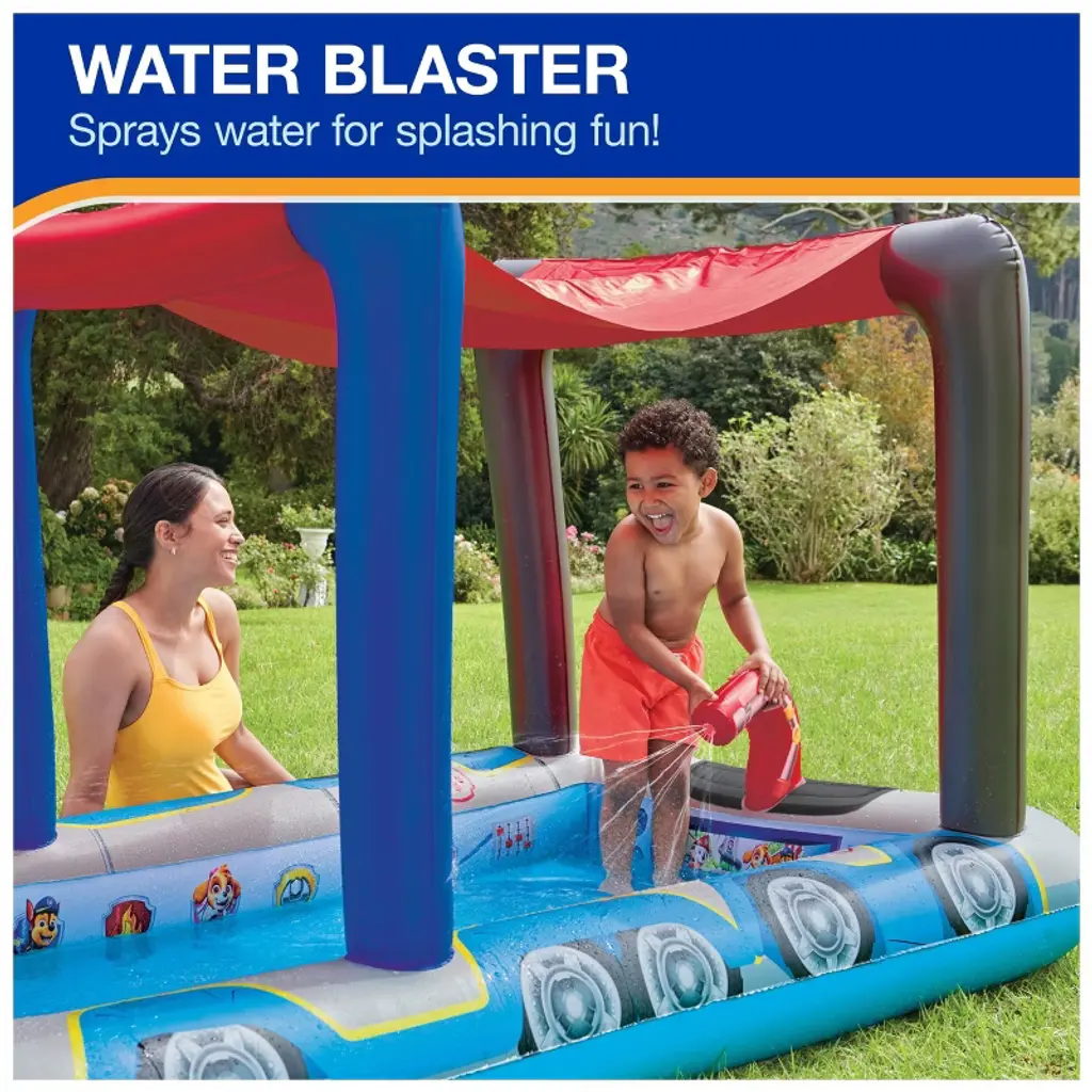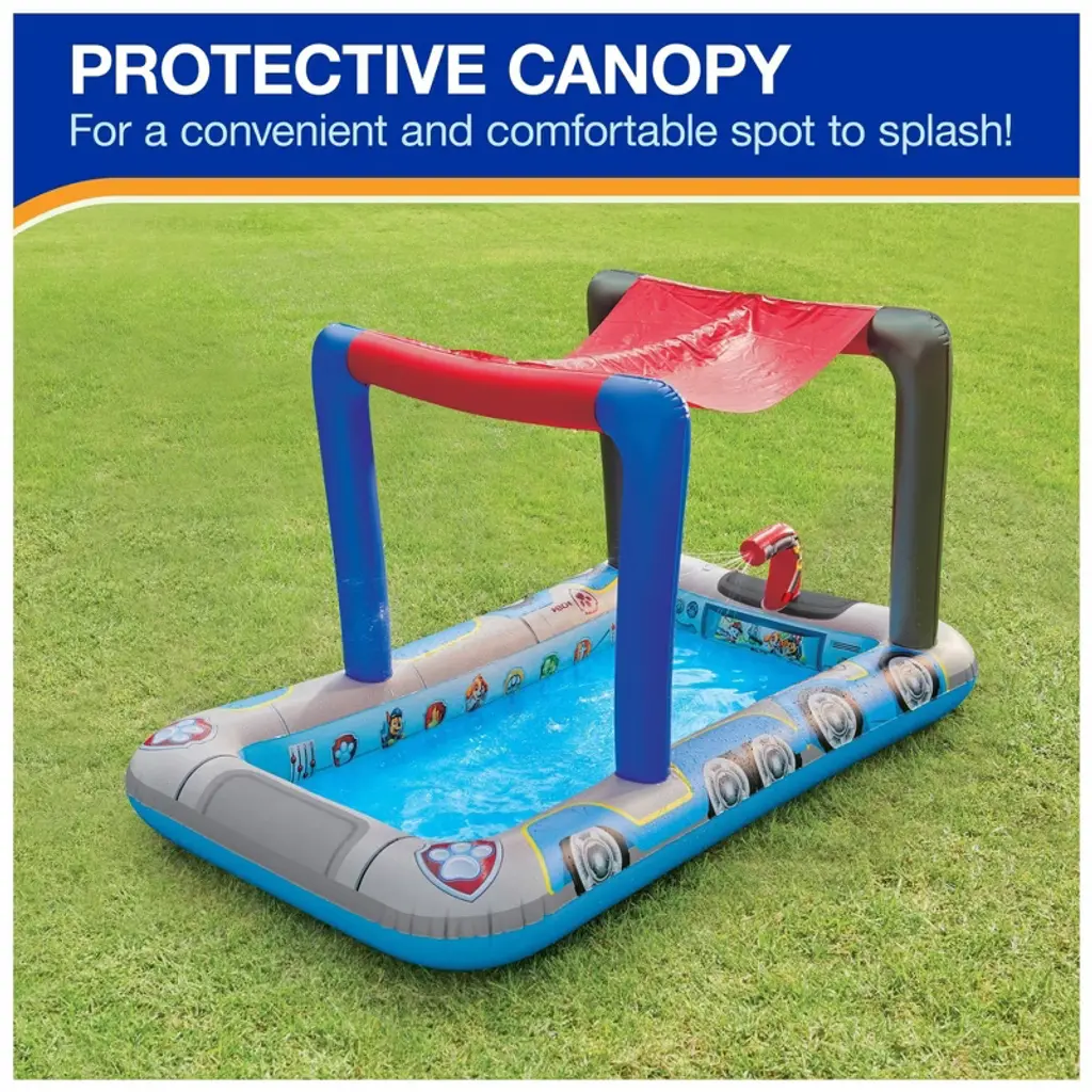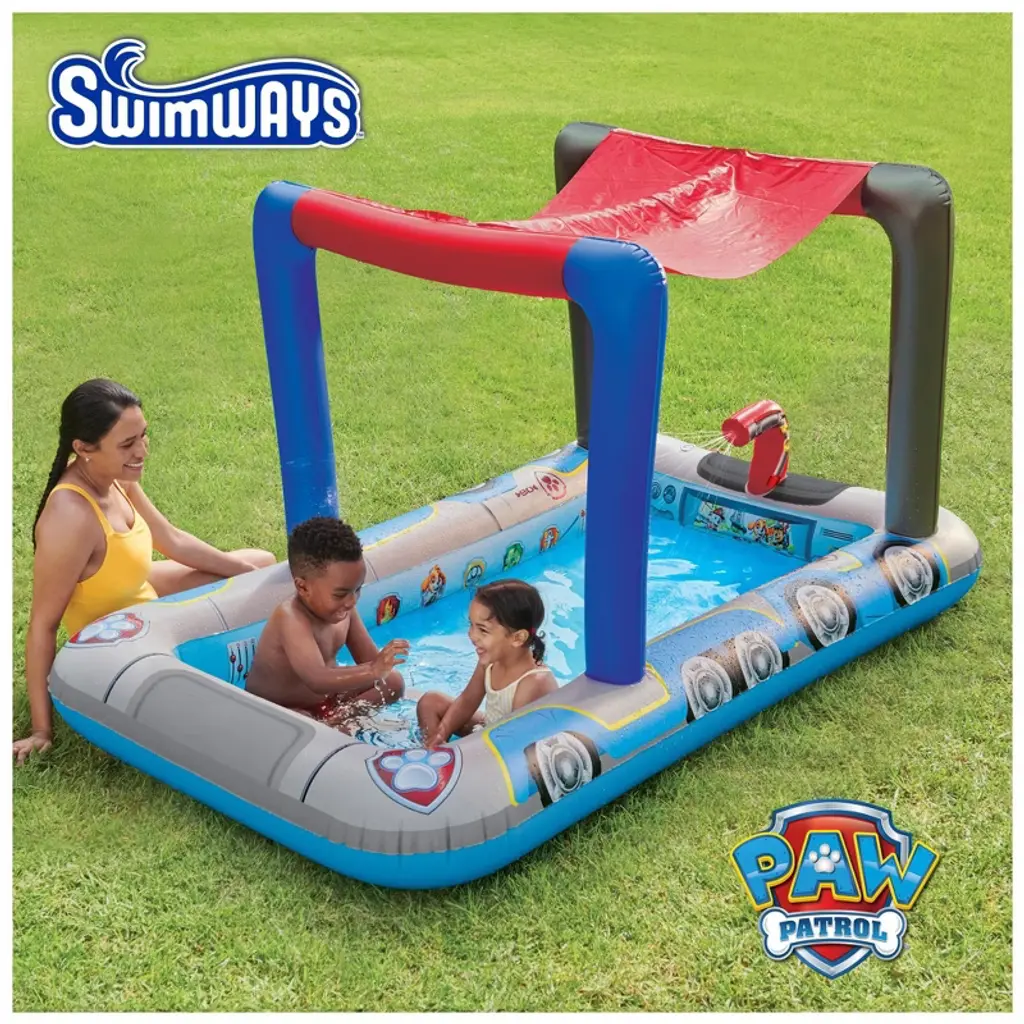 Make a splash with your child’s favorite rescue pups in the SwimWays Paw Patrol Pool Patroller Deluxe Inflatable Pool! Designed for endless backyard fun, this themed pool features all the beloved characters from Paw Patrol and comes fully equipped with a built-in water slide and water Blaster to transform any yard into a mini aquatic adventure. Thanks to the Hyper-Flate Valve, this inflatable pool offers ultra-fast inflation—up to 3x faster than traditional valves—with no pump needed. A convenient quick-fill and drain valve makes water changes easy and hassle-free, while the built-in canopy provides sun protection, allowing kids to enjoy hours of play even on hot summer days. With a safe, inviting design, this deluxe kiddie pool is the perfect way to introduce young children to water play in comfort and style. Let the Paw Patrol pups lead the way to unforgettable backyard adventures—just add water and your little hero’s imagination! Always supervise children closely when the pool is in use.