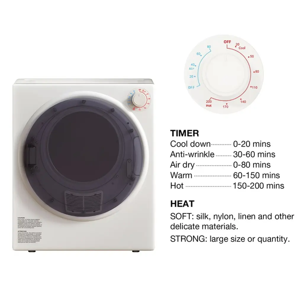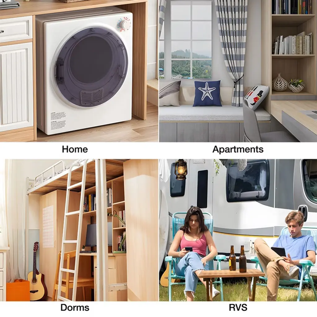 Upgrade your laundry routine with our compact and energy-efficient portable dryer for laundry, designed for small families and space-saving living. This compact dryer machine combines fast drying performance with low energy consumption, making it ideal for daily use. Choose from five tailored drying modes—Cold Dry (0-20 minutes), Wrinkle Free (30-60 minutes), Air Dry (0-80 minutes), Warm Dry (60-150 minutes), Hot Dry (150-200 minutes)—to gently care for different fabrics while effectively removing odors. Engineered for quiet operation (only 58-62dB), this drying machine won't disrupt your conversations or sleep. Its high-strength, corrosion-resistant shell and durable plastic door ensure long-lasting use without rust or deformation. The stainless steel diamond-patterned drum minimizes wear, enhances drying efficiency, and ensures even heat distribution for soft, fluffy clothes every time. Flexible installation options—wall-mounted, stacked, or freestanding—let you fit it seamlessly into small spaces like apartments or rental homes. With a 170° wide-opening door, loading and unloading laundry is effortless.