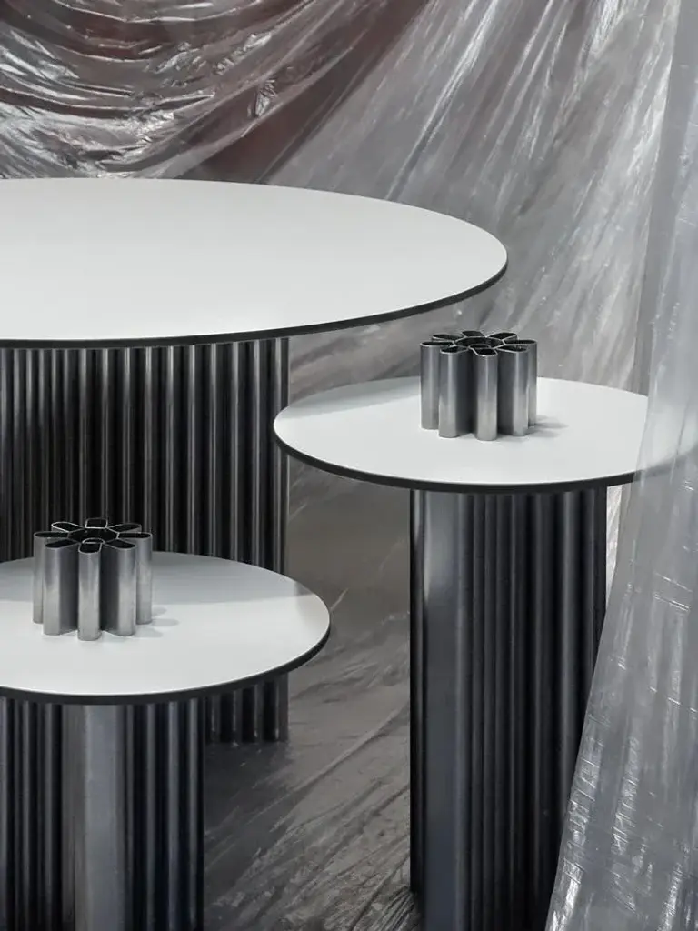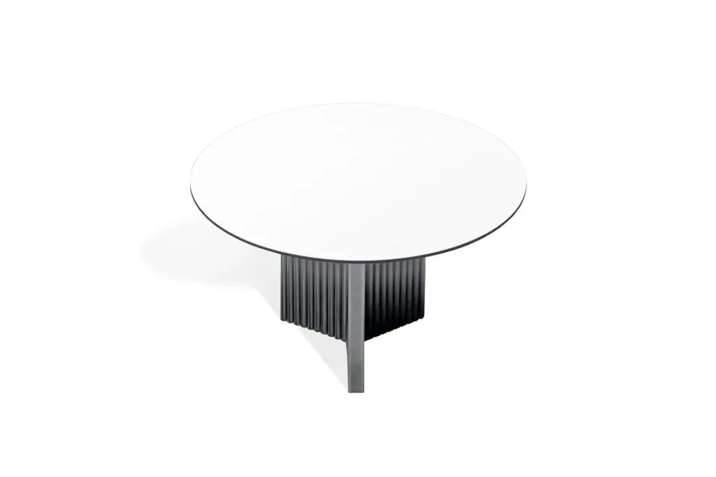 The T–T03 is one of the most iconic products by Temper. A wide and eccentric-looking table characterized by a 3-pointed star shaped central leg. The orientation of the table around its own axis generates ever-new shapes and perspectives that blend with the domestic spaces. The table top is made entirely of Fenix®, a revolutionary high-quality material, extremely resistant to scratches, low light reflectivity, anti-fingerprint surface and a soft-touch feeling. All Temper products are made of raw pickled iron and are provided with a transparent or colored matte finish base. Labeled by Maker