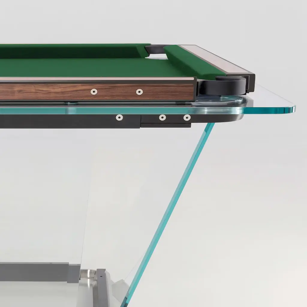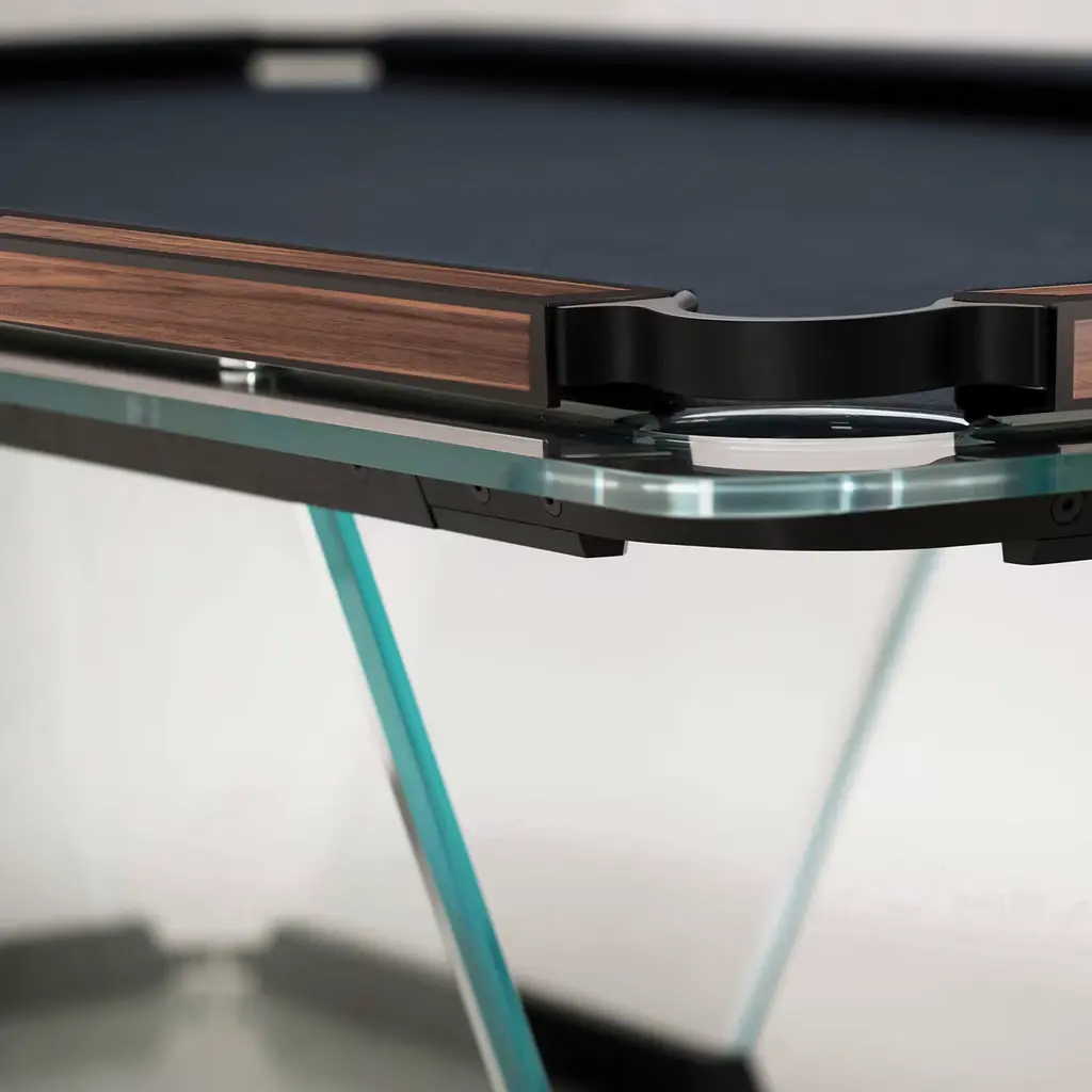 Teckell T1.3 is as solid as it is sleek. A classy reinterpretation of the traditional pool table, a statement piece for a truly sophisticated game room. Each table was created using only computer numerical control (CNC) machines which ensure unrivaled precision. Legs made of clear tempered crystal at least 9/16” thick with double-bevel edges. Playing field made of a single sheet of tempered crystal at least 9/16” thick. This product is available in 8ft and 9ft. The rails are made of aluminium with Canaletto walnut wood finish. Simonis® 860 worsted wool playing surface, available in 25 colors.