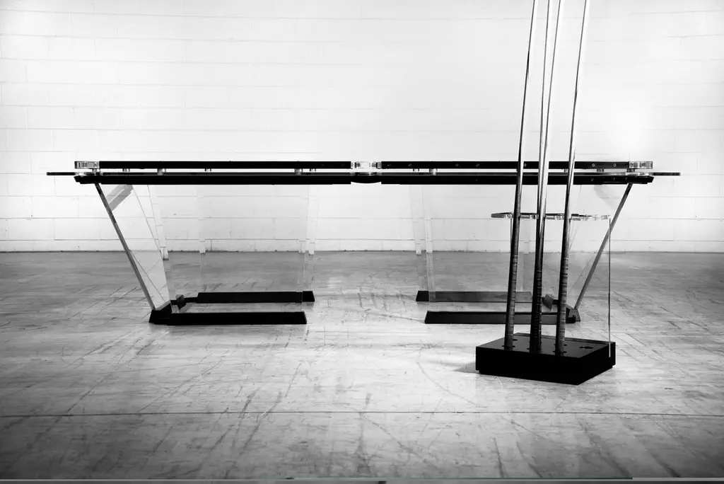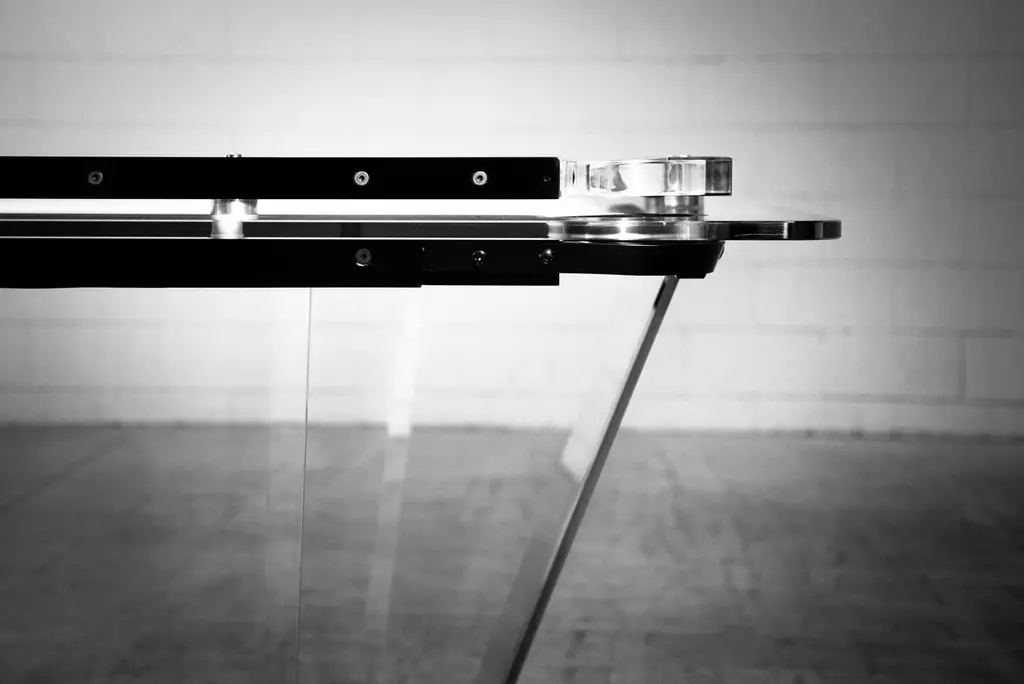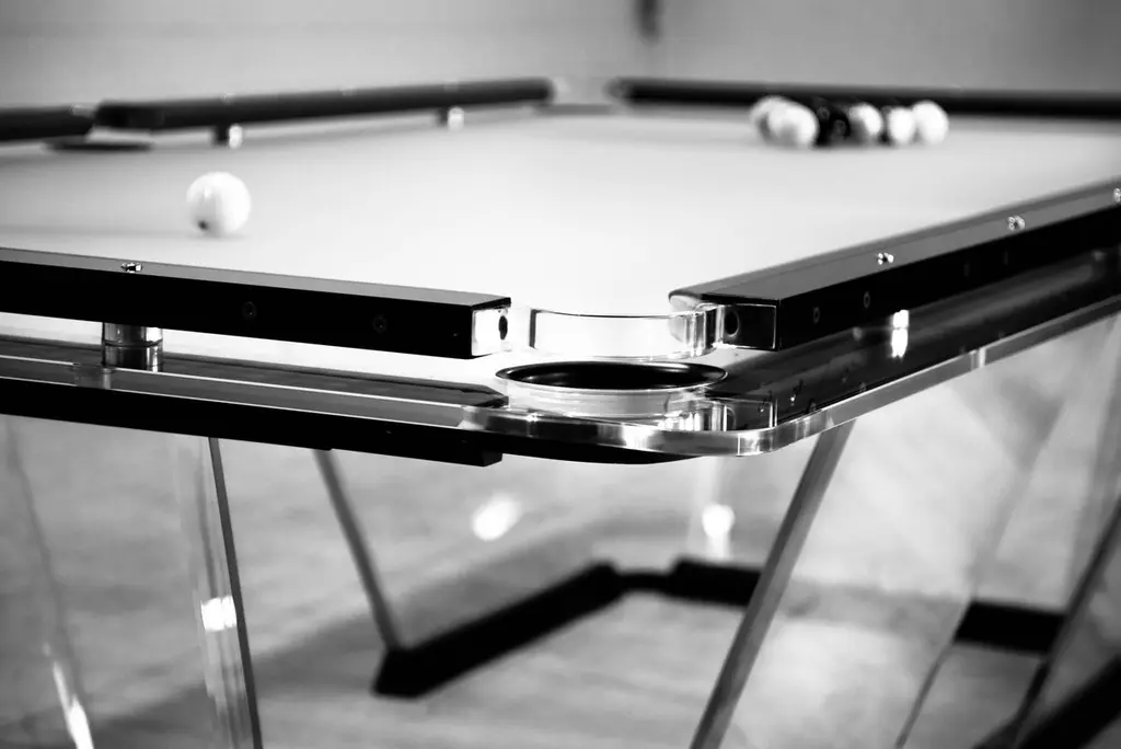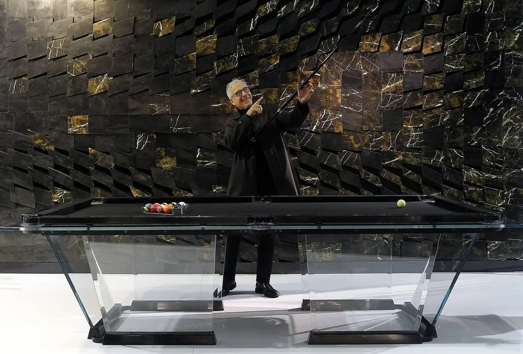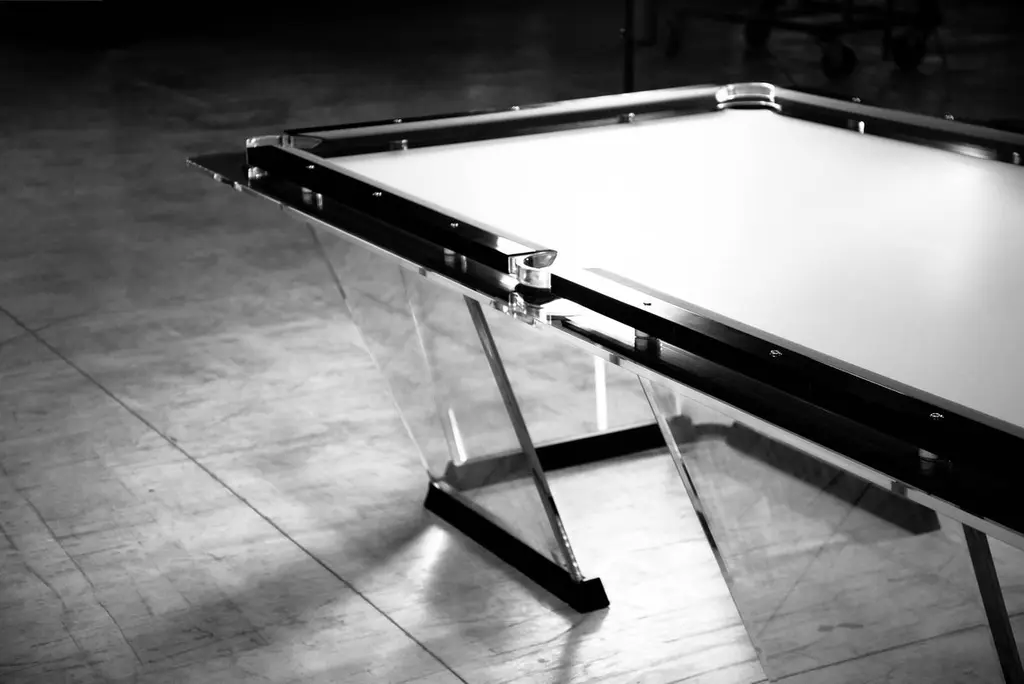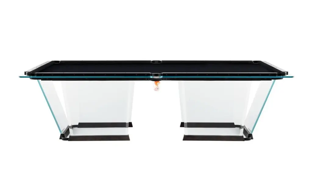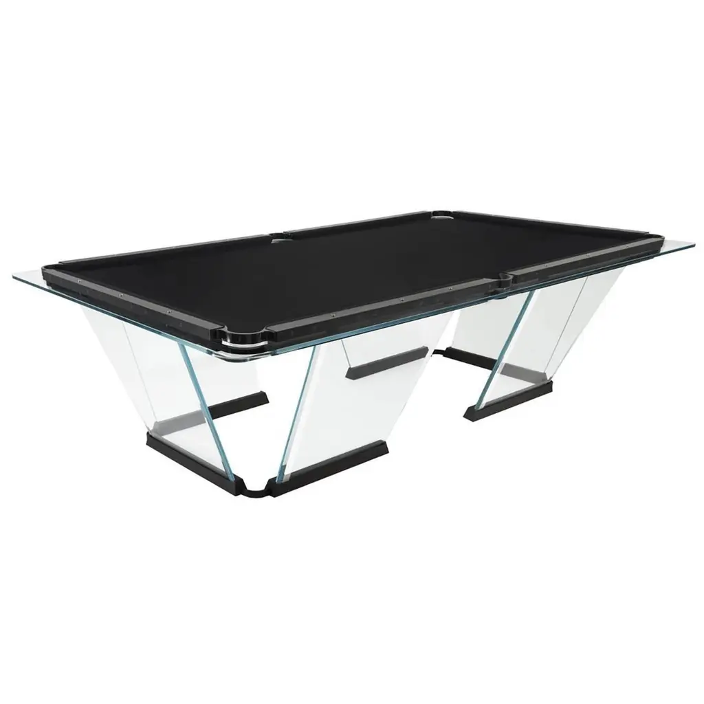 T1 is a billiard-pool table made entirely of glass, where the playing surface is specially treated reproducing the friction of traditional cloth.The feet are sheets of glass bevelled on both sides that self-stabilize, the support is made of solid wood hollowed out for the insertion of the glass, hiding a perfect system of regulation. The pockets are made of smoked transparent thermoplastic.T1 is the product of an encounter between an entrepreneur and a designer,a project that becomes a reality thanks to the savoir faire of a group of Italian companies highly specialized in making individual components: glass, steel, wood, but also special high-tech polymers for the pockets and the bumpers.A great team effort at the service of an original and elegant idea that puts together imagination, entrepreneurial brilliance, technology and ability, in order to reveal and give life to a unique object.Dimensions: 290 x 167 x H 82 cm 114.2 x 65.7 x H 32.3 inches.The legs are glass plates with beveled edges on both sides that ensure the table is stable. The base is made of solid wood with carved grooves for securing the glass and hiding the perfect regulation system.Accessories included with the pool table:Four professional and stylish cues.One set of Pool Balls Aramith.One rack.The table cloth by Simonis is available in 24 colors.Cue rack and ceiling lamp are also available on request.About the designer:Marc Sadler has worked for a long time as designer in the sports sector, where he has experimented with new materials and innovative production processes. He has also worked successfully in furnishing and consumer products. In 2001 he won Compasso D’Oro Prize.