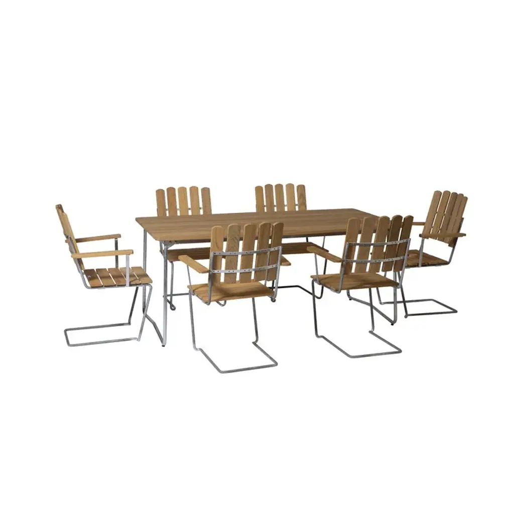 Grythyttan Stålmöbler's table B31 is an attractive and hardwearing outdoor table that pairs a steel base with a long, rectangular teak wood top. Designed by Artur Lindqvist in the 1950s, this table is ideal for approximately 6 people, and its foldable base allows it to be stored and transported in as narrow a space as possible. Over time, the galvanized steel parts will acquire a matte surface, while oak parts will maintain their warm color when oiled regularly. Table B31 is part of Grythyttan Stålmöbler's Classic collection. With its first pieces dating back to the Swedish functionalist design of the 1930s, the Classic collection is designed specifically for outdoor use. Comprising minimalist steel frames and natural wooden elements, different pieces of the Classic collection complement each other effortlessly, while their timeless, modern feel makes them easy to pair with contemporary design as well. The products are made at Grythyttan Stålmöbler's factory in Sweden.