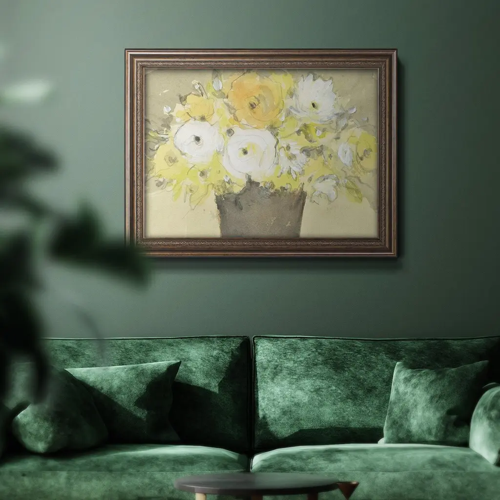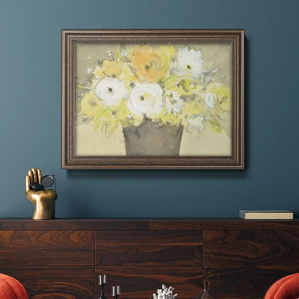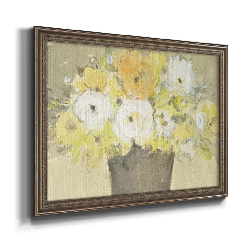 Table Bouquet I Premium Framed Canvas- Ready to Hang A Premium Framed Canvas created to last. Framed in distressed wood and available in an array of sizes and colors Featuring a beveled a solid wood stretcher bar, each piece comes ready to hand 3 SIZES AVAILABLE 16''X20'' - Overall Size 18'X27'' - Overall Size 24''x36'' - Overall Size Each piece is made to order. Each piece comes with hanging hardware. Made in the USA Ready to Hang Giclee Paper Print Acrylic Glass Beveled Matt Board