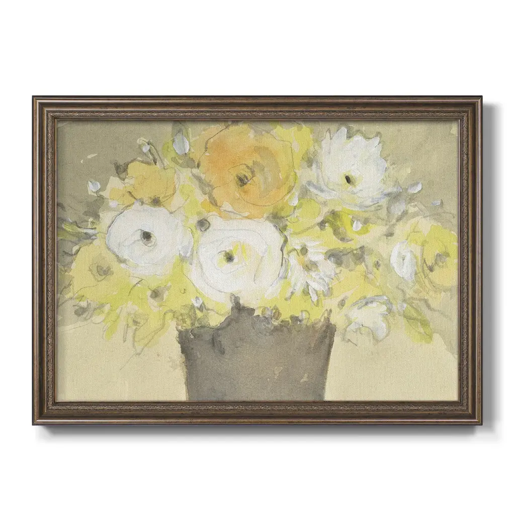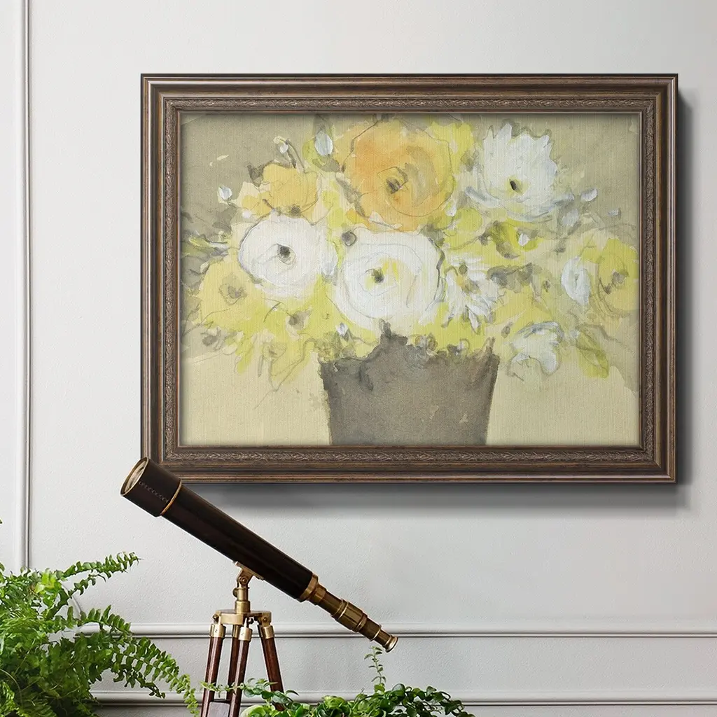 Table Bouquet I Premium Framed Canvas- Ready to Hang A Premium Framed Canvas created to last. Framed in distressed wood and available in an array of sizes and colors Featuring a beveled a solid wood stretcher bar, each piece comes ready to hand 3 SIZES AVAILABLE 16''X20'' - Overall Size 18'X27'' - Overall Size 24''x36'' - Overall Size Each piece is made to order. Each piece comes with hanging hardware. Made in the USA Ready to Hang Giclee Paper Print Acrylic Glass Beveled Matt Board