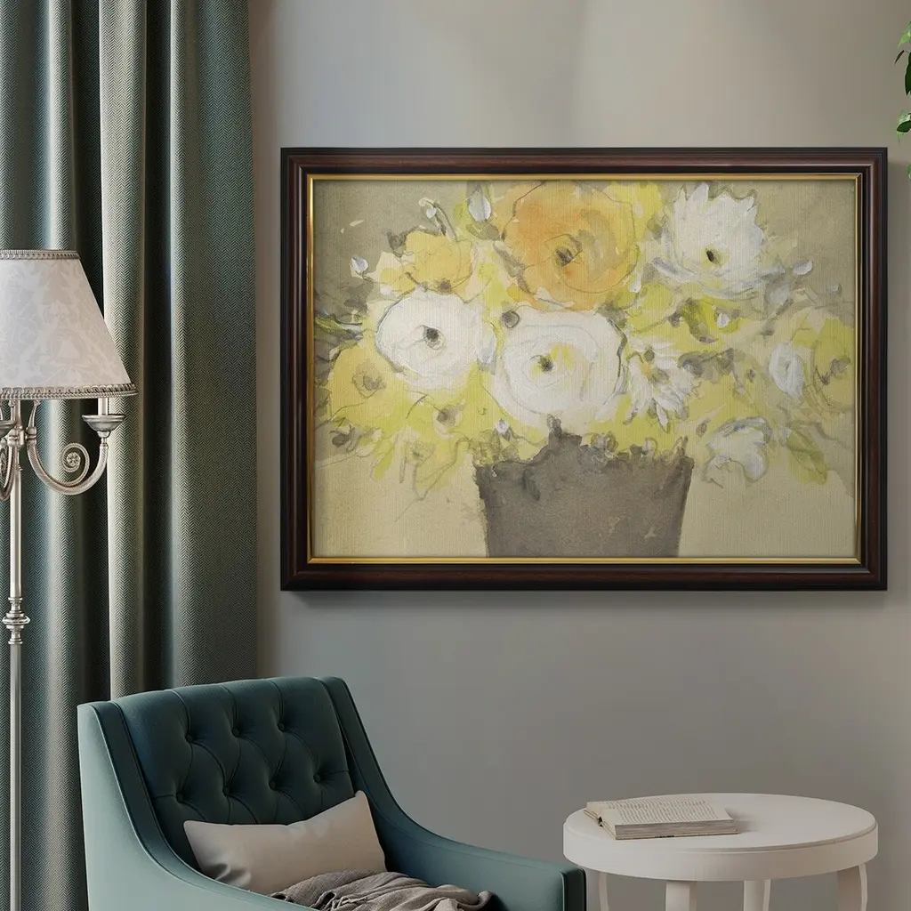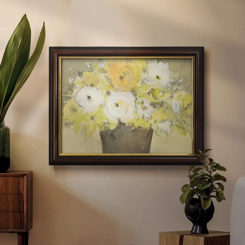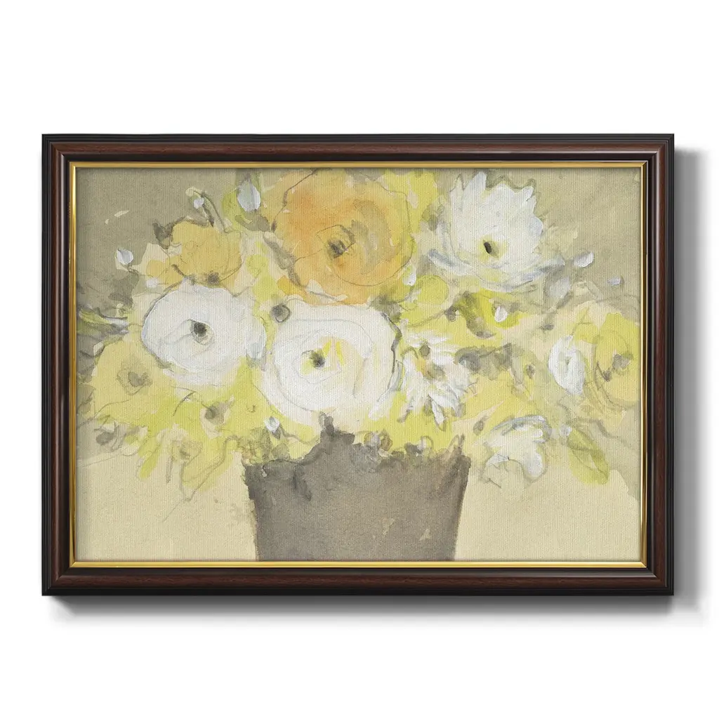 Table Bouquet I Premium Framed Canvas- Ready to Hang A Premium Framed Canvas created to last. Framed in distressed wood and available in an array of sizes and colors Featuring a beveled a solid wood stretcher bar, each piece comes ready to hand 3 SIZES AVAILABLE 16''X20'' - Overall Size 18'X27'' - Overall Size 24''x36'' - Overall Size Each piece is made to order. Each piece comes with hanging hardware. Made in the USA Ready to Hang Giclee Paper Print Acrylic Glass Beveled Matt Board