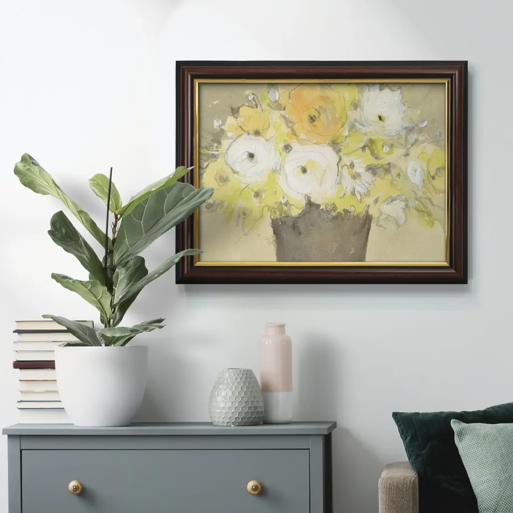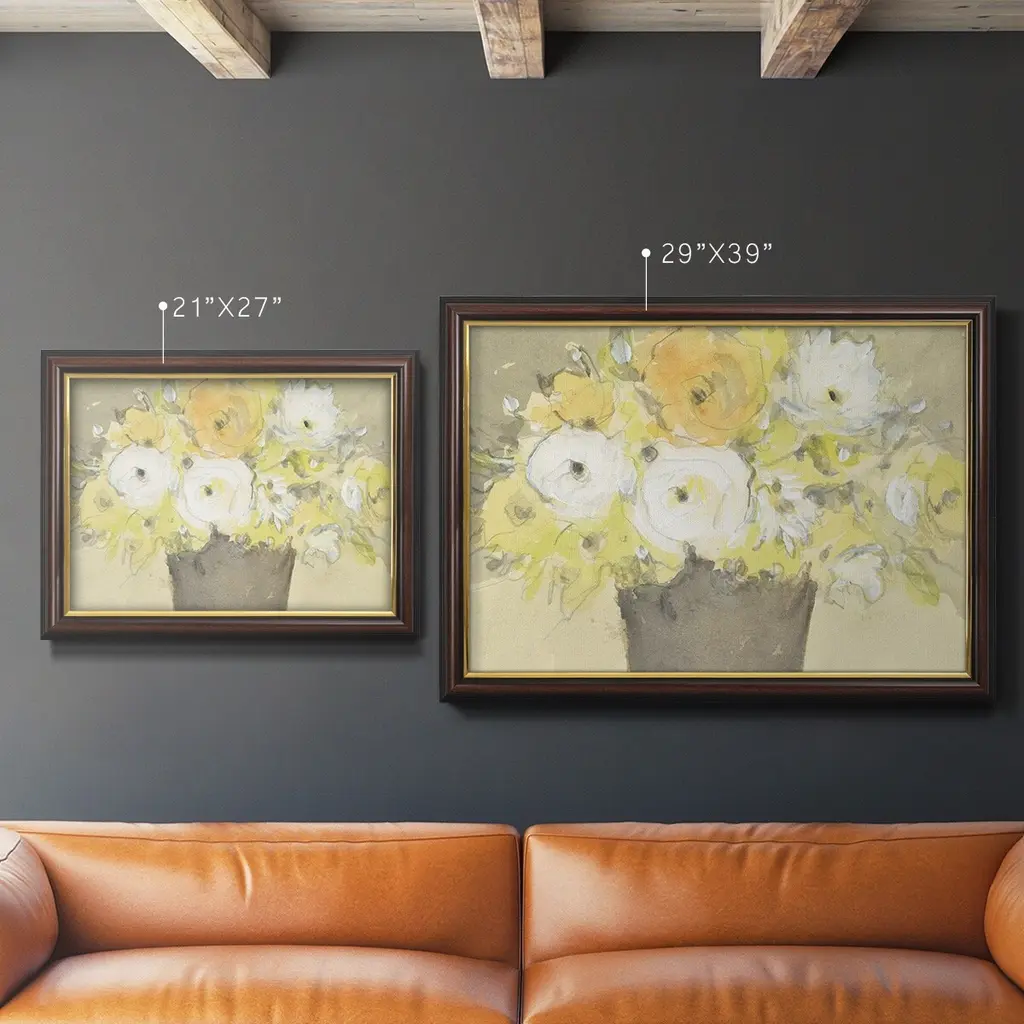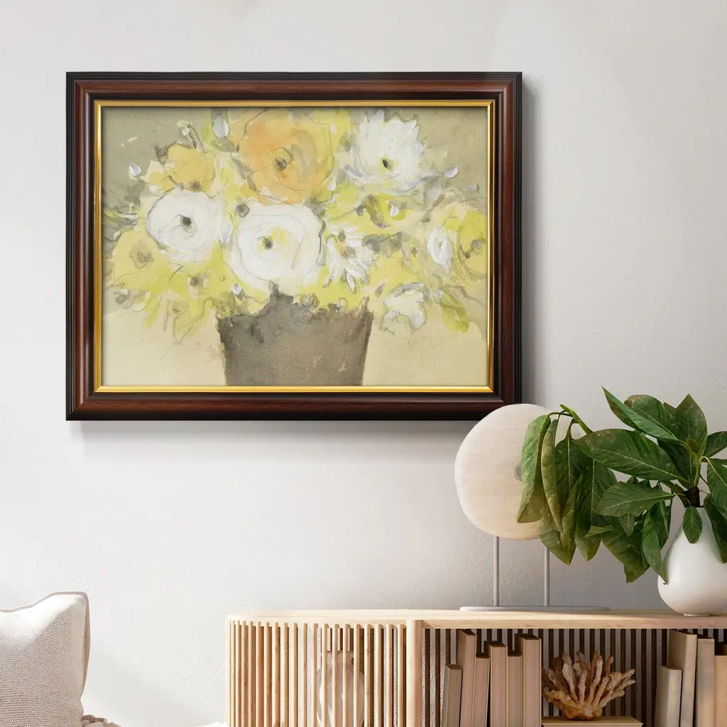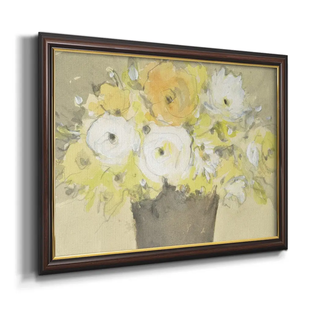 Table Bouquet I Premium Framed Canvas- Ready to Hang A Premium Framed Canvas created to last. Framed in distressed wood and available in an array of sizes and colors Featuring a beveled a solid wood stretcher bar, each piece comes ready to hand 3 SIZES AVAILABLE 16''X20'' - Overall Size 18'X27'' - Overall Size 24''x36'' - Overall Size Each piece is made to order. Each piece comes with hanging hardware. Made in the USA Ready to Hang Giclee Paper Print Acrylic Glass Beveled Matt Board