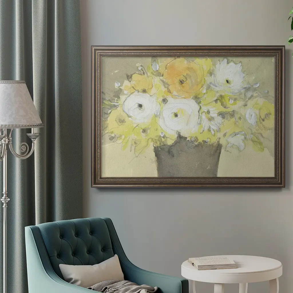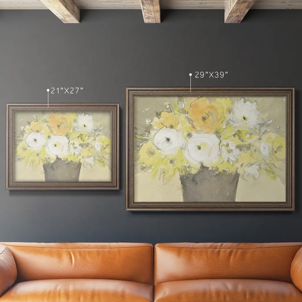 Table Bouquet I Premium Framed Canvas- Ready to Hang A Premium Framed Canvas created to last. Framed in distressed wood and available in an array of sizes and colors Featuring a beveled a solid wood stretcher bar, each piece comes ready to hand 3 SIZES AVAILABLE 16''X20'' - Overall Size 18'X27'' - Overall Size 24''x36'' - Overall Size Each piece is made to order. Each piece comes with hanging hardware. Made in the USA Ready to Hang Giclee Paper Print Acrylic Glass Beveled Matt Board