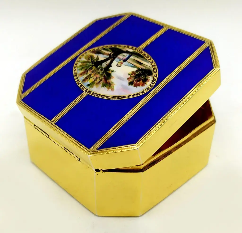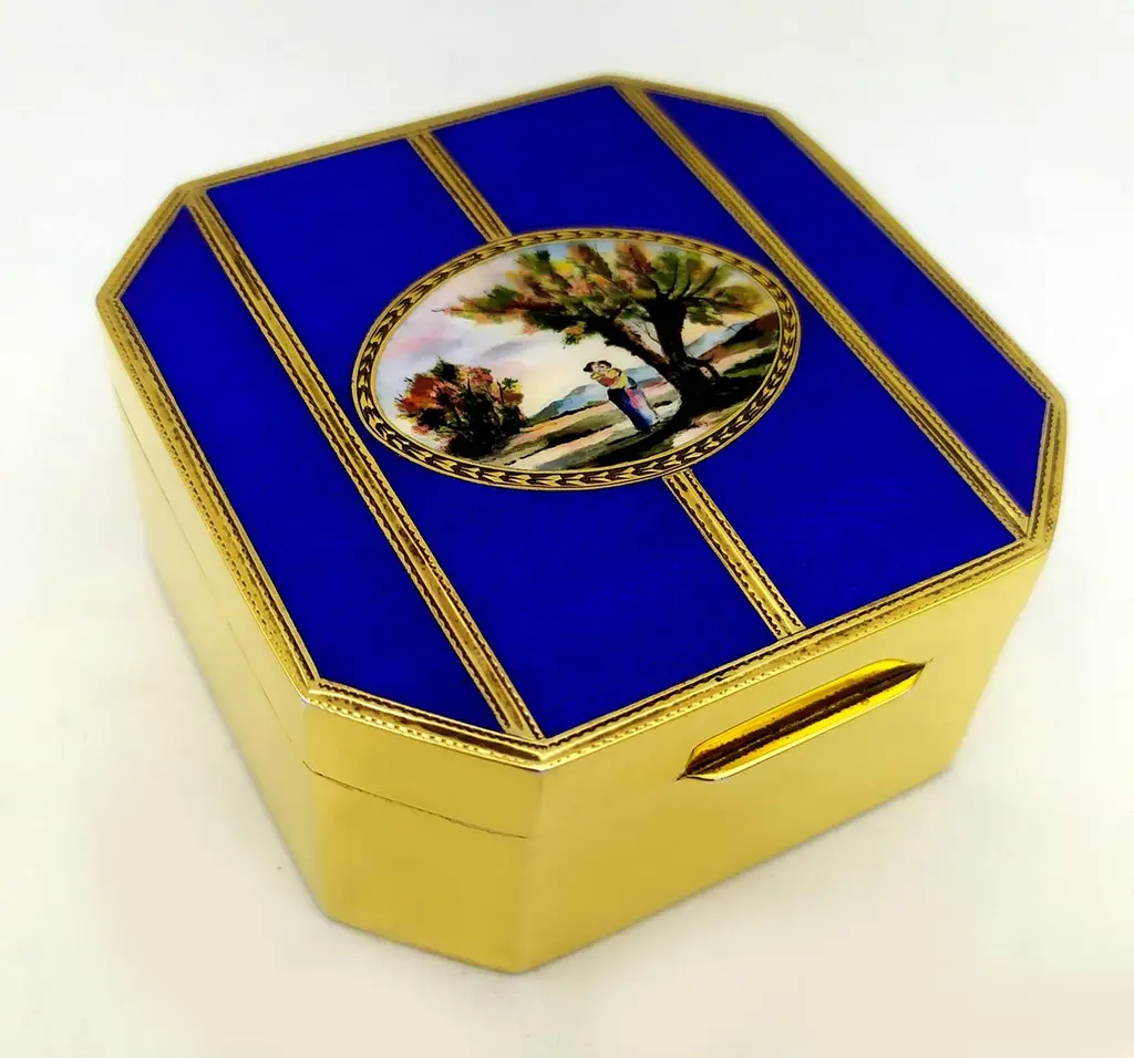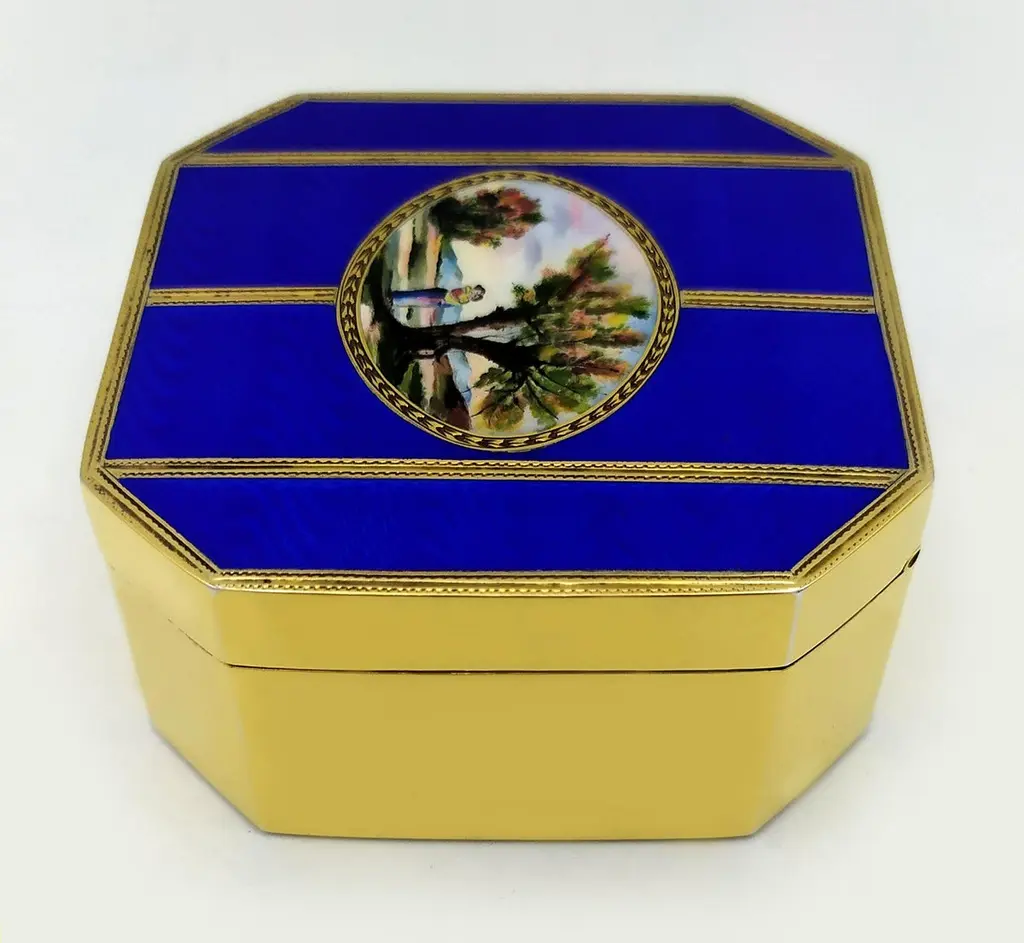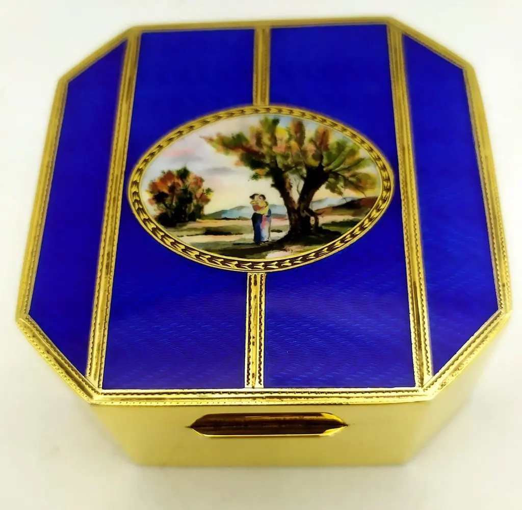 Table Box Blue And Gold With Handpainted Miniature Fire-Enameled On Guilloche Sa