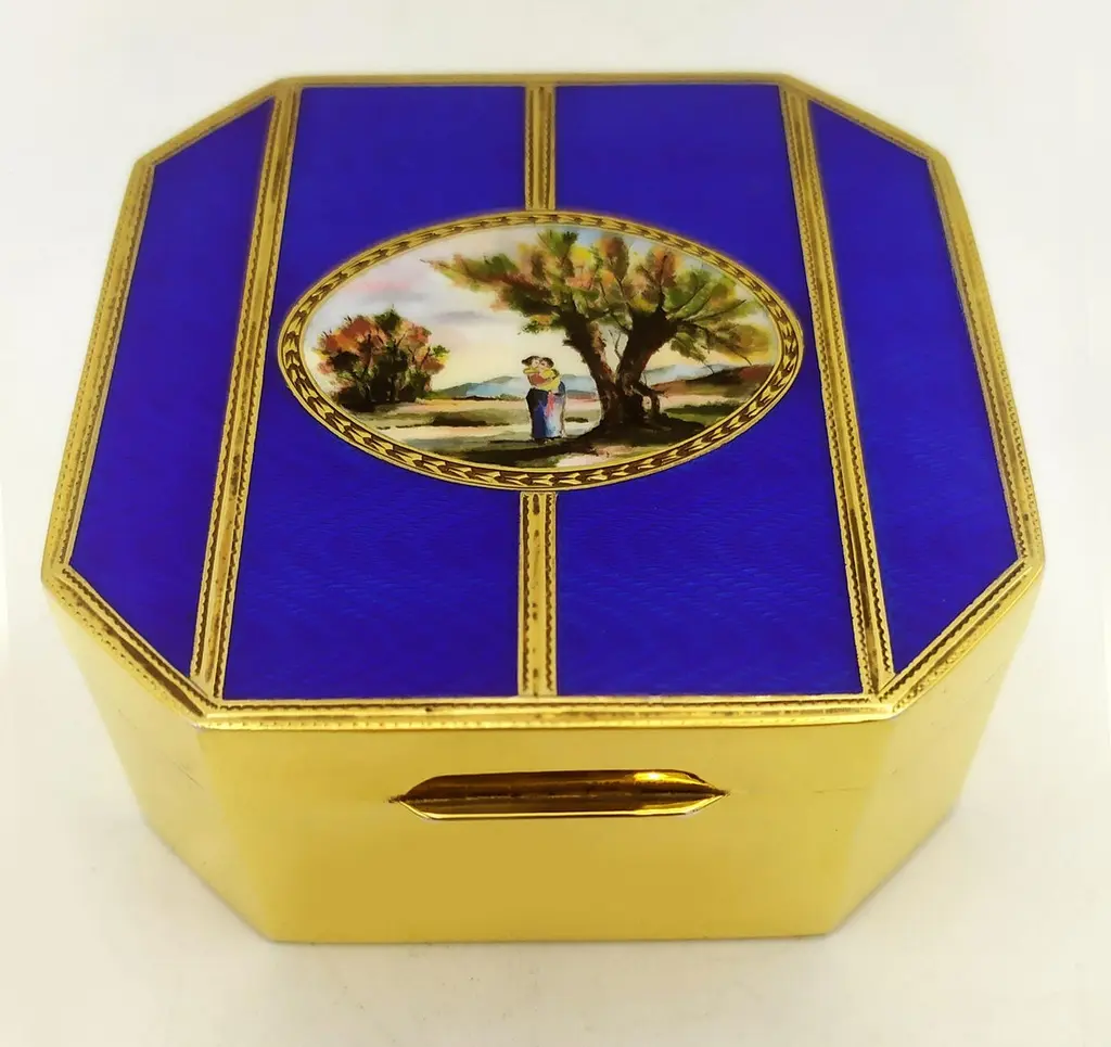 Octagonal table box in 800/1000 silver gold plated with translucent enamel on guilloché and beautiful enamel miniature hand painted by the painter Renato Dainelli in early 1900s English style. Size cm. 8 x 8 x 3.7. Weight gr. 237. Designed by Franco Salimbeni in 1989 and manufactured in Florence at the Salimbeni company headquarters with completely manual execution by artisan artists with a high thickness plate and large reinforcements suitable for supporting numerous enamelling firings at high temperature at around 800° C. The hallmarks struck to the underside of this fine Table Box 8 x 8 x 3.7 include:manufacturer's mark: 391FImetal mark fineness:925It is a new object that has never been used but is considered vintage because it was built more than 20 years ago.