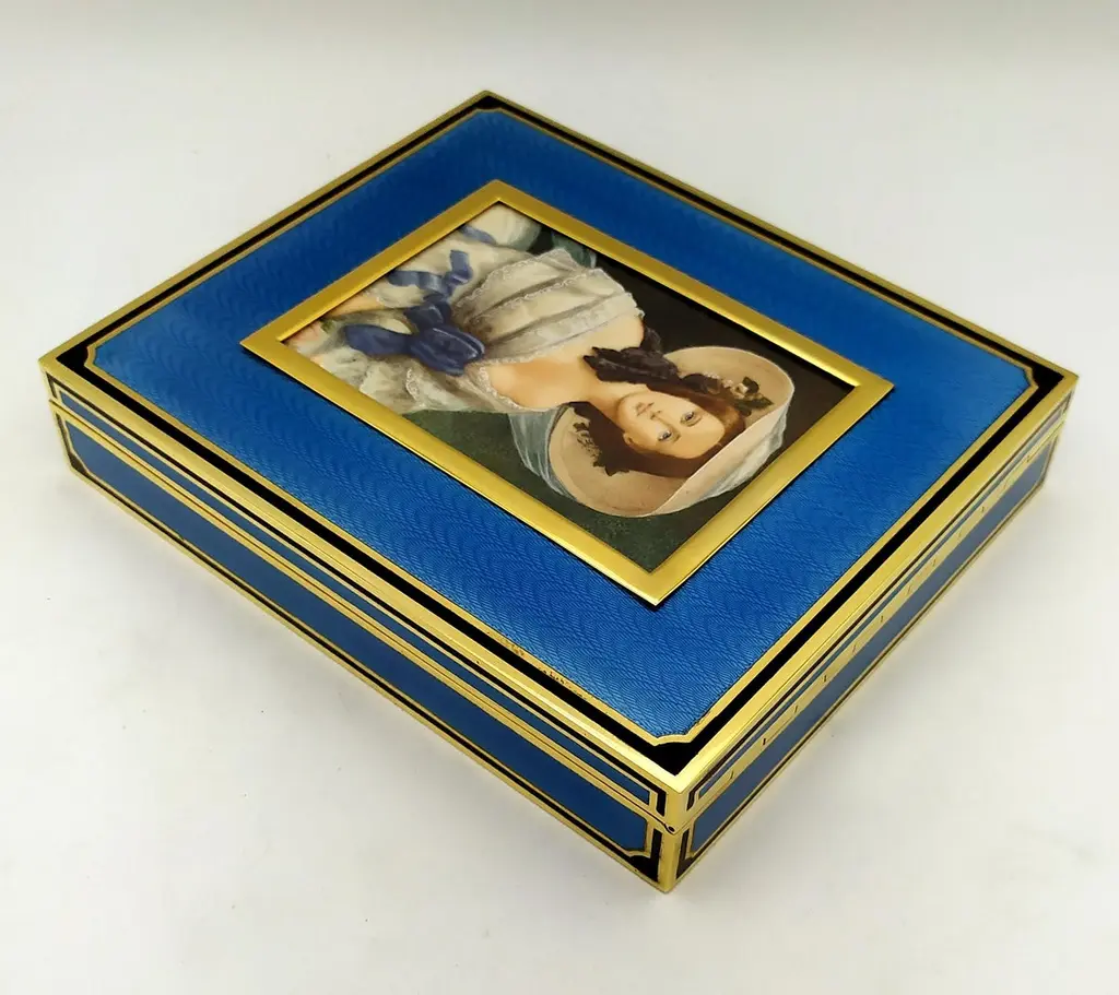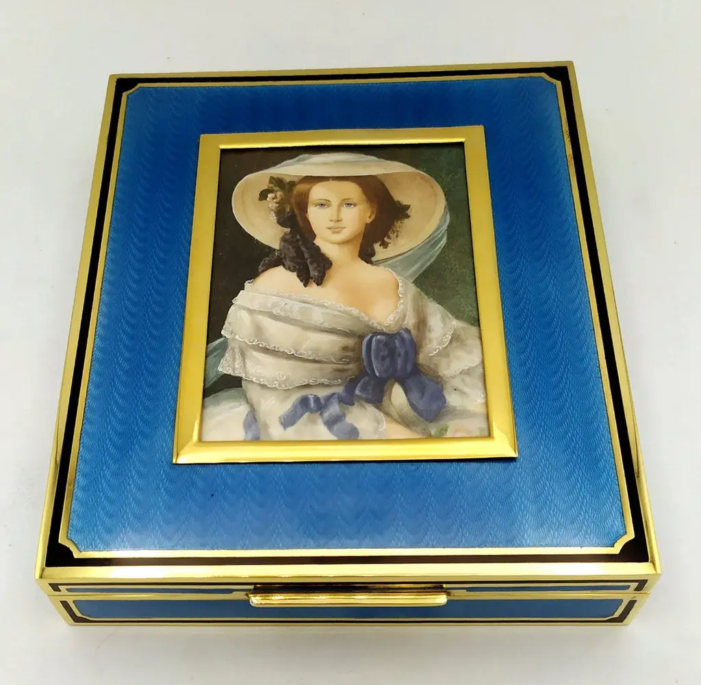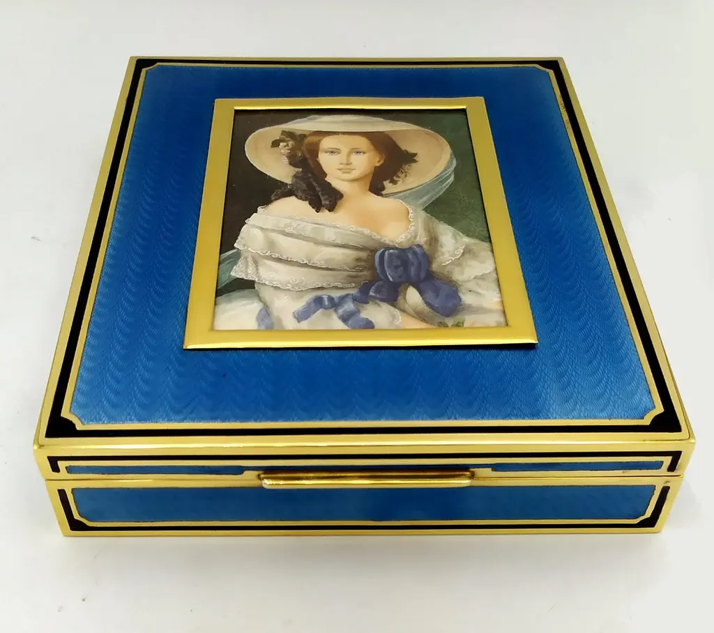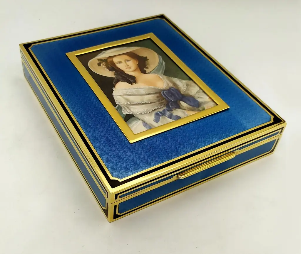 More than a kilo of sterling silver was needed to create this stunning rectangular tabletop box. Worked with the very complicated guilloche technique, it was then enamelled at high heat with translucent enamel to make the superb workmanship shine through.The fine rectangular miniature cm. 7.5 x 10.7 on vegetable ivory. The small masterpiece handmade by the painter Anna Maria Manfriani reproduces the famous portrait of Empress Eugenia de Montijo, by the painter Franz Xaver Winterhalter. The unenamelled sterling silver parts were then gilded with a 24-carat galvanic bath.In Art Nouveau style, with a “lost” zip, i.e. semi-invisible. Dimensions cm. 15 x 18 x 3.5. Weight gr. 1095. Designed by Giorgio Salimbeni in 1980 and manufactured in Florence at the Salimbeni company headquarters with completely manual execution by artisan artists with a very thick slab and large reinforcements suitable for supporting numerous enamelling firings at around 800° Doña María Eugenia Ignacia Agustina de Palafox y Kirkpatrick, 19th Countess of Teba, 16th Marquise of Ardales known as Eugénie de Montijo was Empress of the French from her marriage to Napoleon III on 30 January 1853 until the fall of the Emperor on 4 September 1870. From July 28 to September 4, 1870, he was the de facto head of state of France.It is a new object that has never been used but is considered vintage because it was built more than 20 years ago.The hallmarks struck to the underside of this exclusive Table Box include:manufacturer's mark: 391FImetal mark fineness:925