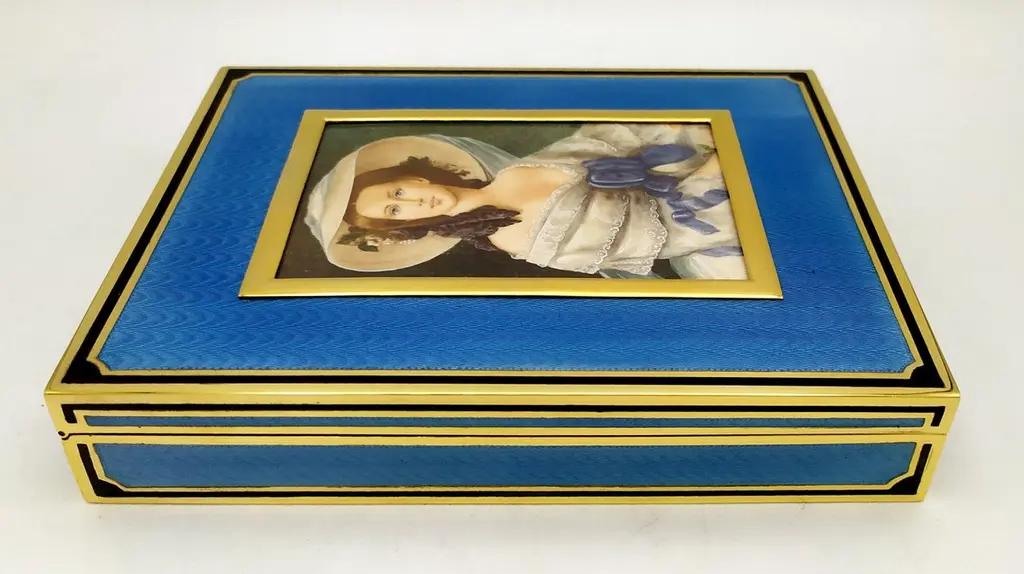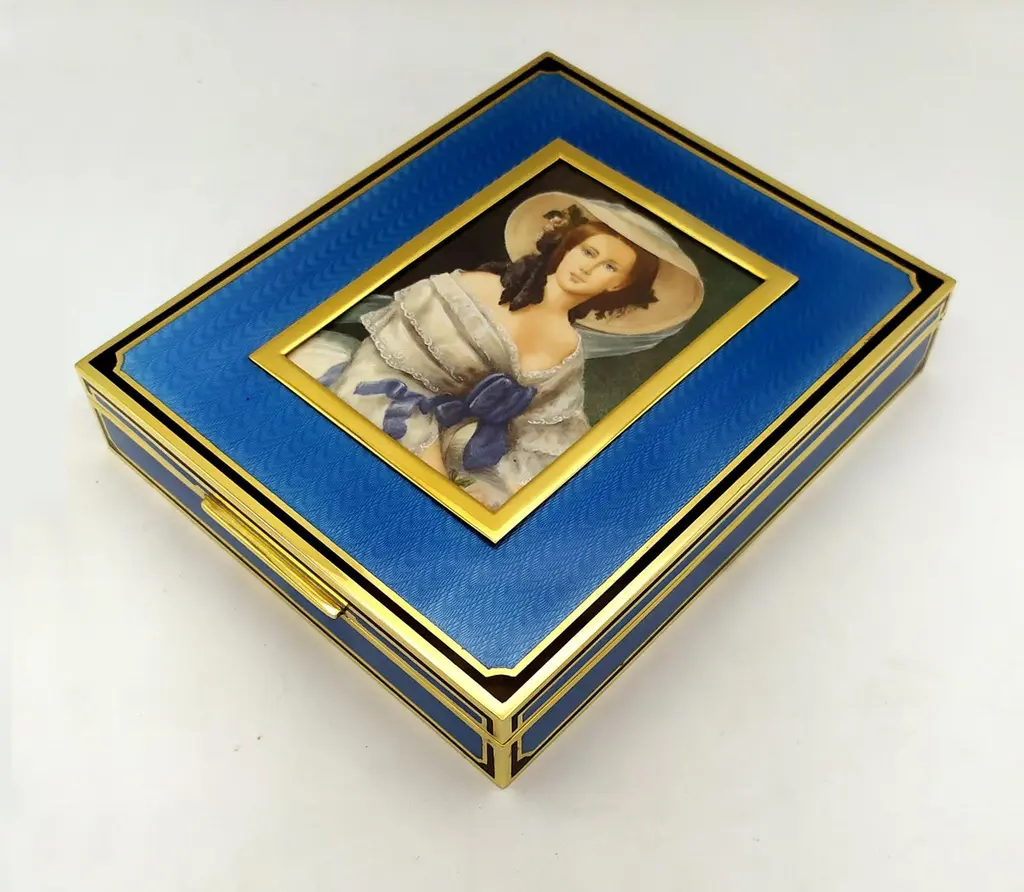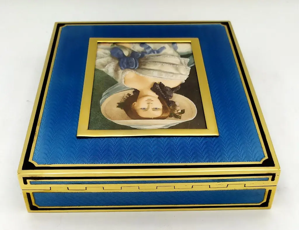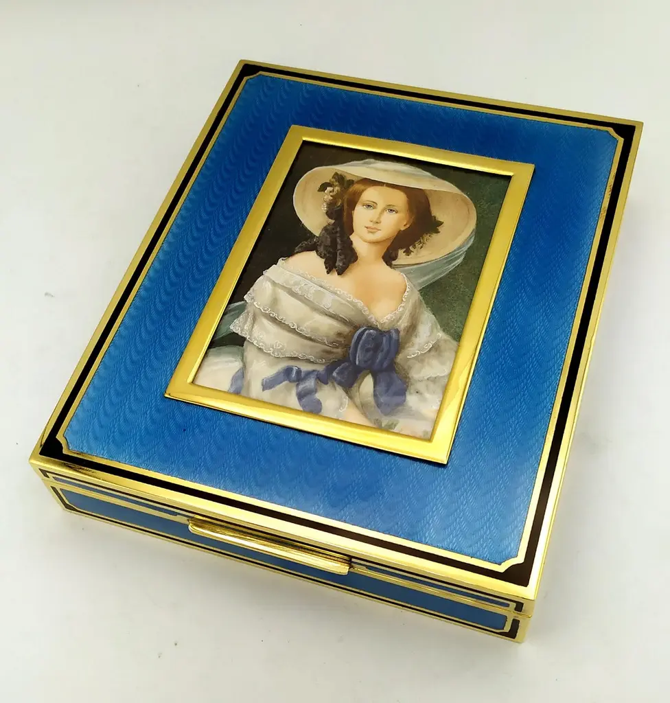 More than a kilo of sterling silver was needed to create this stunning rectangular tabletop box. Worked with the very complicated guilloche technique, it was then enamelled at high heat with translucent enamel to make the superb workmanship shine through.The fine rectangular miniature cm. 7.5 x 10.7 on vegetable ivory. The small masterpiece handmade by the painter Anna Maria Manfriani reproduces the famous portrait of Empress Eugenia de Montijo, by the painter Franz Xaver Winterhalter. The unenamelled sterling silver parts were then gilded with a 24-carat galvanic bath.In Art Nouveau style, with a “lost” zip, i.e. semi-invisible. Dimensions cm. 15 x 18 x 3.5. Weight gr. 1095. Designed by Giorgio Salimbeni in 1980 and manufactured in Florence at the Salimbeni company headquarters with completely manual execution by artisan artists with a very thick slab and large reinforcements suitable for supporting numerous enamelling firings at around 800° Doña María Eugenia Ignacia Agustina de Palafox y Kirkpatrick, 19th Countess of Teba, 16th Marquise of Ardales known as Eugénie de Montijo was Empress of the French from her marriage to Napoleon III on 30 January 1853 until the fall of the Emperor on 4 September 1870. From July 28 to September 4, 1870, he was the de facto head of state of France.It is a new object that has never been used but is considered vintage because it was built more than 20 years ago.The hallmarks struck to the underside of this exclusive Table Box include:manufacturer's mark: 391FImetal mark fineness:925