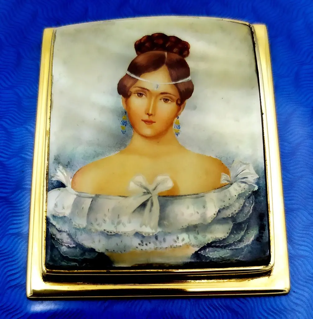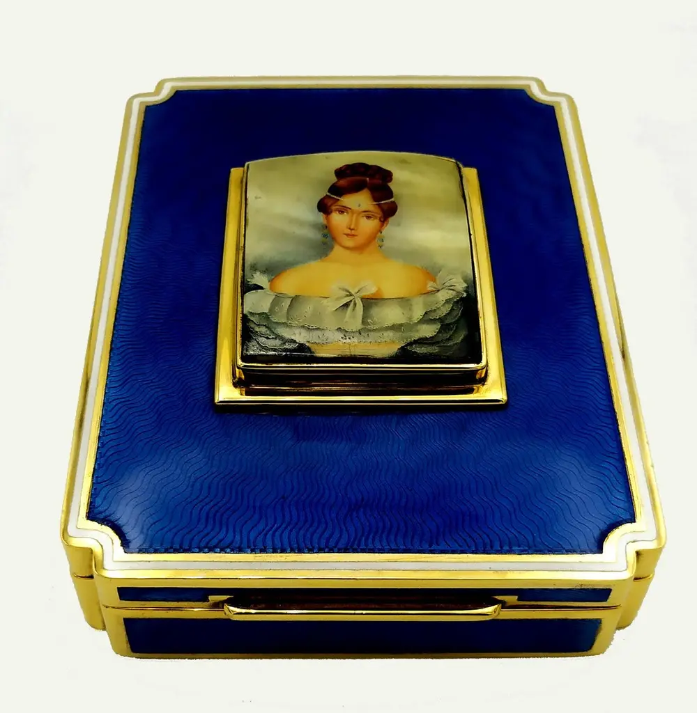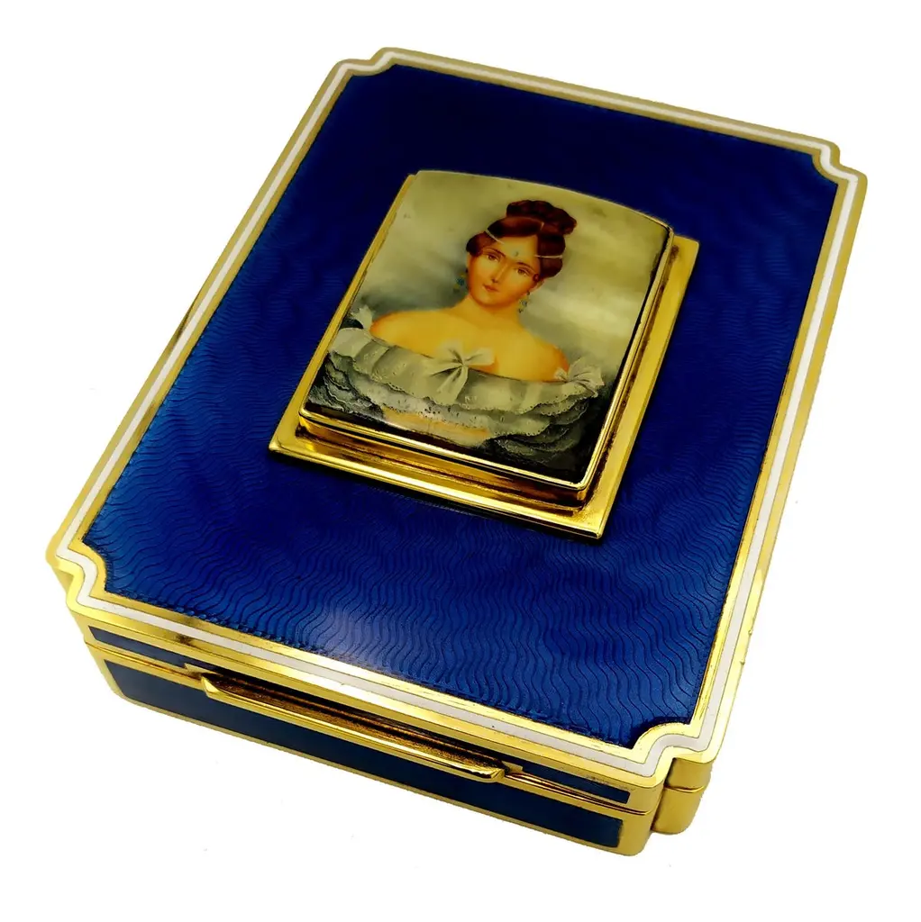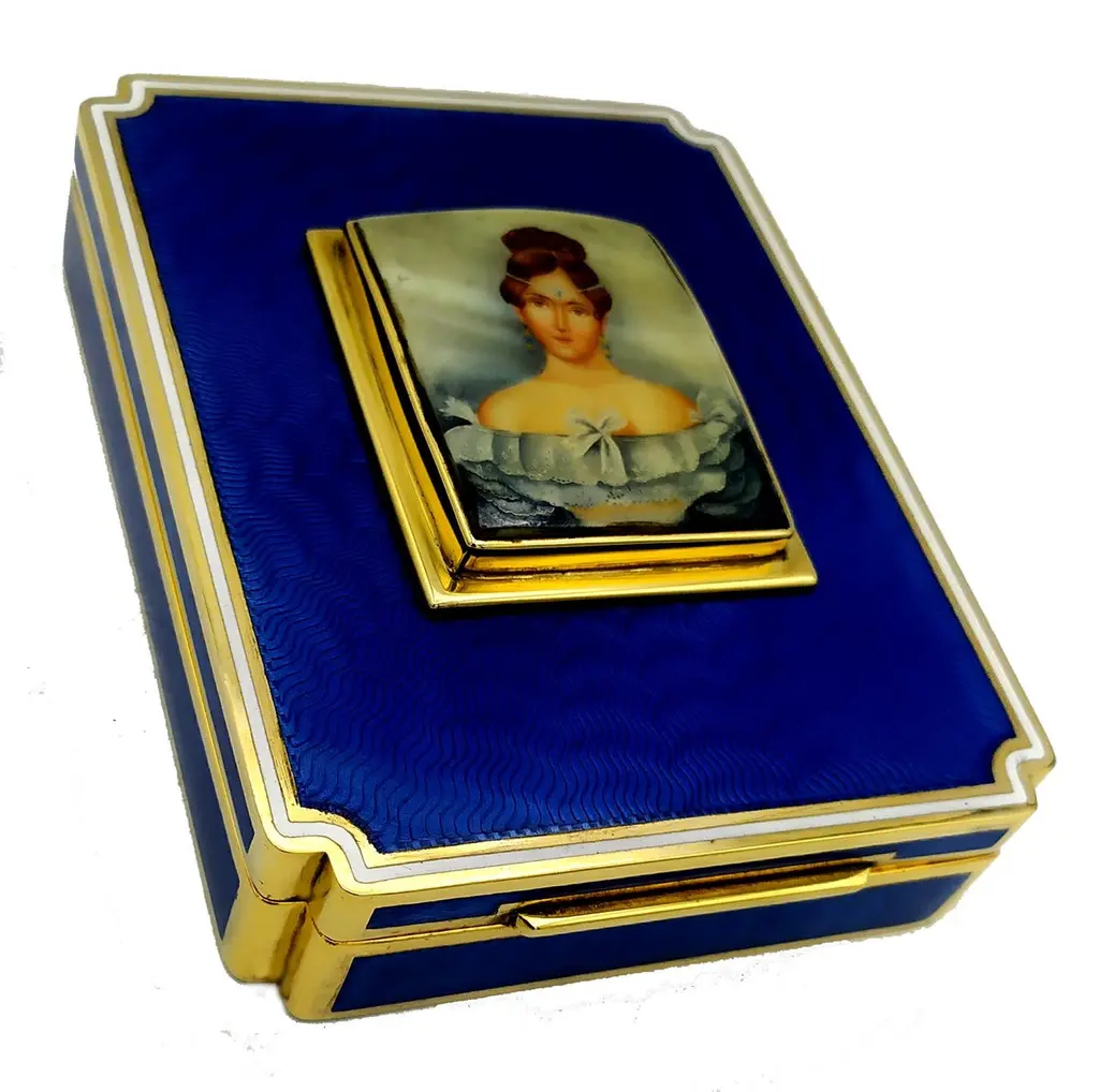 Spectacular table box with inward corners in gold-plated 925/1000 sterling silver with translucent enamel fired on guilloche, in Art Nouveau style, and in the center a fine rectangular miniature cm. 4.2 x 5.4 hand painted on mother-of-pearl by the painter Evelina Pastilati, depicting the portrait of Natalia Nikolaevna Pushkina Lanskaja, wife of Alexander Sergeyevich Pushkin, by the painter Alexander Pavlovich Brjullon in 1831. With “lost” hinge, i.e. semi-invisible . Dimensions cm. 10 x 13 x 2.7. Weight gr. 601. Designed by Franco Salimbeni in 1979 and manufactured in Florence at the Salimbeni company headquarters with completely manual execution by artisan artists with a very thick slab and large reinforcements suitable for supporting numerous enamelling firings at around 800° C. It is a new object that has never been used but is considered vintage because it was built more than 20 years ago.The hallmarks struck to the underside of this Special Table Box include:manufacturer's mark: 391FImetal mark fineness:925It is a new object that has never been used but is considered vintage because it was built more than 20 years ago.