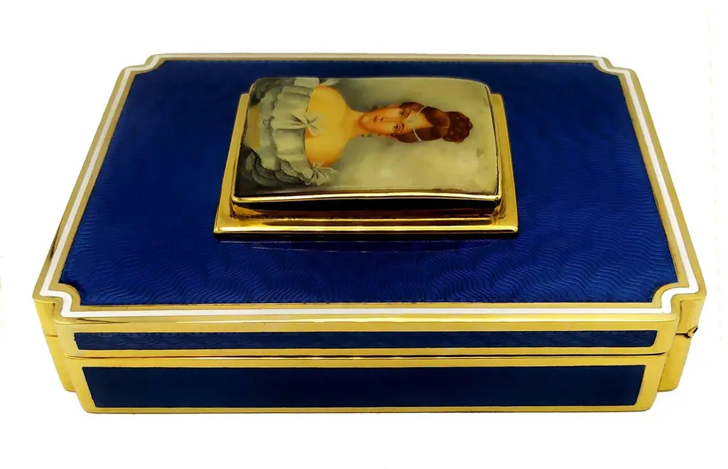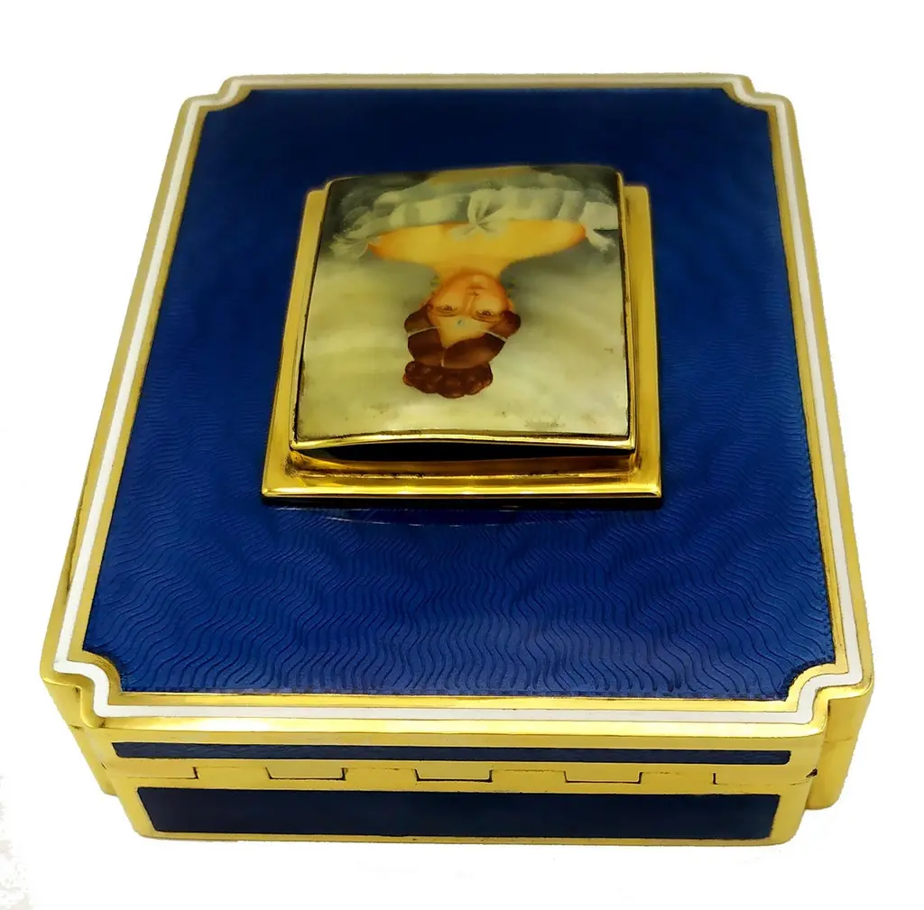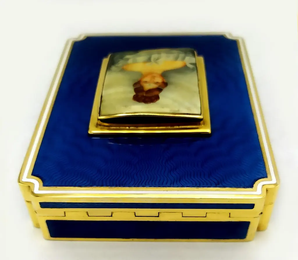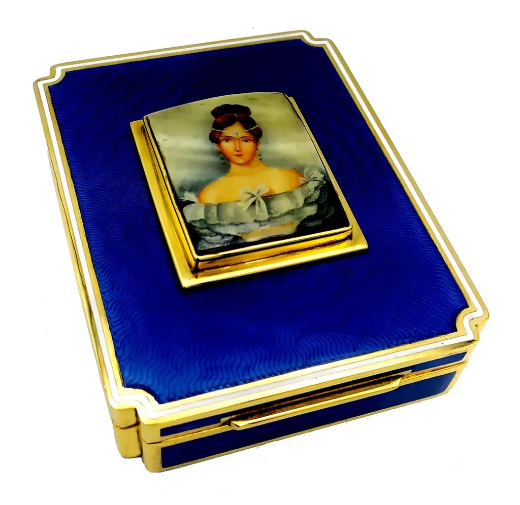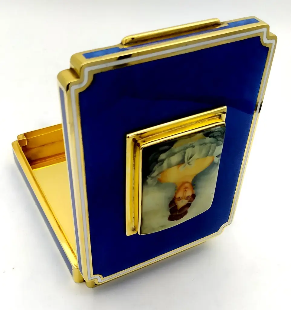 Spectacular table box with inward corners in gold-plated 925/1000 sterling silver with translucent enamel fired on guilloche, in Art Nouveau style, and in the center a fine rectangular miniature cm. 4.2 x 5.4 hand painted on mother-of-pearl by the painter Evelina Pastilati, depicting the portrait of Natalia Nikolaevna Pushkina Lanskaja, wife of Alexander Sergeyevich Pushkin, by the painter Alexander Pavlovich Brjullon in 1831. With “lost” hinge, i.e. semi-invisible . Dimensions cm. 10 x 13 x 2.7. Weight gr. 601. Designed by Franco Salimbeni in 1979 and manufactured in Florence at the Salimbeni company headquarters with completely manual execution by artisan artists with a very thick slab and large reinforcements suitable for supporting numerous enamelling firings at around 800° C. It is a new object that has never been used but is considered vintage because it was built more than 20 years ago.The hallmarks struck to the underside of this Special Table Box include:manufacturer's mark: 391FImetal mark fineness:925It is a new object that has never been used but is considered vintage because it was built more than 20 years ago.