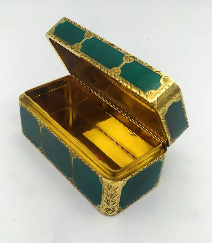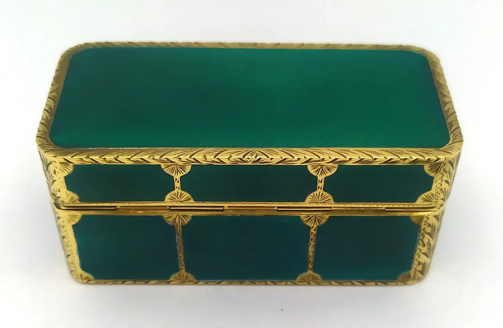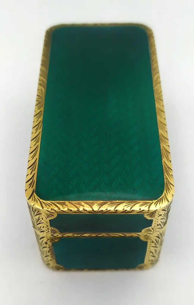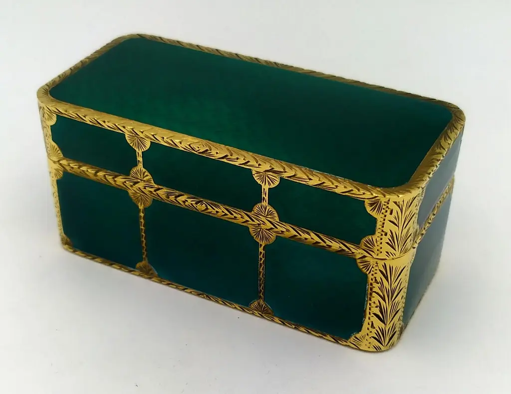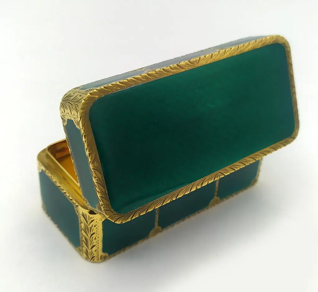 Table cigarette case in 925/1000 sterling silver gold plated with translucent fired enamel on guilloché with hand-engraved engravings in the French Empire Napoleon III style. Measurements cm. 4.5 x 9 x 4. Weight gr. 226. Designed by Franco Salimbeni in 1973 and produced at the Salimbeni company headquarters with manual workmanship by skilled artisan artists with a high thickness plate and large reinforcements suitable for supporting numerous enamelling firings at high temperature at around 800° C.manufacturer's mark: 391FImetal mark fineness:925It is a new object that has never been used but is considered vintage because it was built more than 20 years ago.