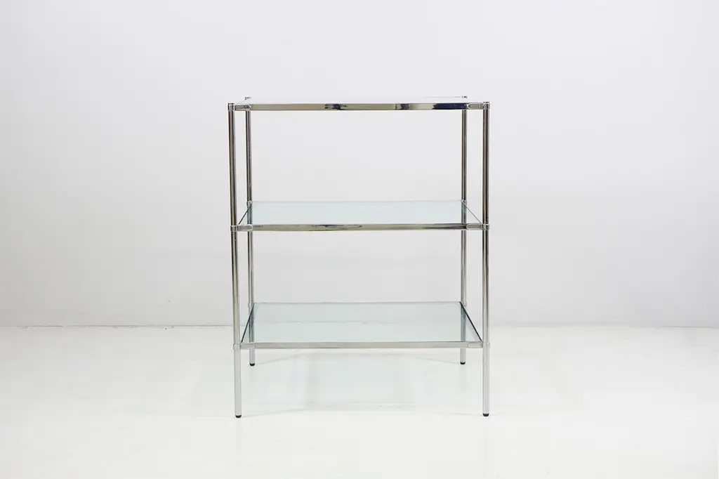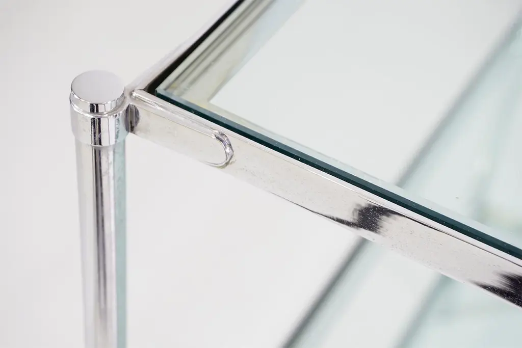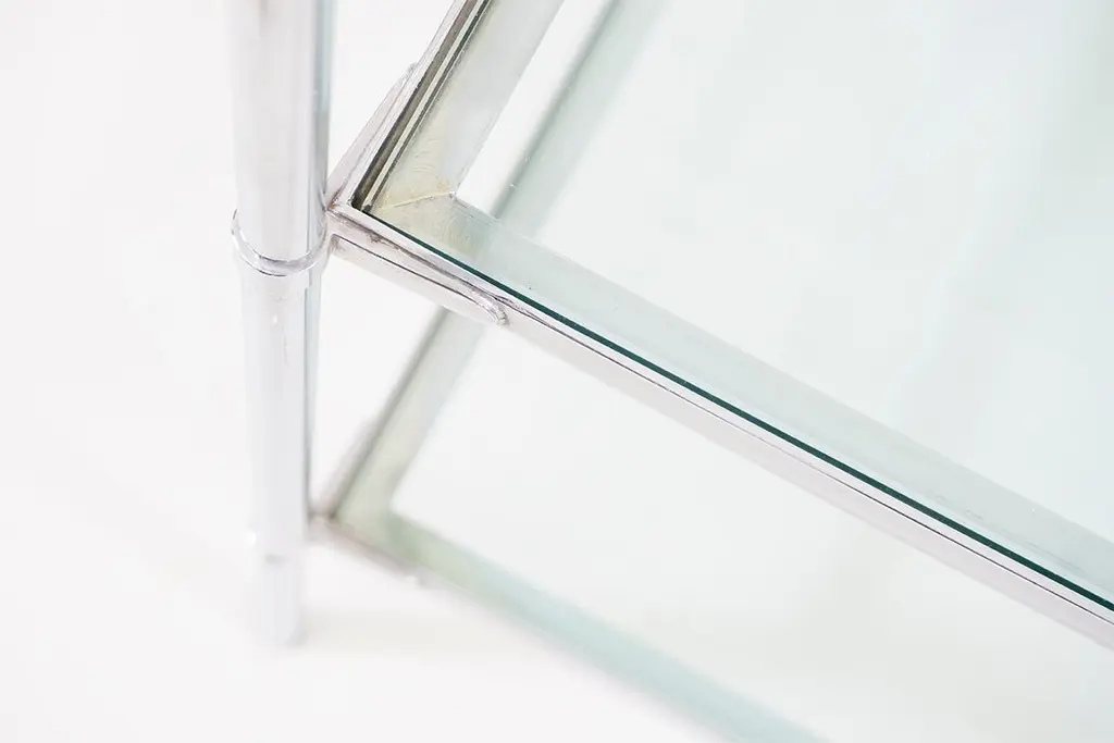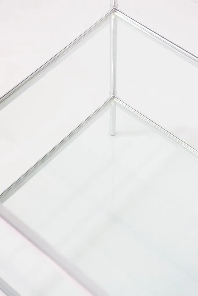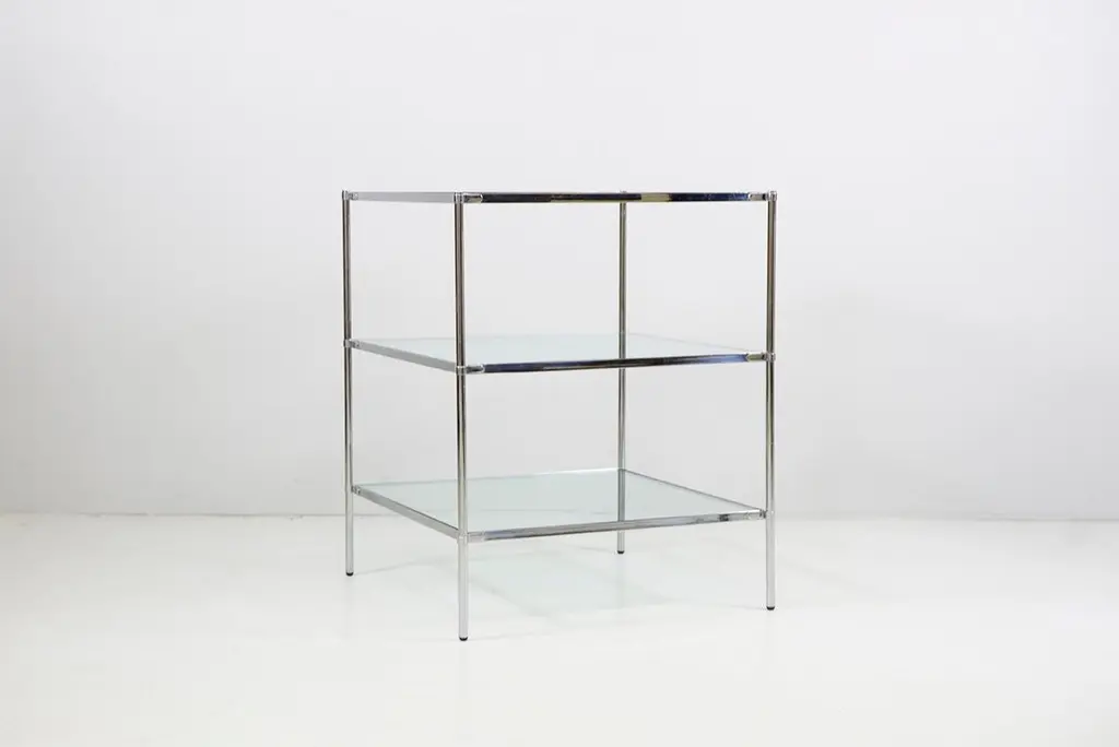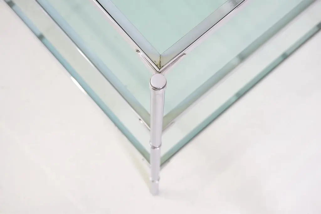 Side / Sofa table made of a chrome-plated brass construction with original glass plates. Dimensions / 53.5 x 53.5cm H.66cmDesign / Corrado Corradi Dell'Aqua 1959Manufacturer / Azucena Milano.(2 pieces available).
