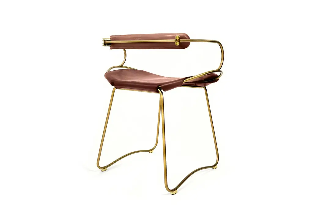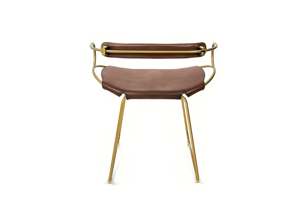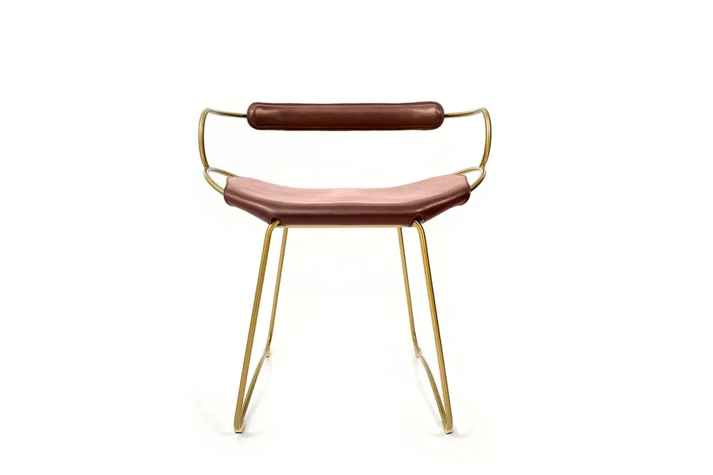 The Hug contemporary table stool with backrest is designed and conceived with a light aesthetic, the slight oscillation of the steel rod of 12 mm is complemented by the flexibility of the double 3.5 mm thick leather. When sitting in this furniture you feel an enveloping sensation, like being hugged, since the weight of the body is distributed evenly. Each unit becomes a refuge of visual and ergonomic wellbeing.Our Hug Collection is inspired by the organic lines of a landscape, the curves of nature, and the imaginary Silhouette of the wind inspire this collection of organic forms, almost like metallic sculptures. All pieces are done with cold bended steel rods, polished, nickel plated, colored by electrolysis, and lacquered. The process of polishing and lacquering the steel, goes through a manual and delicate chroming process, which gives its final and unique metal color finish. This precise technique gives a uniform metallic finish of minimum 50 microns over the entire Surface. Our metal finishing has successfully passed a corrosion resistance test in a salt spray chamber according to UNE-EN ISO 9227: 2017 and UNE-EN ISO 1456: 2010. Our signature screws are made with brass turning lathed, polished, and lacquered, these are the pieces that fix the saddle leather to the metal frame.Leathers are Spanish hides vegetable tanned. We use premium saddles in multiple colors to adjust to your taste and interior needs. This traditional vegetable dying and tanning method is an organic technique that relies on natural tannings from bark or plant tissues. The use of oils and natural fats give the leather a distinctive flexibility and texture, allowing it to be molded, retain its shape and age graciously.All skins are carefully selected from food industry, with a minimum thickness of 3.5 mm / 0,02 in, using the part of the animal's shoulder, which allows for larger pieces and uniformity, even though signature wrinkle from the animal’s neck may be recognizable. The vegetable tanning is a traditional and artisan treatment, which is respectful to the environment. Even with careful selection natural marks as a result of the contact with other animals, the age, origin and characteristics of the skin, or even the season in which the tanning takes place cannot be avoided. We still believe that these factors only add authenticity and uniqueness to every piece. Our leather parts are made with double saddles, always showing the top side of the hides that presents the better quality.Customization options.With the aim of creating customized pieces, clients can select from the various metal finishes, and leather colors to create pieces that complement their home décor. Leather colors available, black, navy, dark brown, cognac and natural tobacco, and steel polished finishing available, aged brass, black smoke and aged silver.Normally we use tone on tone threats for stitches, but client can select a contrast option, being possible to select any color to make a unique piece for the project it belongs. The finish on the edges of our leather components are sanded and hand painted. We have the option of select an alternative color if not tone on tone will be applied.Our collections are made to full fill home spaces where to gather and enjoy great conversation with families and friends. Occasional furniture for exquisite homes, from cottages to exclusive resorts. Our product is understood as a sculptural piece of design, as an art object to be displayed at different house spaces as library, bar, living, foyer, bedroom, powder, meeting, grand or great room.The different finishes options make the furniture perfect combinations on diverse styles, from rustic mountain home, a small cottage, a ski lodge retreat, or Industrial a Minimalist look.