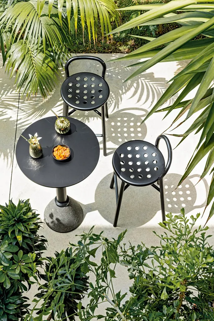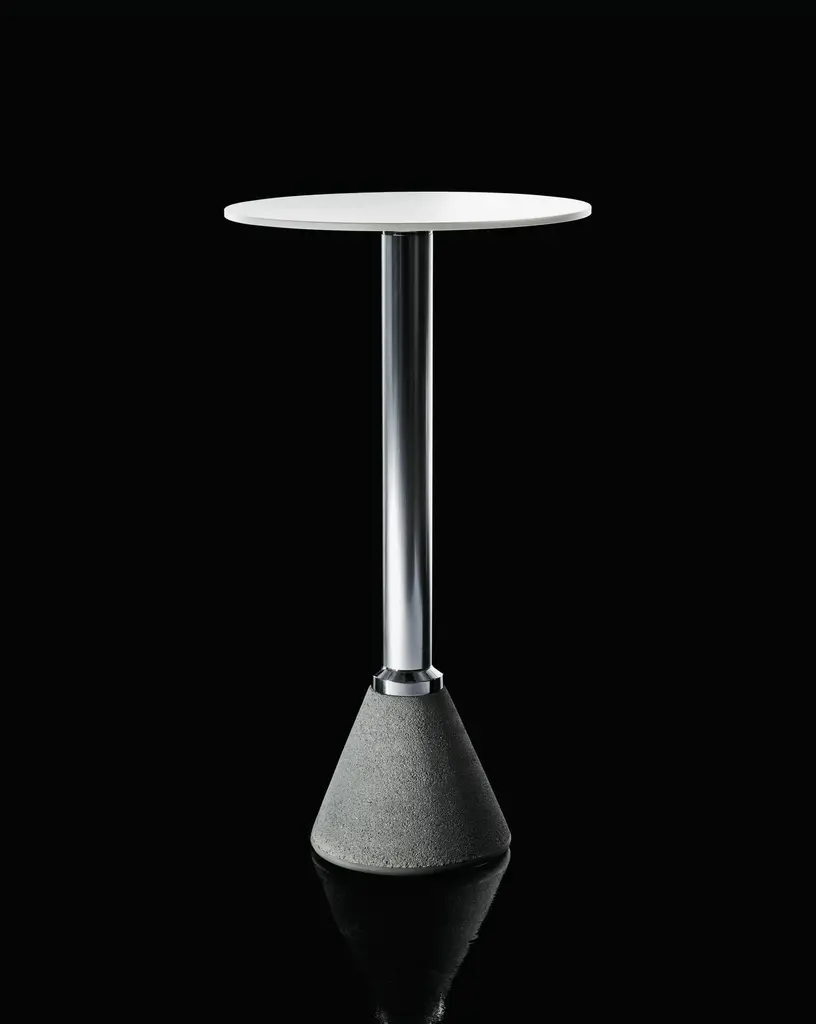 A die-cast aluminium shell made up of many small, perforated and triangular faces. Chair_One is in a certain sense built like a football, i.e. with a series of flat ele- ments joined one to the other at angles to create a three-dimensional shape. All this is achieved by exploiting the potential of die-casting which is a precise technology allowing complex three-dimensional shapes to be obtained from metal (in this case aluminium). The result is therefore a chair in which the spaces prevail over the solid parts to characterise its aesthetic quality. Chair_One has now become a classic of the future.Chairs, stools, tables and seating systems for domestic and contract use (bars and restaurants).Chair_One: legs in polished, anodised or painted aluminium; concrete base painted transparent natural or black; base and seat in die-cast aluminium treated with sputtered fluorinated titanium and painted in polyester powder. Suitable for outdoor use (painted version). Flame-retardant. Also available cushions in fabric (Kvadrat “Steelcut Trio” or “Steelcut 2”) or in leather for indoor use and cushions in polyurethane for outdoor use.Stool_One: legs in anodised aluminium or painted in polyester powder. Seat in die-cast aluminium treated with sputtered fluorinated titanium and painted in poly- ester powder. Suitable for outdoor use. Also available cushions in fabric (Kvadrat “Steelcut Trio” or “Steelcut 2”) or in leather for indoor use.Table_One_Bistrot: frame in anodised aluminium natural or black (suitable for out- door use); concrete base painted transparent natural or black; top in HPL laminate.Chair_One Public Seating System 1: concrete bases painted transparent clear, suitable for floor-fixing. Bar in anodised aluminium. Seat in die-cast aluminium treat- ed with sputtered fluorinated titanium and painted in polyester powder. Concrete small table painted transparent clear. Suitable for outdoor use. Flame-retardant.Chair_One Public Seating System 2: bases in die-cast aluminium painted in polyester powder, suitable for floor-fixing. Bar in anodised aluminium. Seat in die- cast aluminium treated with sputtered fluorinated titanium and painted in polyester powder. Small table in HPL laminate. Suitable for outdoor use. Flame-retardant.