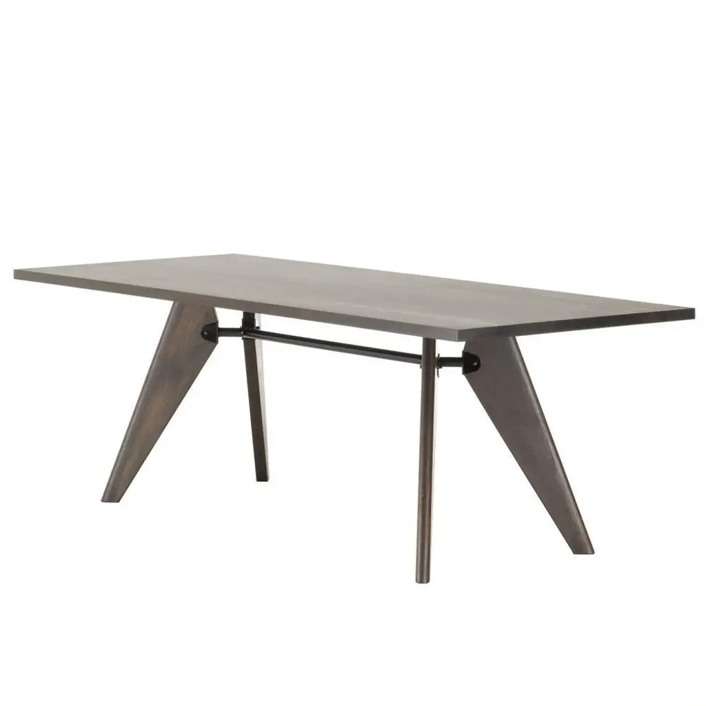 Jean Prouvé developed Table Solvay during the Second World War and due to the scarcity of metal at that time, he designed the elegant piece with wooden legs. The solid wood components in a choice of natural oak, dark smoked oak or American walnut lend the table a sense of ease and refinement.