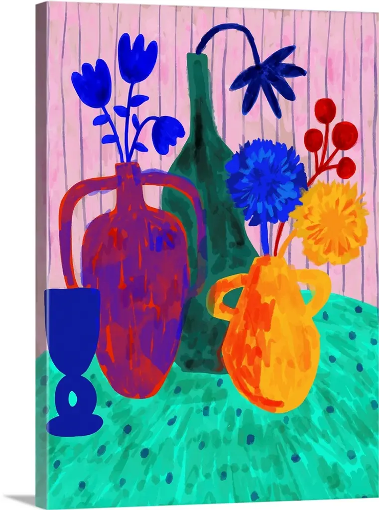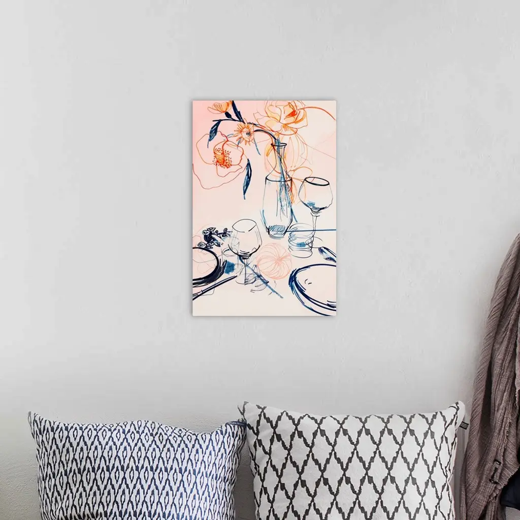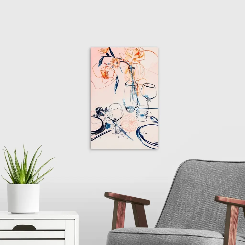 Simple outlines of a dinner table originally drawn with a blue marker on cream paper with pastel peach brushstrokes of gouache.