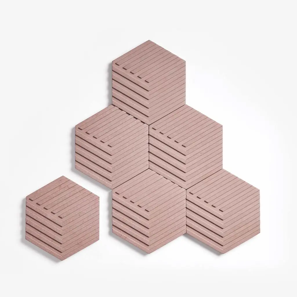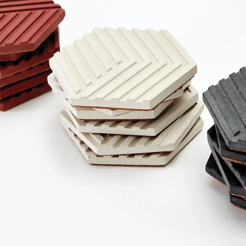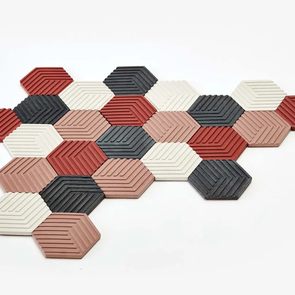 This set of six coasters can be artfully arranged to form a tiled trivet. The illusion of 3D through color and geometry allows for endless permutations, encouraging playful mosaic building on your table. Ideal as a housewarming gift for those with discerning taste or as decoration for your own intimate gatherings. The bundle includes 24 Table Tiles.