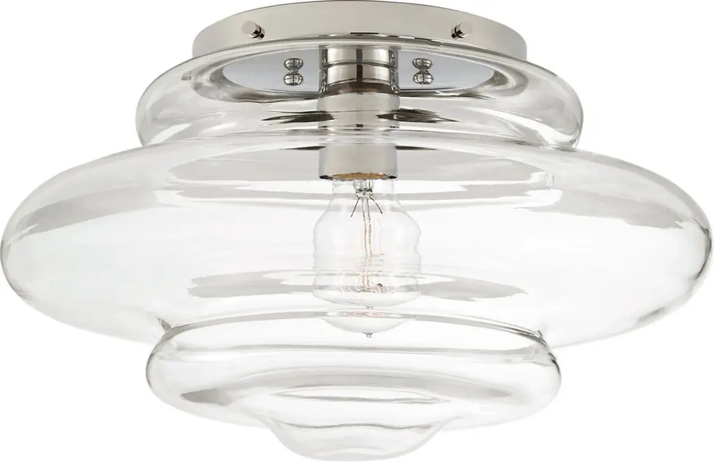 Defined by its signature glass shade with undulating, circular lines, the Tableau series embodies modern classic design. Mixing metal with clear or textured volcanic glass, these unique forms create elegant flush mounts and sconces that are ideal for any space. The Tableau Medium Flush Mount offers a sophisticated touch, seamlessly blending into various interiors while providing a refined aesthetic.