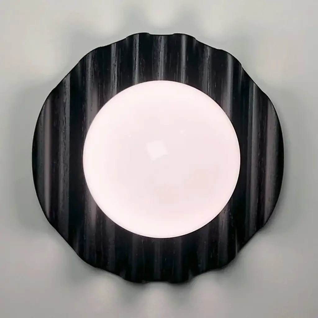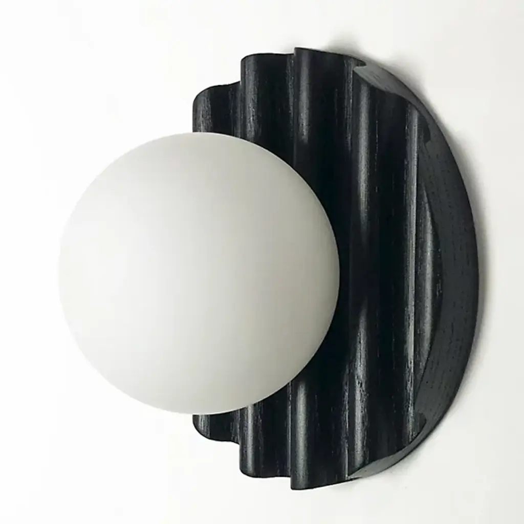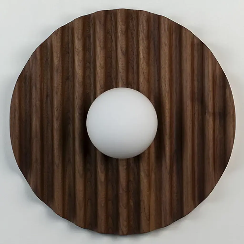 Provide balanced, broad appeal to indoor walls with the subtle lines of the Tablet Ripple Wall Sconce from Tomnuk Design. An iconic, contoured design from the innovative mind of Jordan Tomnuk. It starts with a round, wooden wall plate enriched with curving vertical contours, setting strong lamping beneath a round glass shade. Elegant and ADA-compliant, the translucent shade medium cuts glare, transforming it into a warm wash of light that splashes out to the sides, enriching the sculptural construction of the sconce memorably.