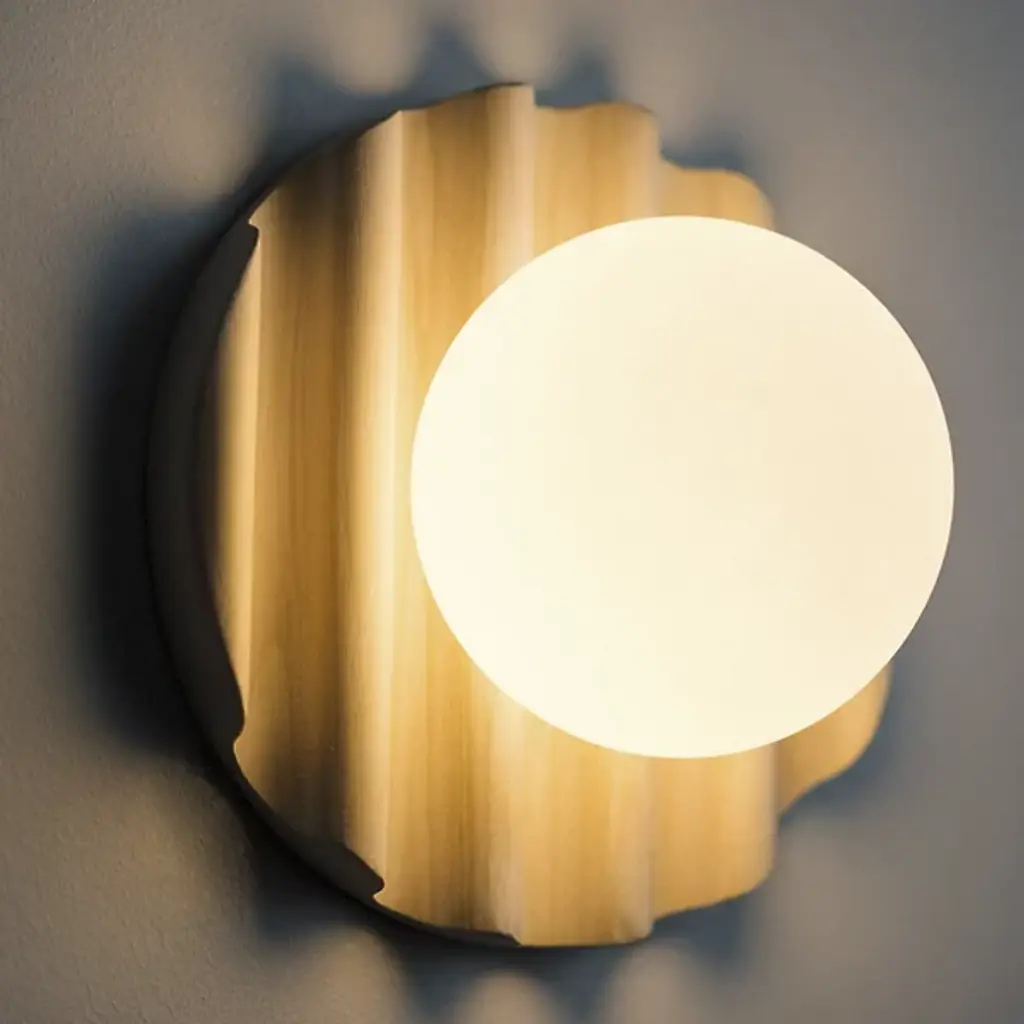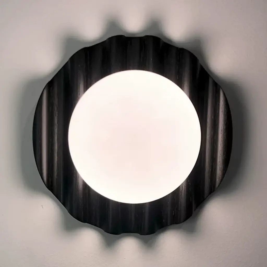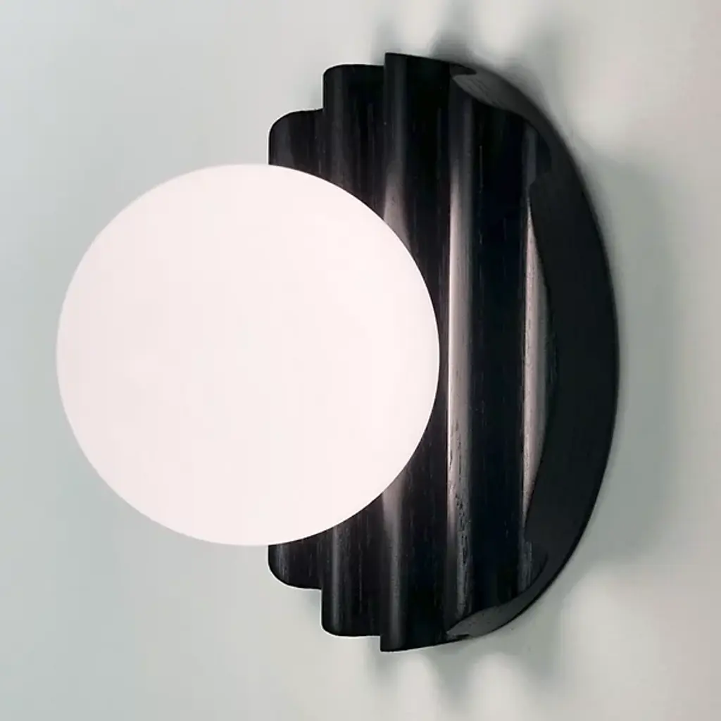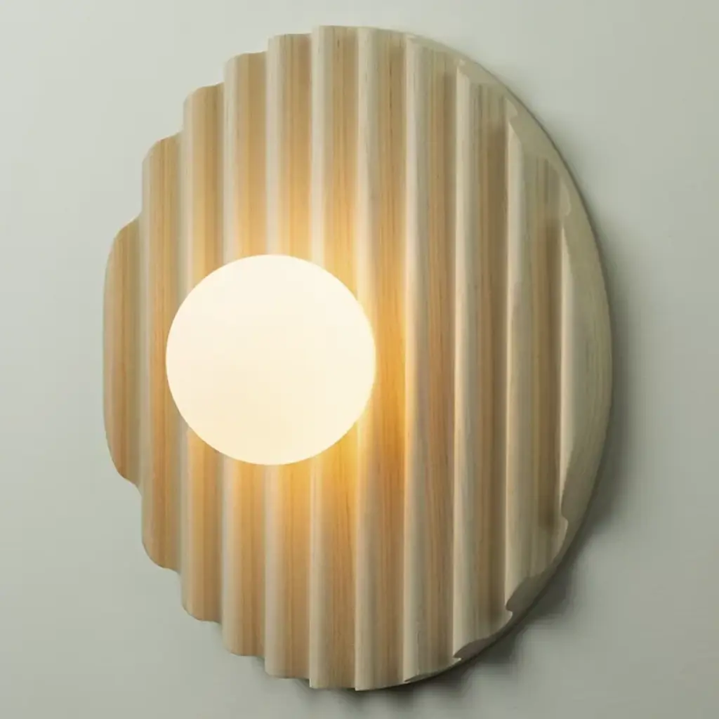 Provide balanced, broad appeal to indoor walls with the subtle lines of the Tablet Ripple Wall Sconce from Tomnuk Design. An iconic, contoured design from the innovative mind of Jordan Tomnuk. It starts with a round, wooden wall plate enriched with curving vertical contours, setting strong lamping beneath a round glass shade. Elegant and ADA-compliant, the translucent shade medium cuts glare, transforming it into a warm wash of light that splashes out to the sides, enriching the sculptural construction of the sconce memorably.