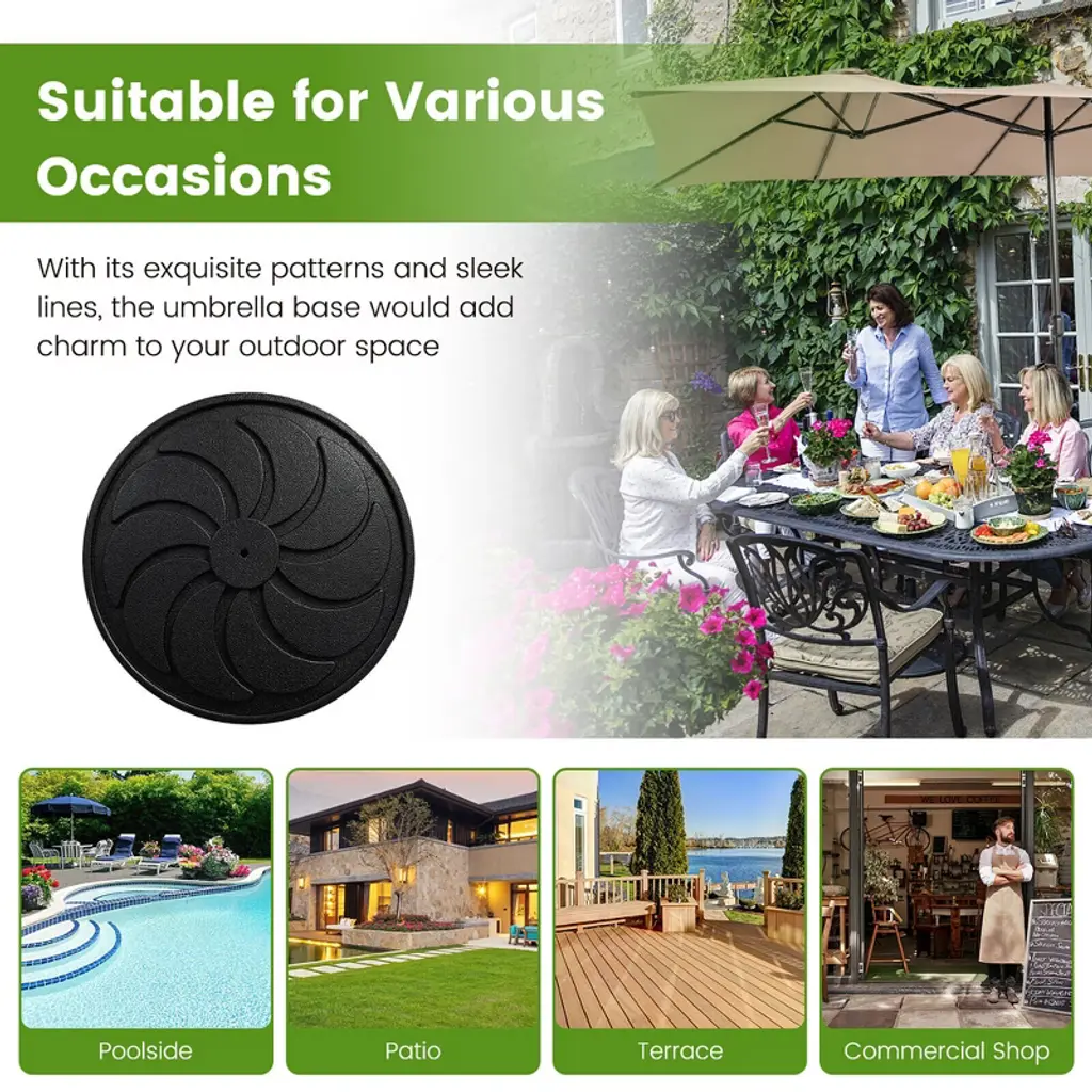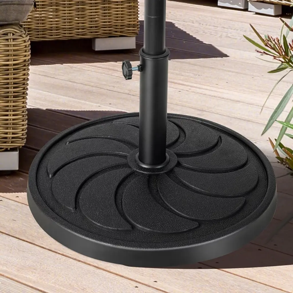 Our 21.5" round weighted umbrella base weighs 40 lbs, providing solid support for your outdoor umbrella. And designed with 2 adapters of 1.5" and 1.9" diameter, the umbrella stand is suitable for most 9 ft market umbrellas and patio table umbrellas. More than that, our heavy-duty umbrella stand is made of premium resin material, which can endure outdoor environments without aging or fading, ensuring long-lasting durability. And with its exquisite pattern and classic black colors, this weighted umbrella base goes well with any decor theme.FeaturesMade of high-strength resin material, waterproof, aging-resistant, long-lasting enough The powder-coated metal supporting pole is rustproof and sturdy enough Equipped with 2 adapters, suitable for most patio umbrellas with 1.5"/1.9" pole diametersSpecifications:Color: Black Material: Resin, Metal Overall Dimensions: 21.5" x 13.5" (Dia. x H) Suitable Umbrella Pole Diameter: 1.5"/1.9" Suitable Umbrella Size: 9 ft Net Weight: 40 lbs Package Includes: 1 x Resin Umbrella Base 1 x User's Manual