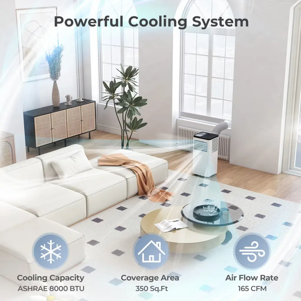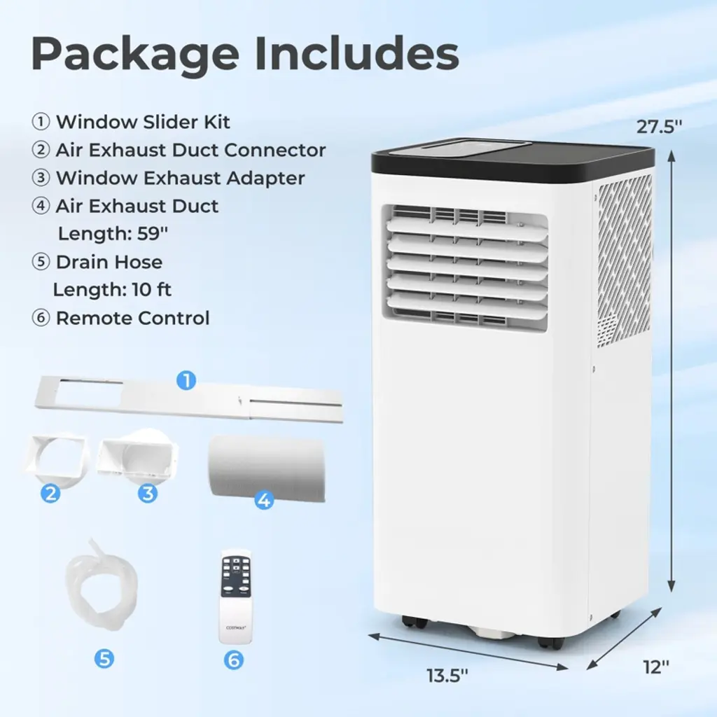 Enjoy coolness and comfort in hot days with our portable air conditioner! There are 3 modes for you to choose, including cooling, dehumidifier, and fan. With 8000 BTU cooling capacity, this portable air conditioner cools your room down quickly. Moreover, 4 rolling wheels help you easily move it from the living room to the bedroom. The AC unit is super easy to operate with control panel and remote control. Thanks to the sleep mode and 24H timer, the AC unit offers you a peaceful sleep environment. Additionally, the drain holes and plugs ensure simple drainage. More importantly, it is designed with R32 refrigerant and 6.2 CEER, which ensures low energy consumption. The energy-saving air conditioner comes with window kit and detailed user manual to make assembly a breeze.Features3 modes & 2 speeds for year-round comfort 8000 BTU cooling capacity makes it quick to cool Able to cool rooms up to 350 sq. FtSpecifications:Color: White Material: ABS Product Dimensions: 13.5" x 12" x 27.5" (W x D x H) Cooling Capacity (ASHRAE): 8000 BTU Cooling Capacity (SACC): 5000 BTU Power Supply: 115V/60Hz Total Current: 6.8A Air Flow Rate: 165 CFM/ 280 m3/h Coverage Area: 350 sq.ft Dehumidifying Capacity: 38 Pints/Day Temperature Setting Range: 62-86℉ Refrigerant: R32 CEER: 6.2 Noise Level: 51dB Applicable Window Width/Height: 36"-49" Length of Exhaust Hose: 59" Diameter of Exhaust Hose: 6" Length of Drain Hose: 10 ft Diameter of Drain Hose: 0.6" Length of Power Cord: 5.8 ft Max Remote Control Distance: 16.5 ft Net Weight: 43 lbs Package Includes: 1 x Portable AC Unit 1 x Window Slider Kit 1 x Air Exhaust Duct 1 x Window Exhaust Adapter 1 x Air Exhaust Duct Connector 1 x Drain Hose 1 x Remote Control 1 x User Guide