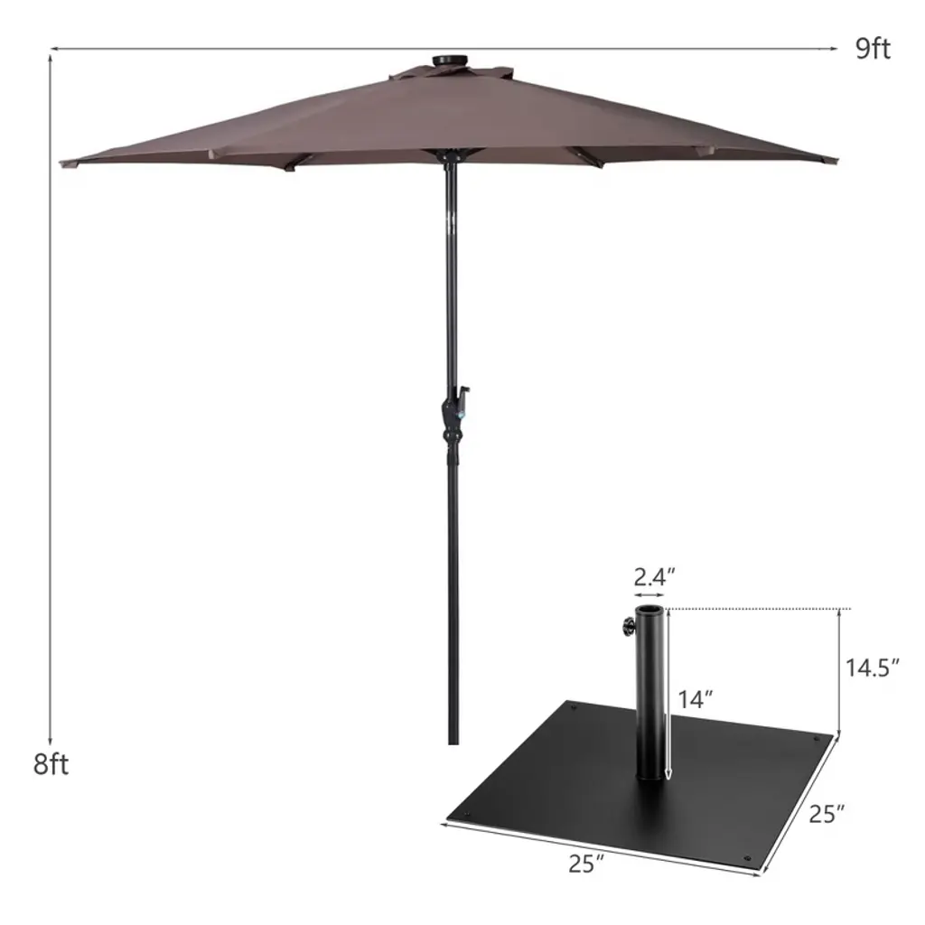 This is our 9ft patio umbrella with lights, which can provide all-day shade enjoyment and create a warm atmosphere at night. Made of high-quality polyester cloth and supported by a steel pole and 6 sturdy ribs, our patio umbrella can withstand long-term outdoor use. You can open and close the umbrella effortlessly thanks to its handle crank. And push-button tilting system allows you to adjust the angle of the canopy to block the sun all day long. In addition, with 18 solar lights, this patio umbrella can provide perfect lighting at night. The square umbrella base with 40 lbs weight can hold your umbrella securely in place. Enjoy happy outdoor time under our lighted patio umbrella with your family and friends!FeaturesWith 18 solar powered LED lights to illuminate your outdoor living space at night Provides better air circulation with wind vent on the top Equipped with a 40 lbs umbrella base to keep it stableSpecifications:Material: Polyester Cloth + Steel Color: Beige / Red / Tan / Blue / Orange Size of Umbrella: 9' x 8' (Dia x H) Size of Umbrella Stand: 25" x 25" x 15" (L x W x H) Pole Size of Umbrella: 1.5" (Dia) Pole Holder Size for Umbrella Stand: 1.4" / 1.5" / 1.9" Rib Number: 6 Bulb Number: 18 LED, 3 on each rib Light Type: Solar Powered Net Weight of Umbrella: 12 lbs Net Weight of Umbrella Stand: 40 lbs Package Includes: 1 x Patio Umbrella 1 x Umbrella Stand 1 x Solar Panel 1 x User Guide