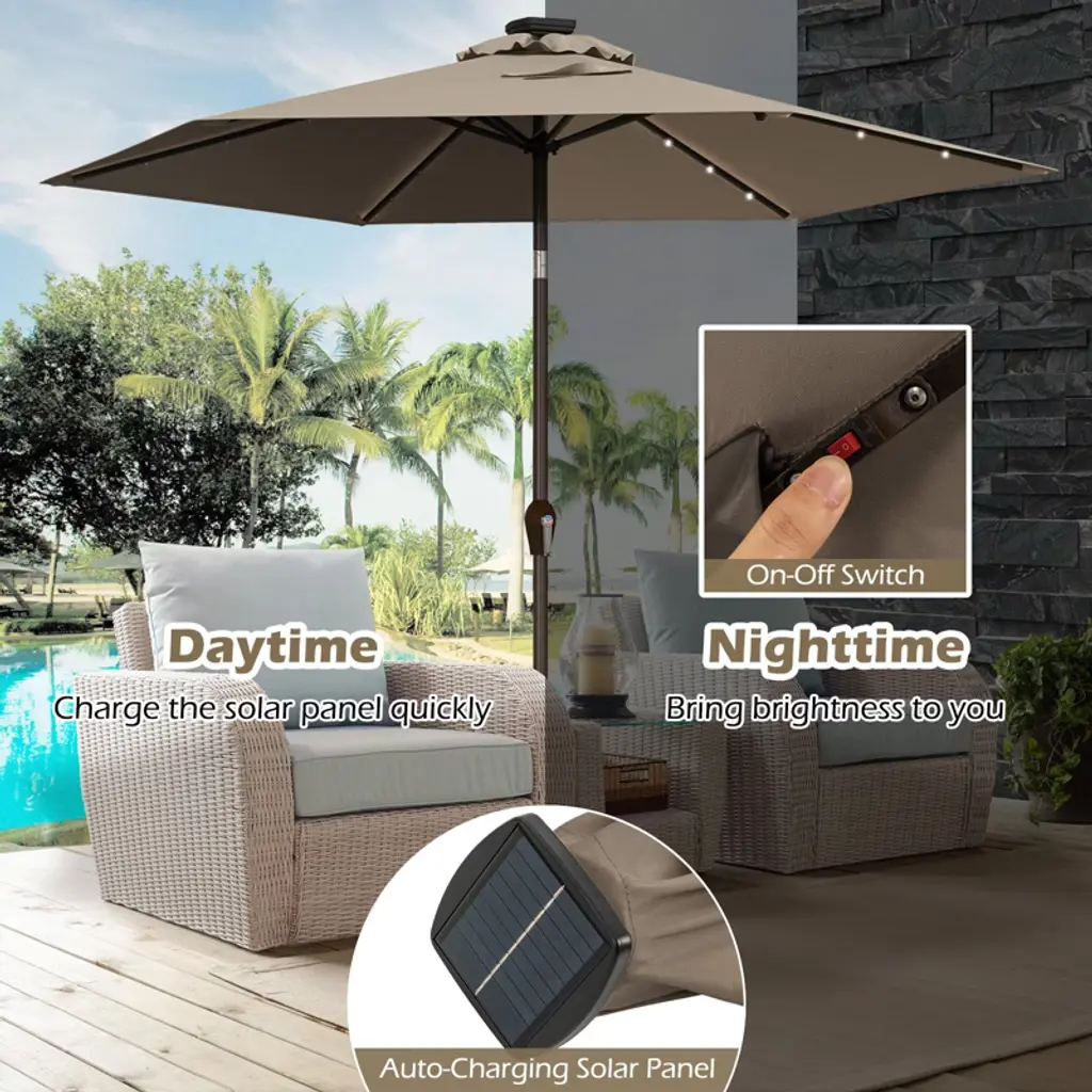 Tangkula 9 Ft Patio Table Market Umbrella W/ 18 Solar Led Lights & Heavy-duty Base Tan