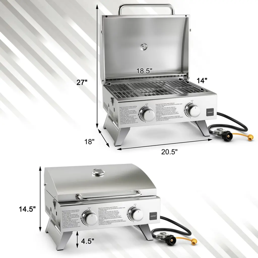 Ignite flavor with our portable tabletop gas grill! This grill boasts 2 powerful 10,000 BTU burners for efficient heating, with a lid and integrated thermometer for precise heat control. The push-and-turn ignition system ensures easy and safe ignition. Crafted from stainless steel, this grill is easy to transport with its convenient handle and foldable legs. Perfect for various foods and activities, with detailed instructions for quick assembly. Features2 10000 BTU burners for fast and efficient heatingTop lid helps to achieve heat circulationBuilt-in thermometer for precise flame controlThe flexible knob controls the flame of 2 separate burners Regulator hose with gas connector to connect a 20 lbs propane cylinder (not included)Locking latches for safe useRemovable grill grate and grease tray for easy cleaningSpecifications: Color: Silver Material: Stainless Steel Product Dimension (With Lid Open): 20.5" x 18" x 27"(W x D x H) Overall Height (With Lid Closed): 14.5" Size of Grill Grate: 18.5" x 14" (L x W) Ground Clearance: 4.5“ Length of Regulator Hose: 2 ft Net Weight: 22 lbs Package Includes: 1 x Portable Gas Grill 1 x Grill Grate 2 x Flame Tamers 1 x Regulator Hose 1 x Instruction