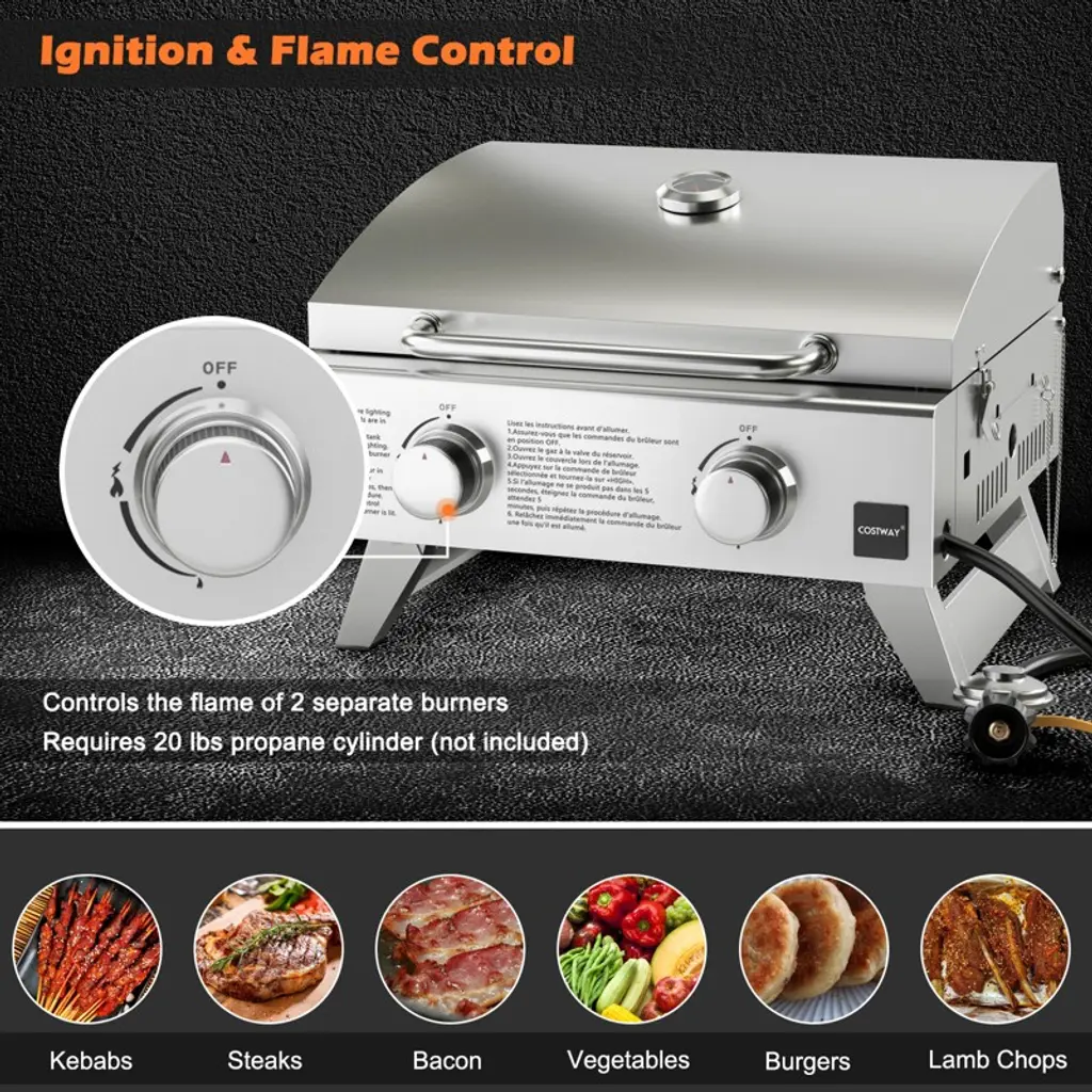 Tangkula Portable Gas Grill 20,000 Btu 2-burner Stainless Steel Propane Grill W/ Lid & Handle Top Thermometer & Extra Flame Rod