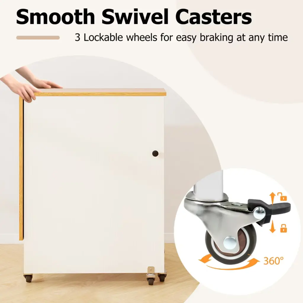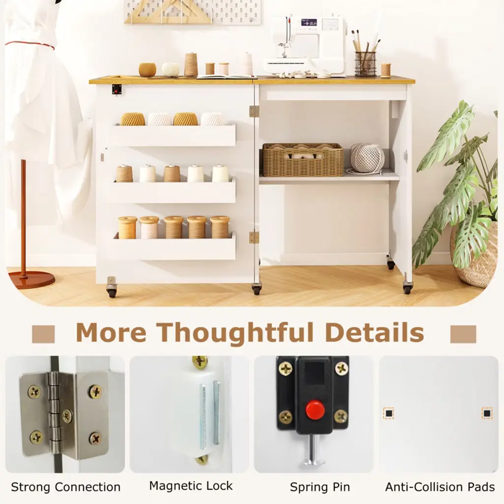 Tangkula Sewing Machine Table With Charging Station Folding Sewing Cabinet W/lockable Casters White & Natural