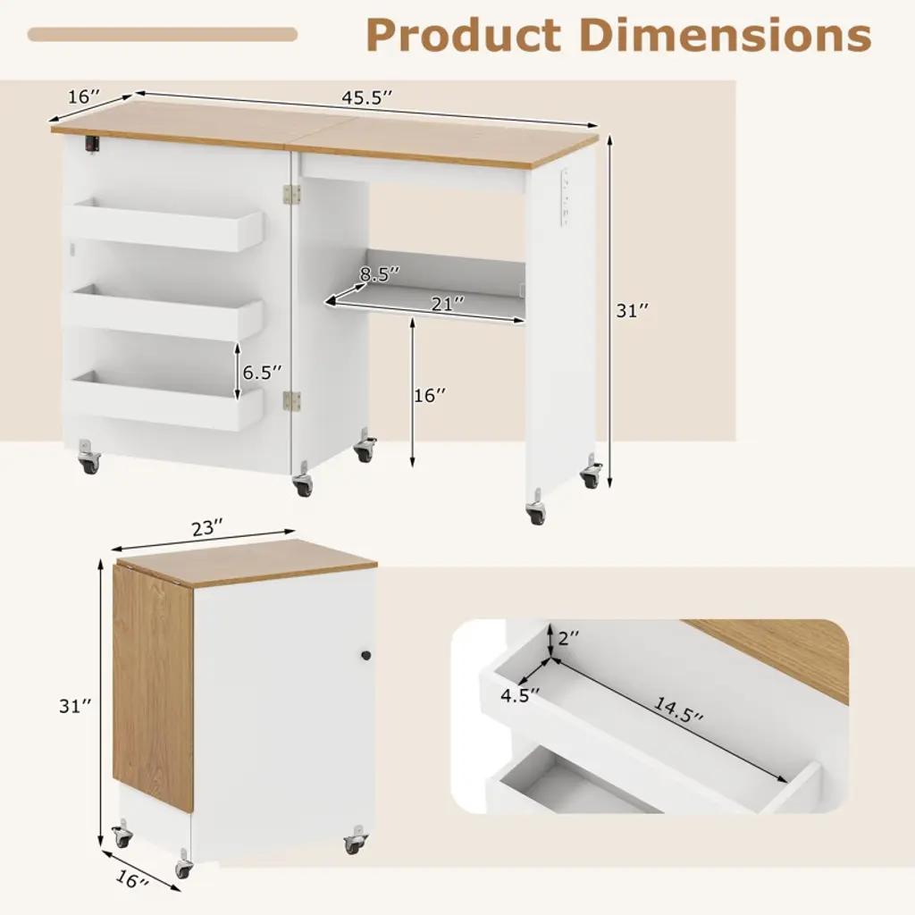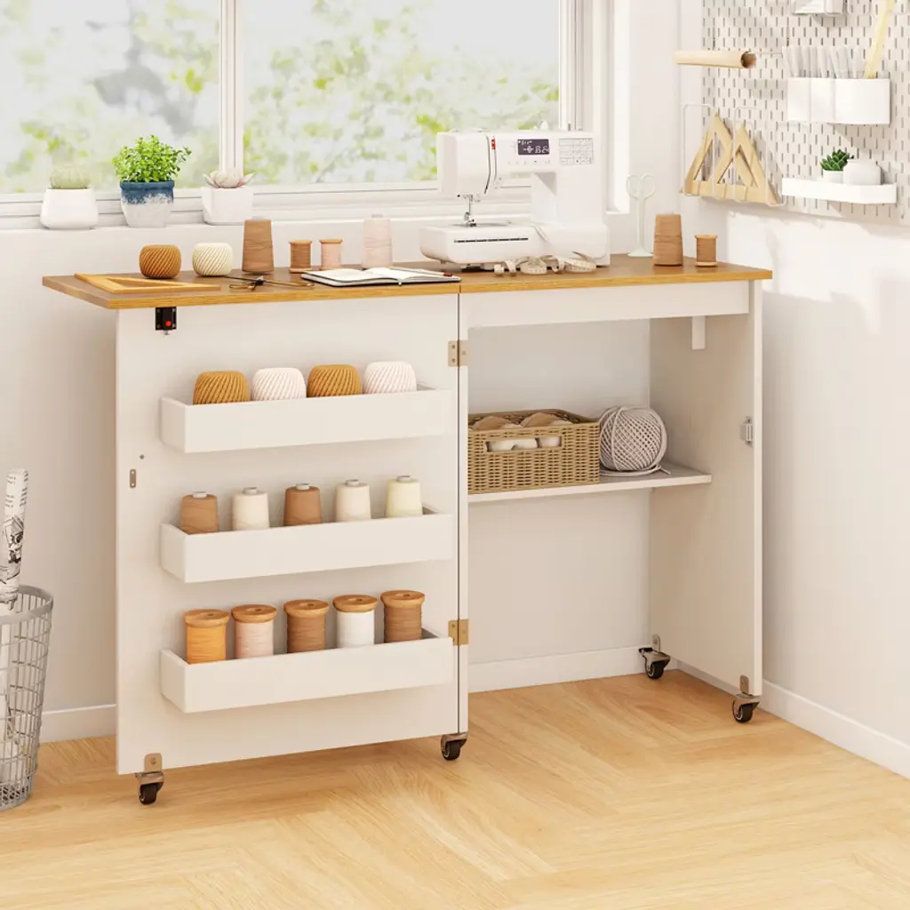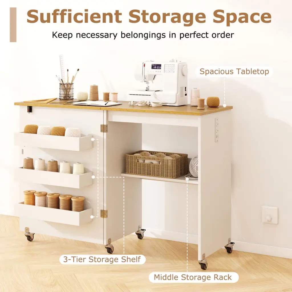 Make your sewing art even more perfect with this folding sewing desk! Equipped with a built-in charging station offering various charging options, the sewing cabinet provides ample storage space with tabletop, storage shelf and open rack. The expandable and foldable crafting table features a convenient round handle for easy transitions between its unfolded and compact states. With 5 smooth swivel casters, including 3 lockable for stability, this versatile sewing desk ensures easy mobility and quick folding, making it perfect for use as a side table, study table or computer desk.FeaturesMultifunctional folding design serves as a sewing table, side table and computer deskCarefully designed handle and spring latch make folding smootherKeep necessary belongings in perfect order with 3-tier shelf, open rack and tabletopAchieve easy mobility and secure braking with 5 smooth swivel casters (3 lockable)Built-in charging station offers 2 AC outlets, a USB and Type-C port4.8 ft power cord allows for flexible placement optionsSafety is a priority with included anti-collision padsVersatile designs suitable for home, studio and study roomSpecifications: Color: Brown/Natural/White & Natural/White Material: Engineered Wood, Metal Overall Dimensions: 45.5" x 16" x 31"/116 x 41 x 78 cm (L x W x H) Folded Dimensions: 23" x 16" x 31"/58.5 x 41 x 78 cm (L x W x H) Dimensions of Tray: 14.5" x 4.5" x 2"/37 x 11.5 x 5 cm (W x D x H) Dimensions of Open Shelf: 21" x 8.5" x 16"/53 x 22 x 40 cm (L x W x H) Power Cord Length: 4.8 ft/145 cm AC Outlet: 125V/12A USB + Type-C: 5V/2.4A Weight Capacity of Fixed Tabletop: 45 lbs/20 kg Weight Capacity of Folding Part: 45 lbs/20 kg Weight Capacity of Shelf: 22 lbs/10 kg Net Weight: 43 lbs/19.5 kg Package Includes: 1 x Folding Sewing Table with Power Strip 1 x User Manual