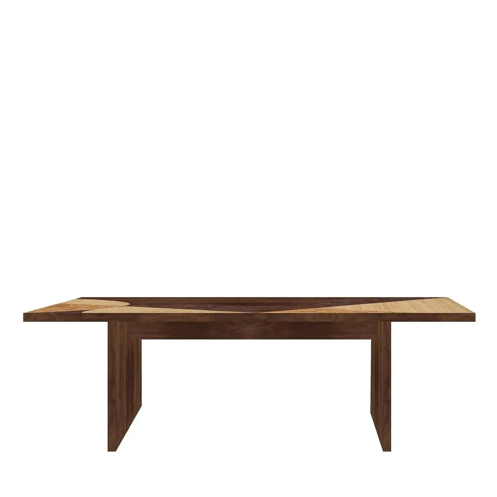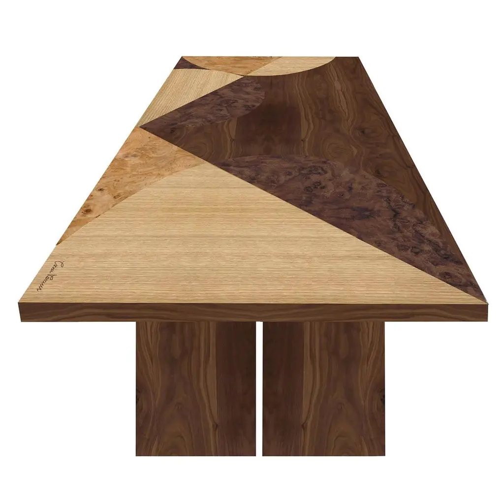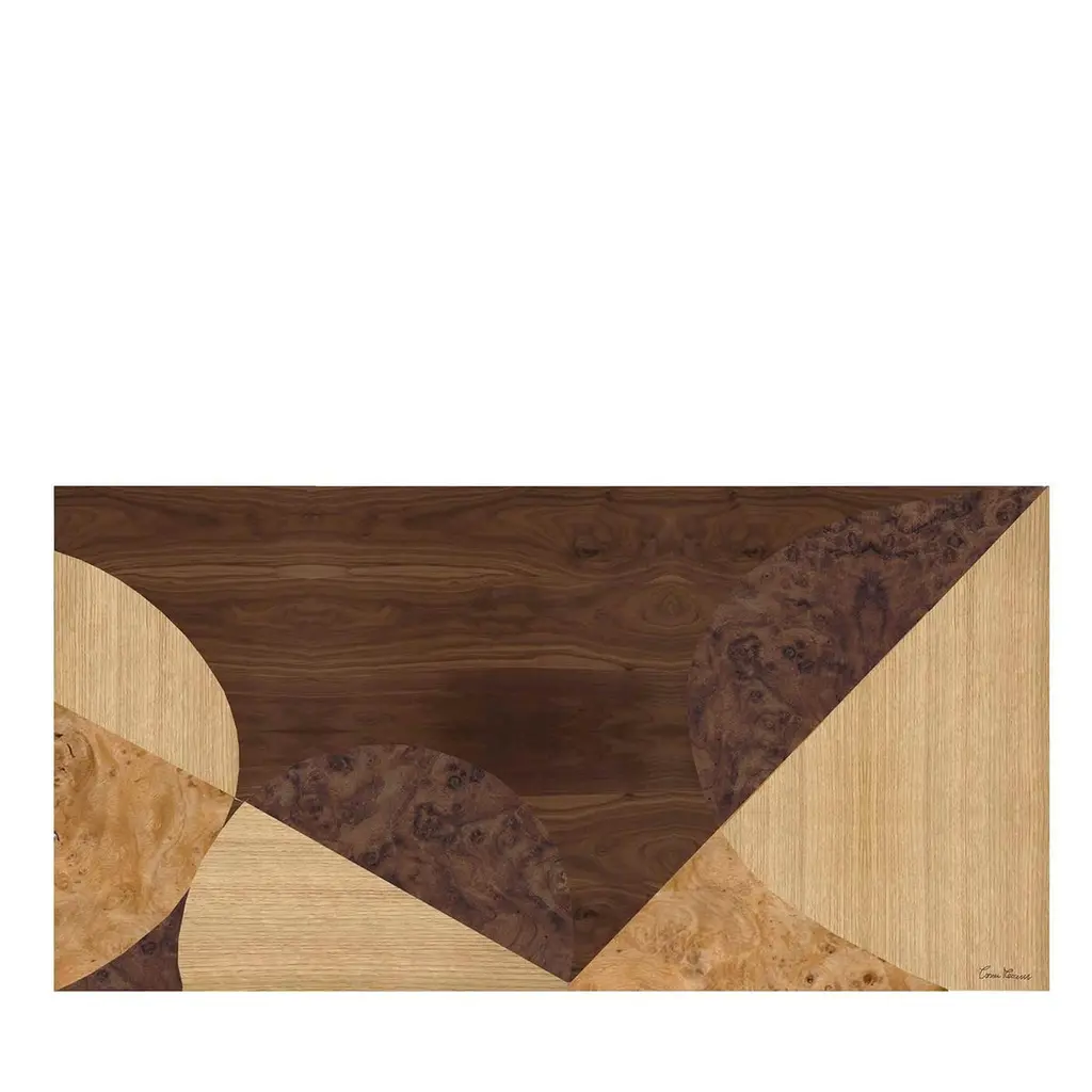 Part of the Tarsia Collection of designs inspired by ancient and minute monastery furniture, this table promises to gather people around its stunning top rich in contrasting wooden marquetries hinting at Cubism. Clean lines outline its restrained profiles, elevated by the delicate grain pattern. Signed, it is completed by a label containing the date of manufacture.