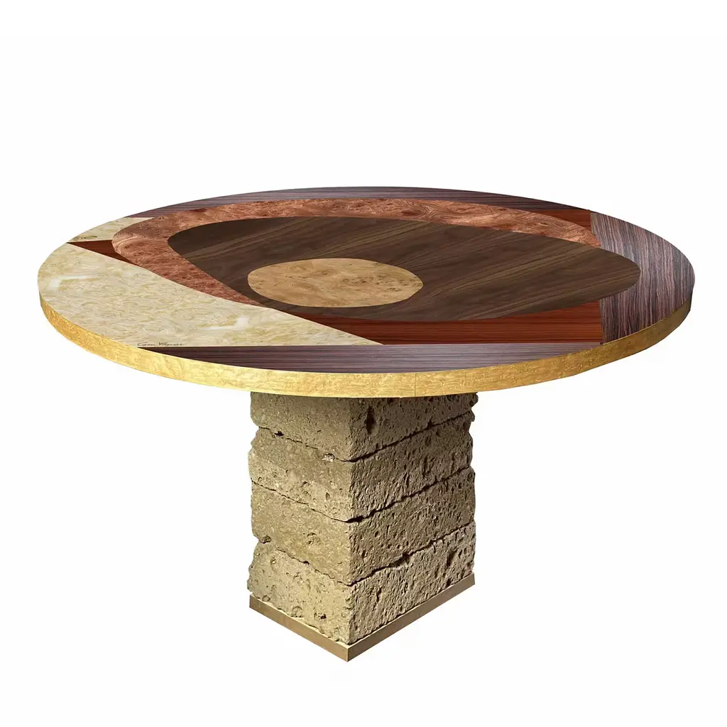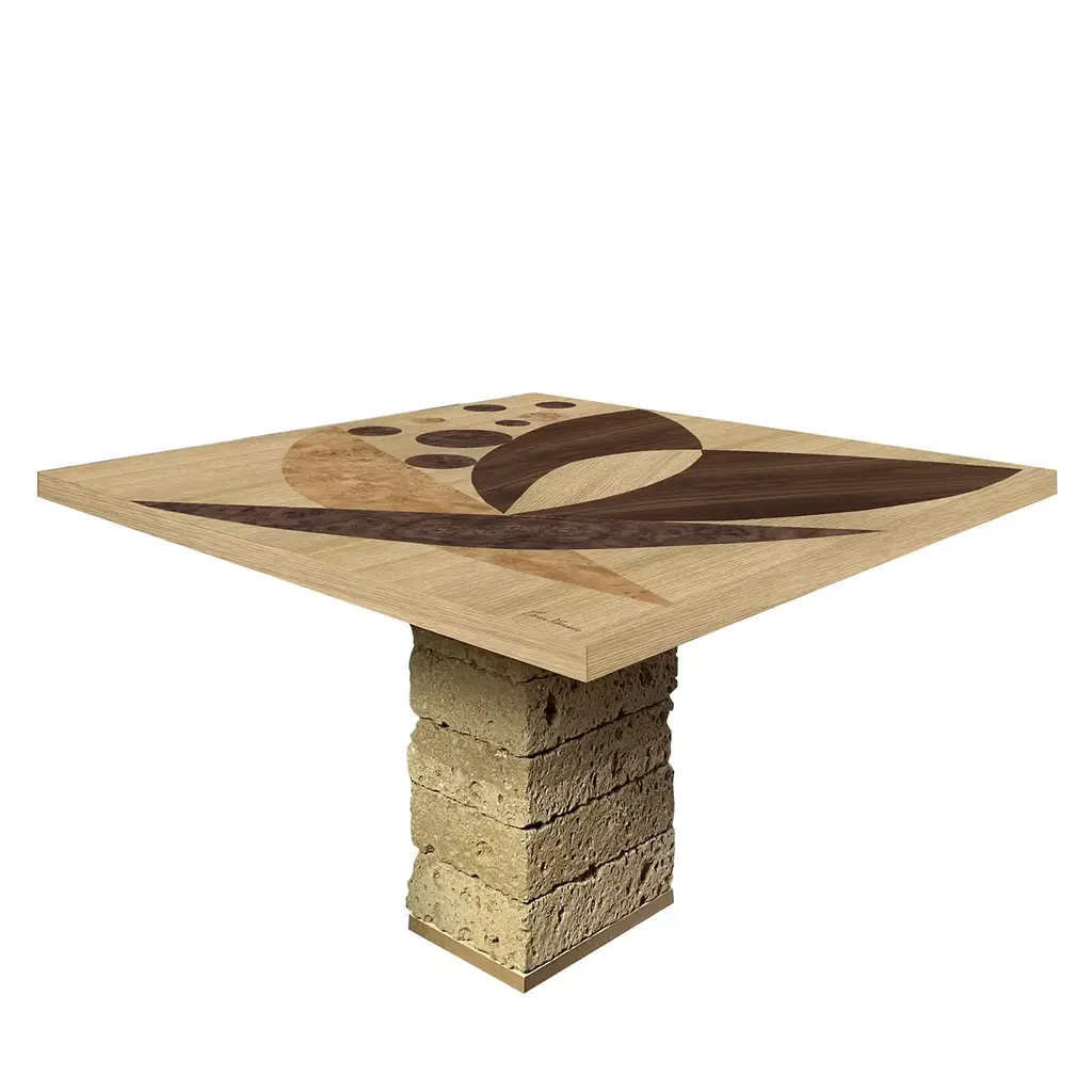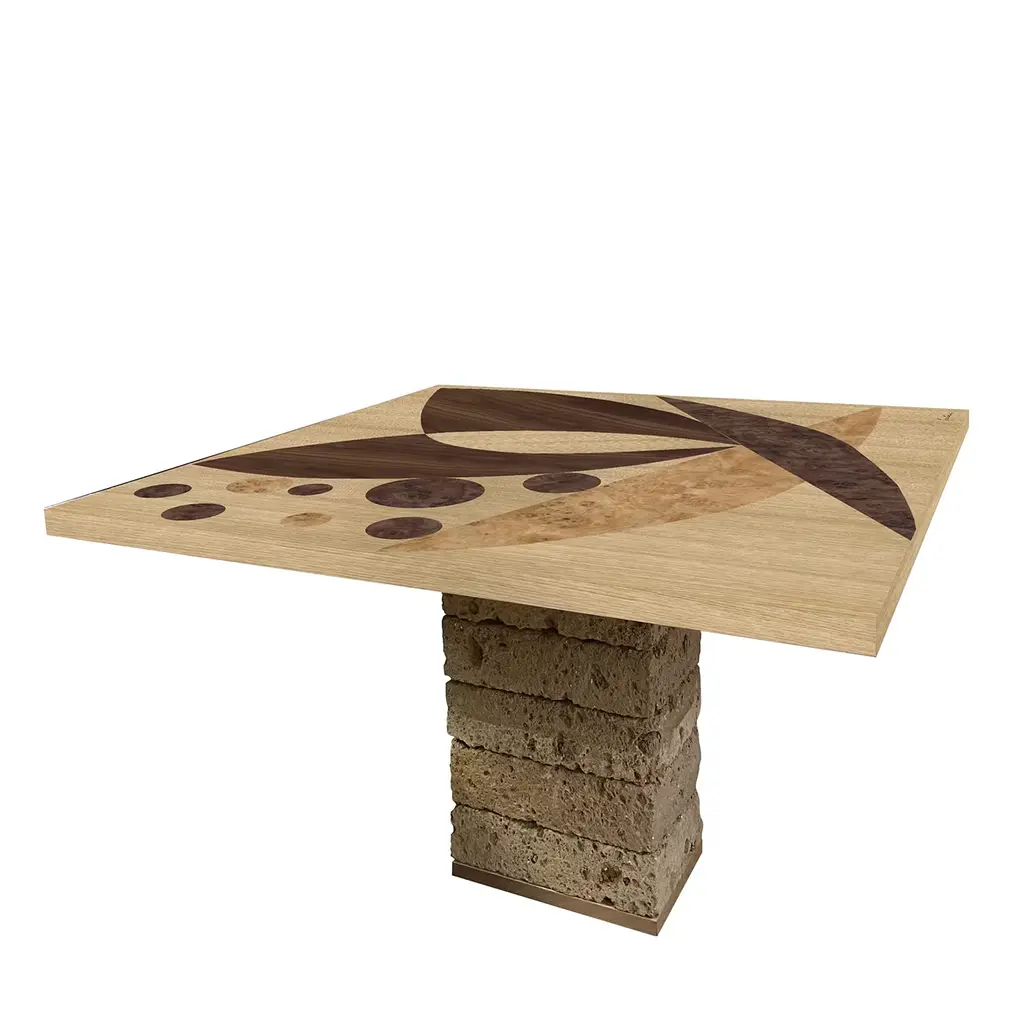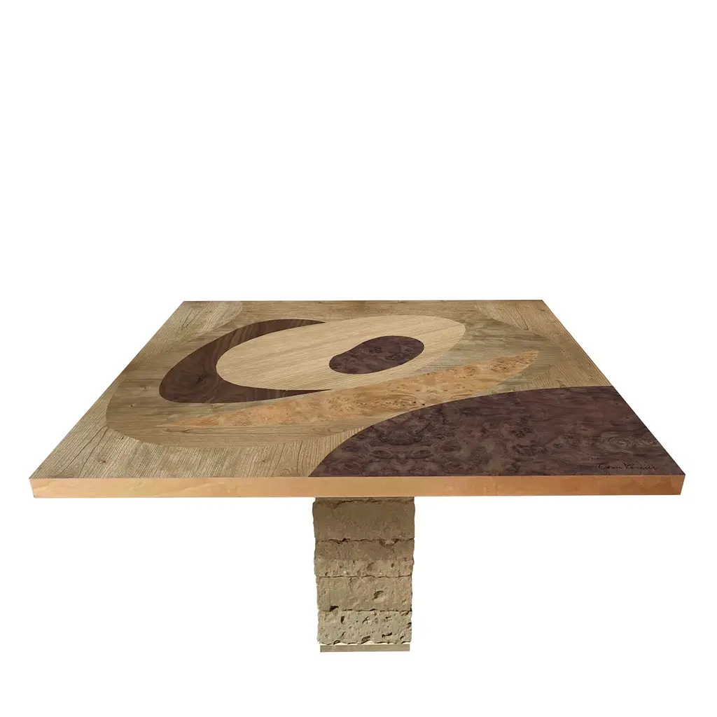 This singular square table from the Tarsia Tables Collection inspired by ancient monastery furniture will strike with the preciousness of its contrasting marquetries. Sustained by piled tuff blocks, the bold top flaunts an inlaid pattern that hints at Cubist references while seducing with its superb wood grain. The piece comes signed and supplied with a label containing the date of manufacture.
