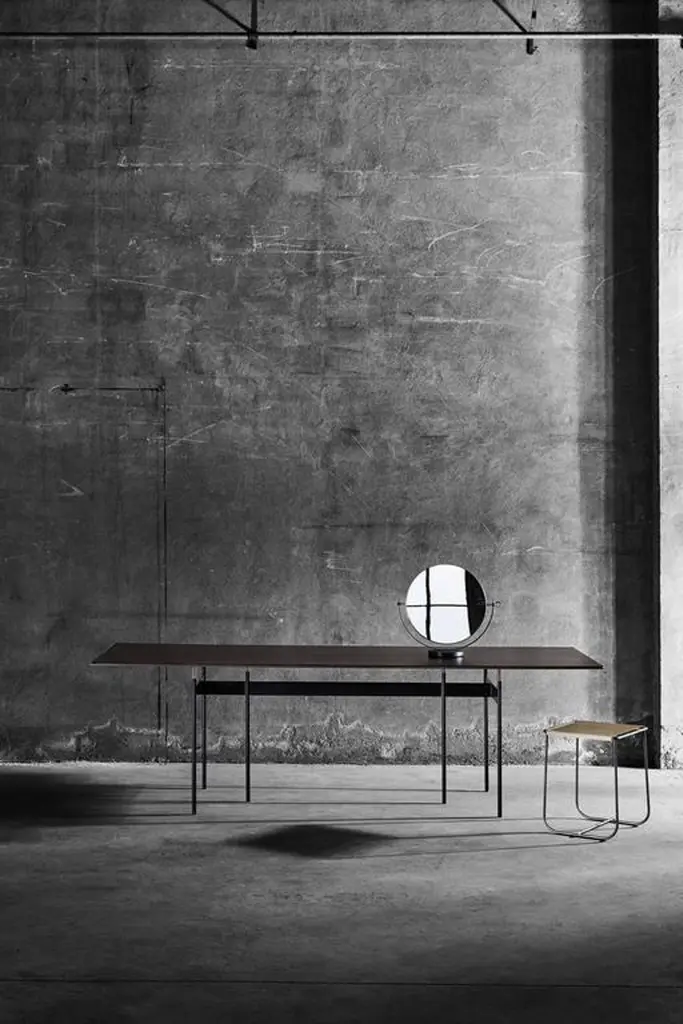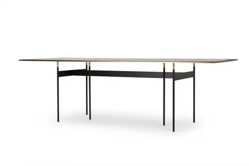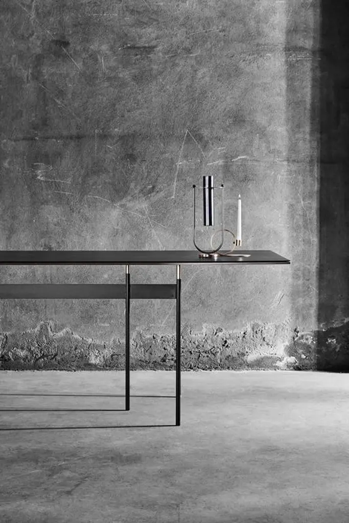 Horizontal and vertical lines cross, touch and overlap each other; this ishow they design an essential twine in space, a product made of air andmetal. Visually geometric and rigorous, Tartan exists on the balance between surfaces and voids. The thin blade of light that runs along the edge of the top claims its elegant and exclusive uniqueness. The structural elements become aesthetic, evident only after a more careful consideration.Materials: varnished black iron with brassed detailsDimensions: cm 240 x 90 x 72 H.