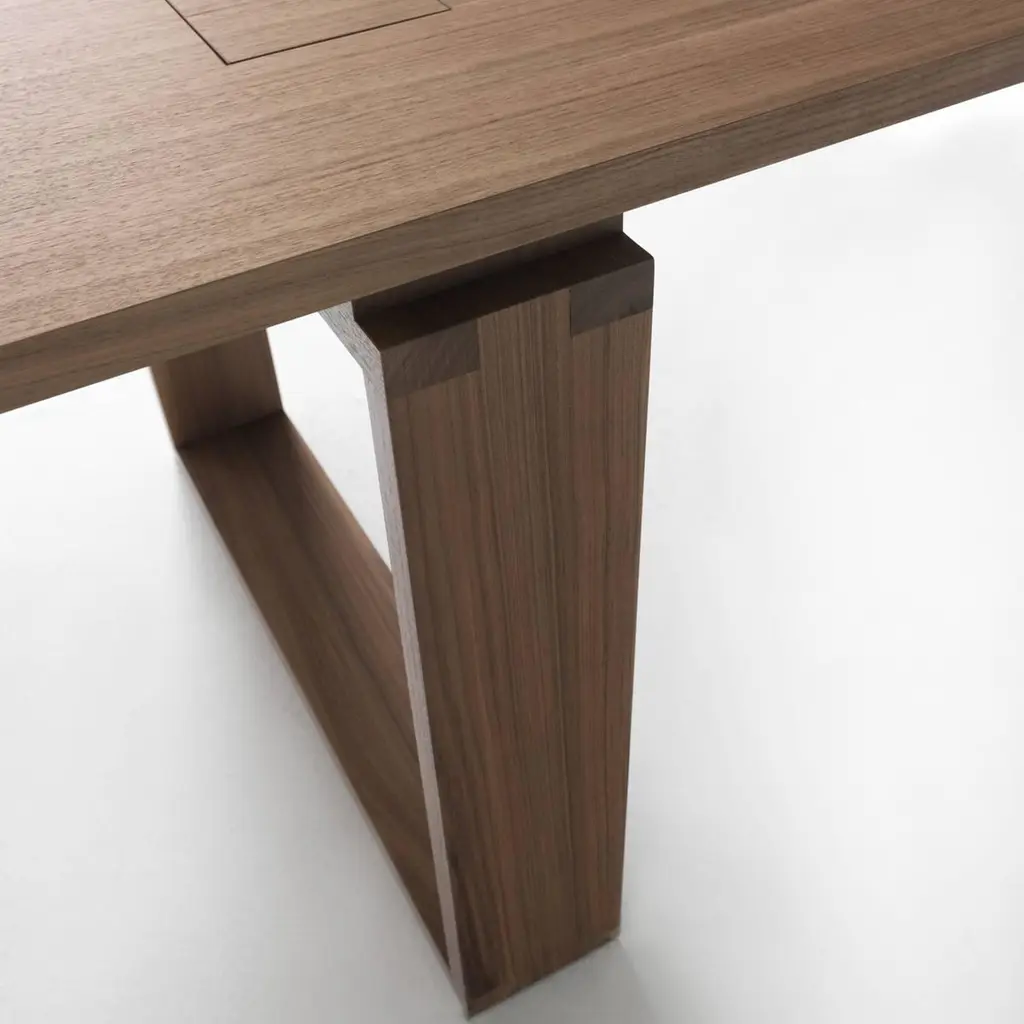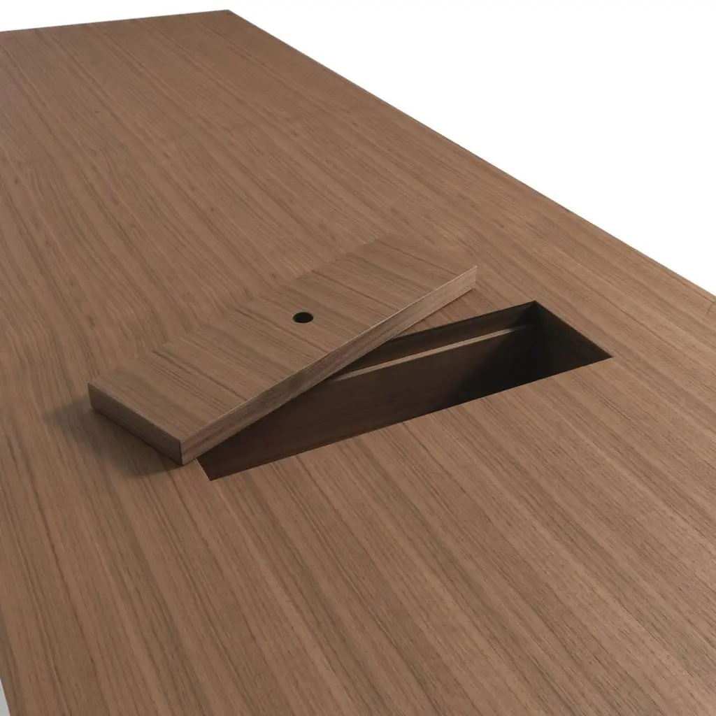 This elegant table is entirely made in "Canaletto" walnut wood. The distinctive peculiarity of this piece is the pocket that can be a used as a storage space and that is accessible by lifting its lid cut within the tabletop. The other available material for this table is oakwood.