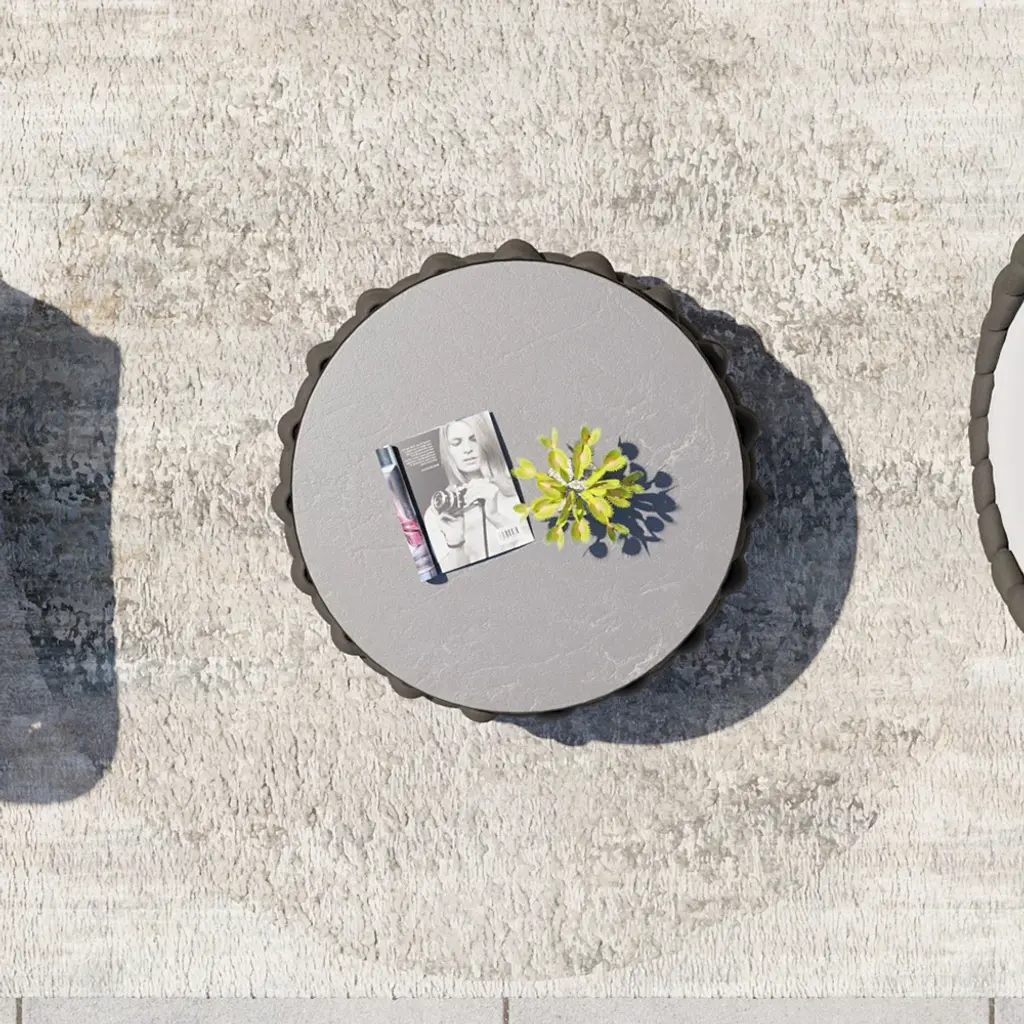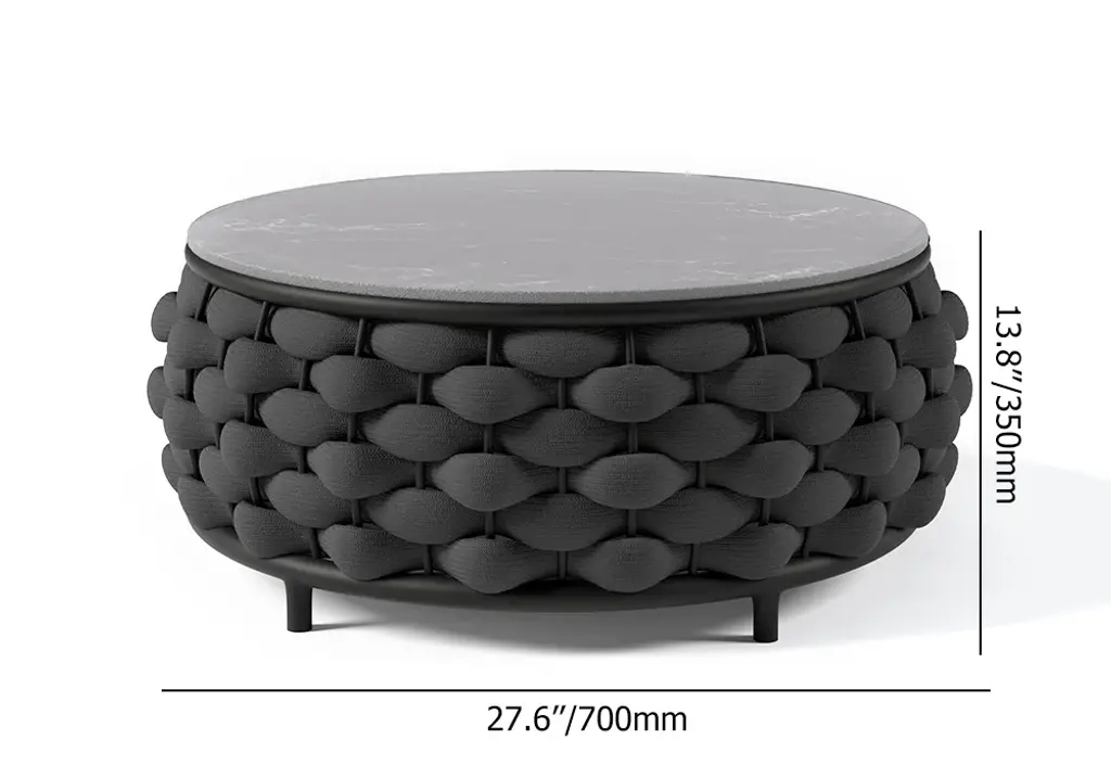 Transform your outdoor living space with this stylish and practical round coffee table. Featuring a durable HPL Board top and a woven aluminum rope base, it offers a unique visual and tactile experience. The grooved base has a smoked ash finish and amazing storage features, making it a perfect spot to enjoy a book or a cold drink.