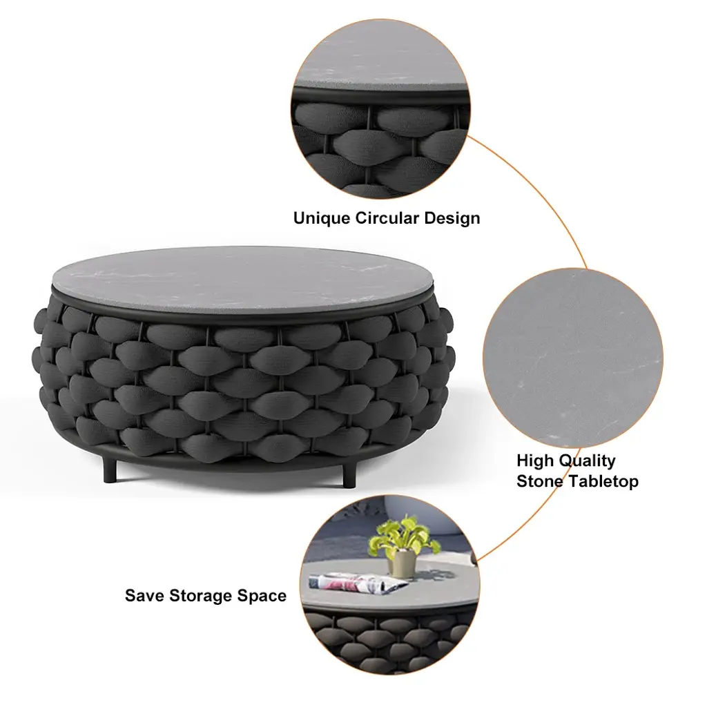 Tatta Modern Top Round Outdoor Coffee Table With Woven Rope Base & Storage In Black